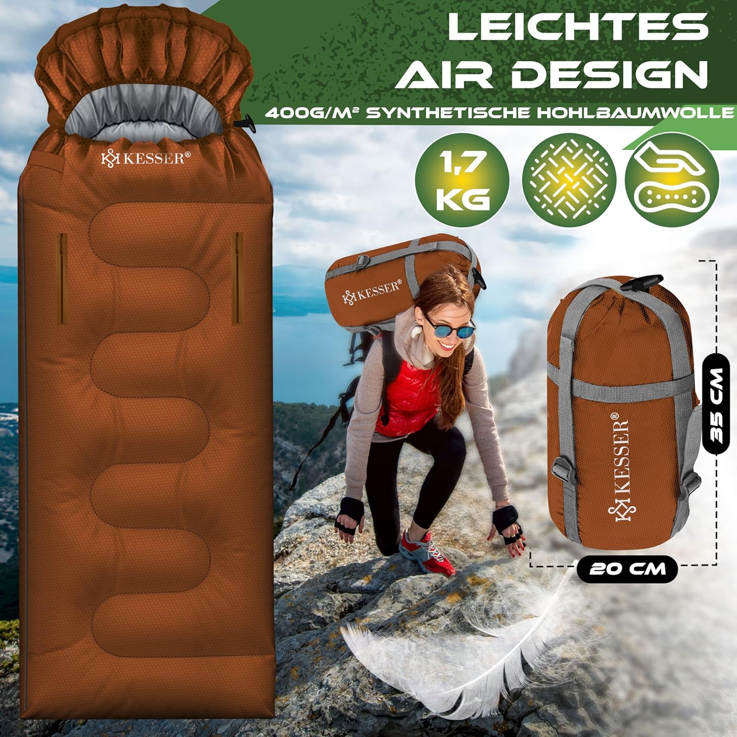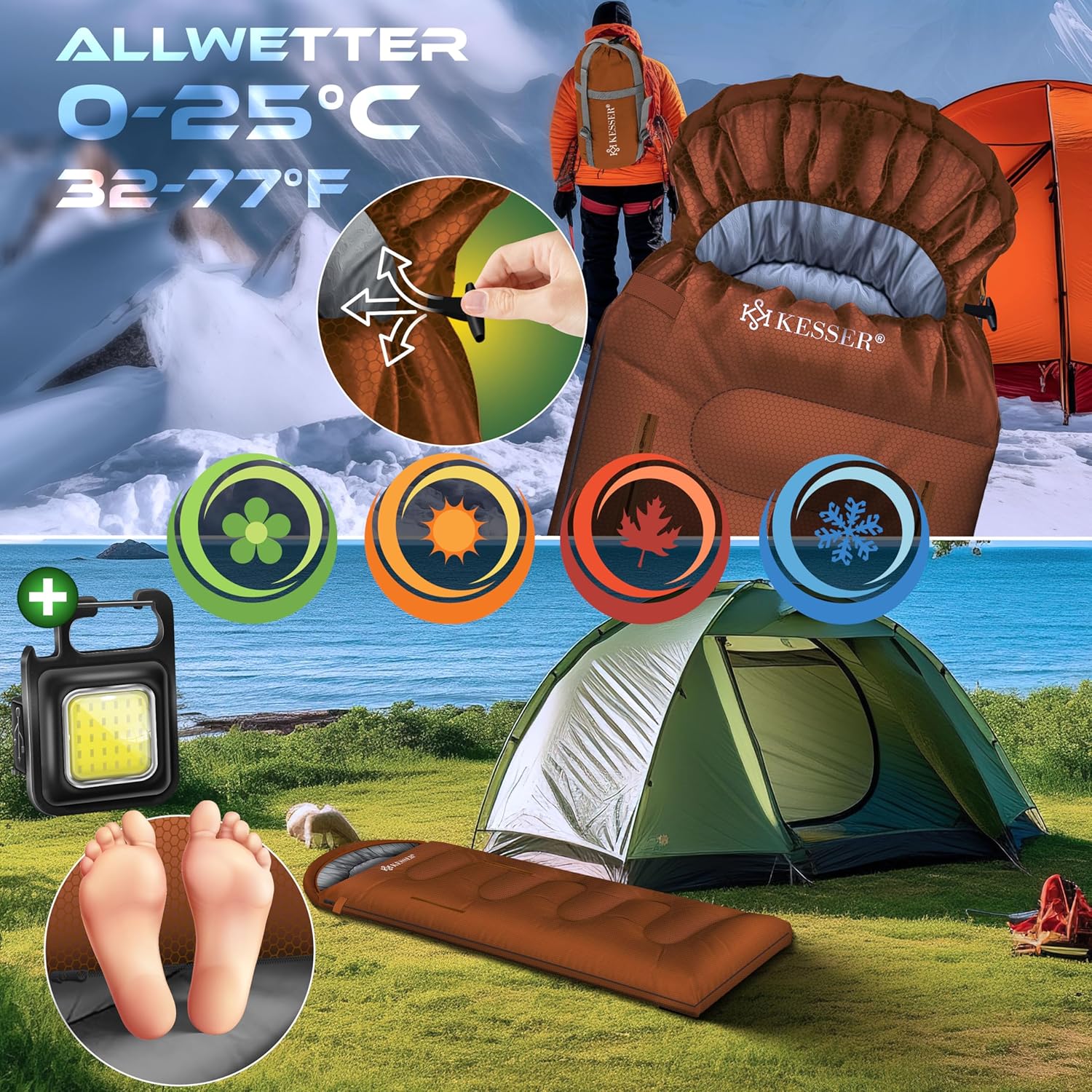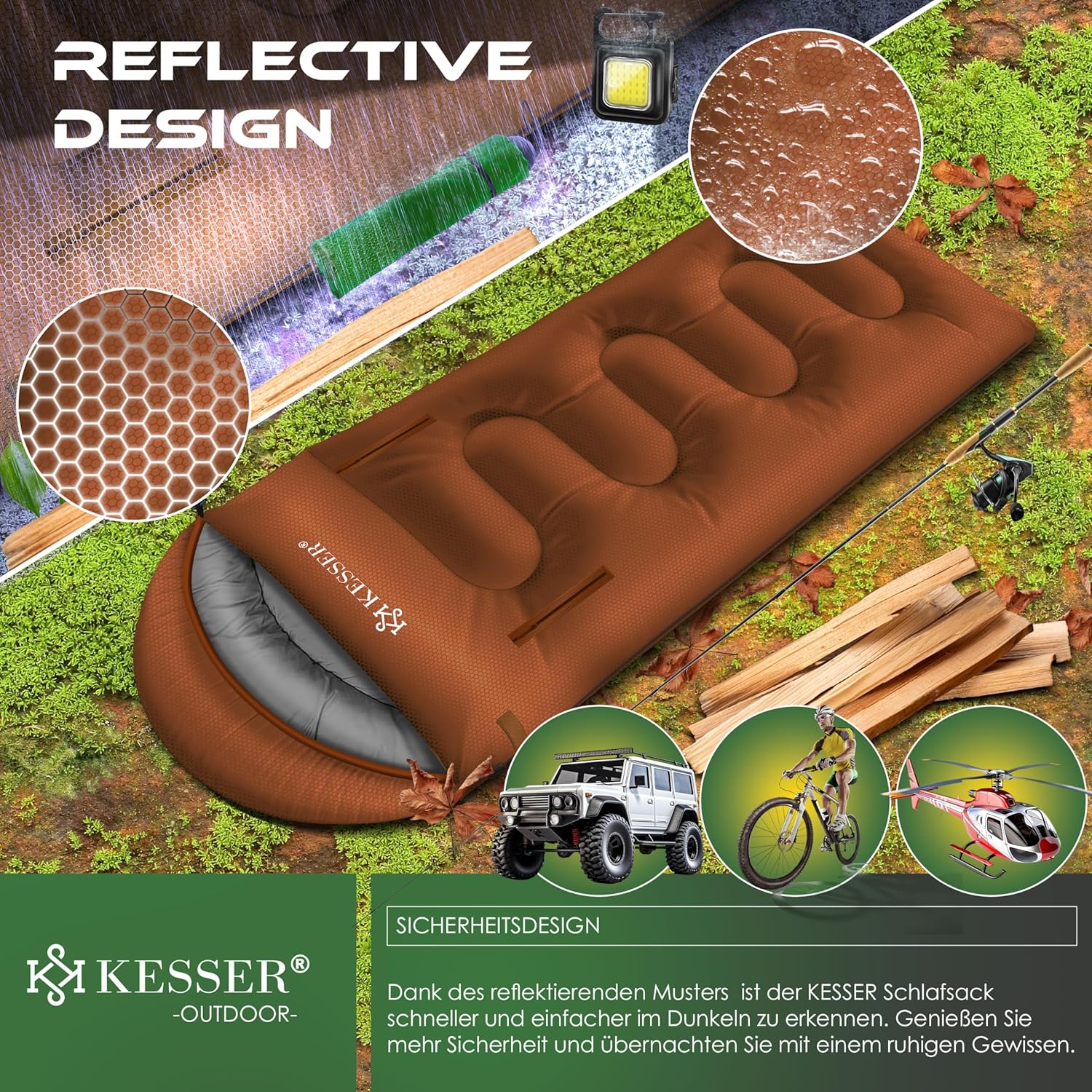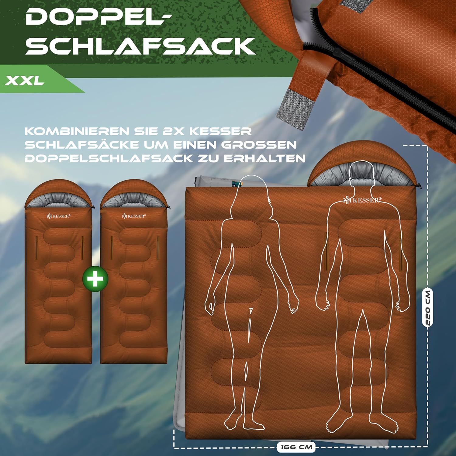 KESSER slaapzak combineert waterdichte technologie, dubbele slaapzakoptie, speciaal design, duurzaam materiaal, licht gewicht, machinewasbaar, veelzijdige gebruiksmogelijkheden, vochtbescherming en hypoallergene eigenschappen voor ultiem comfort binnen en buiten