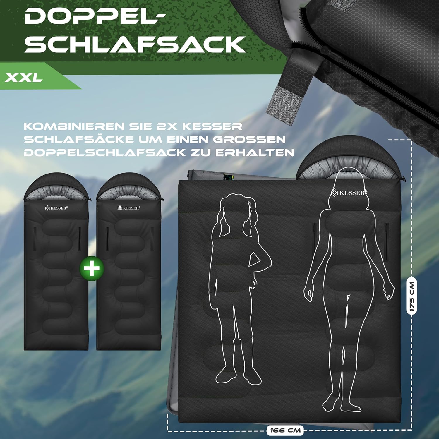Opslagsysteem: voor koppels of vrienden die graag samen kamperen, biedt de Kesser slaapzak de mogelijkheid om twee slaapzakken met elkaar te verbinden en een gezellige dubbele slaapzak te creëren. Geniet van gezamenlijke avonturen met je lievelingsmens. Met ons praktische koppelingssysteem kun je je slaapzakken in een handomdraai met elkaar verbinden en een comfortabele slaapplaats voor twee personen creëren.
