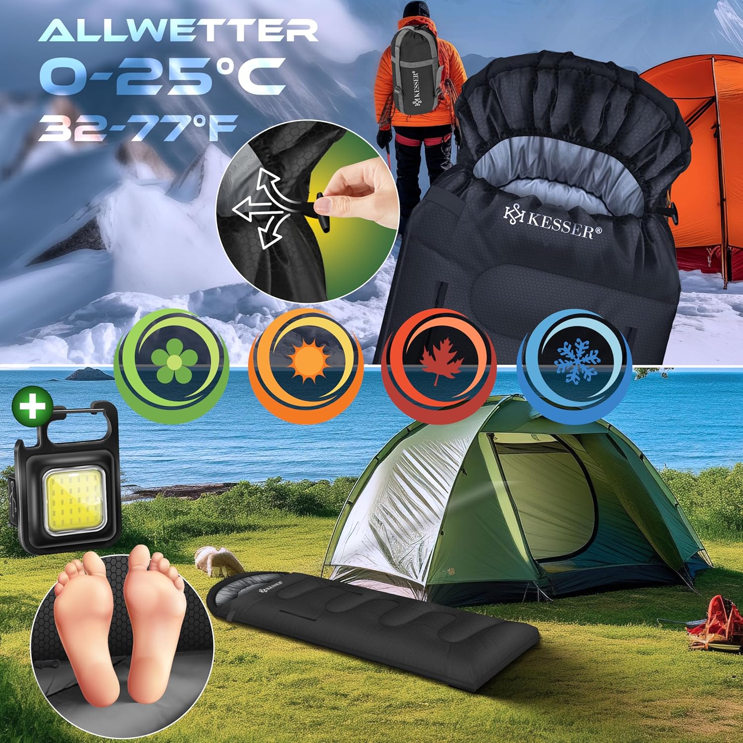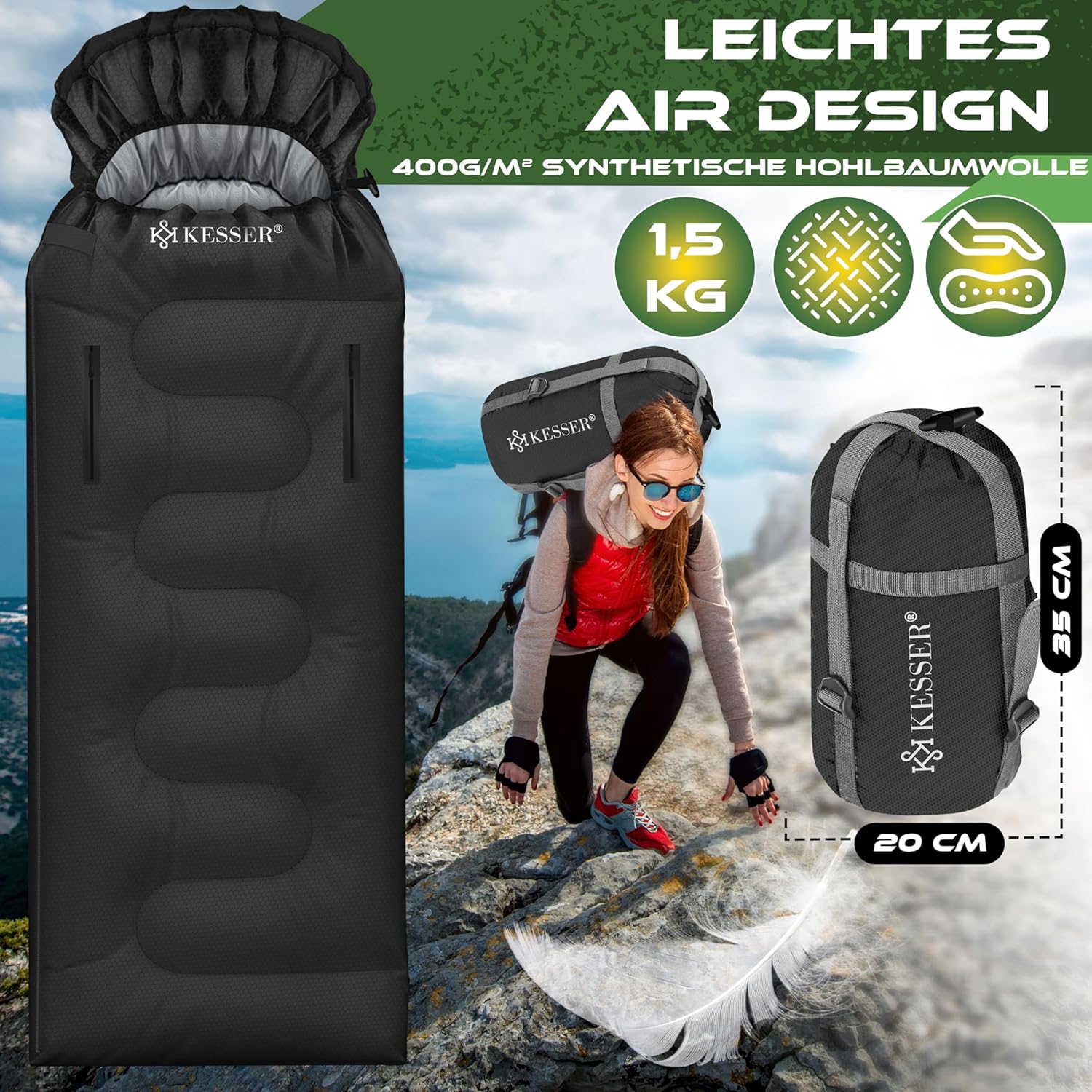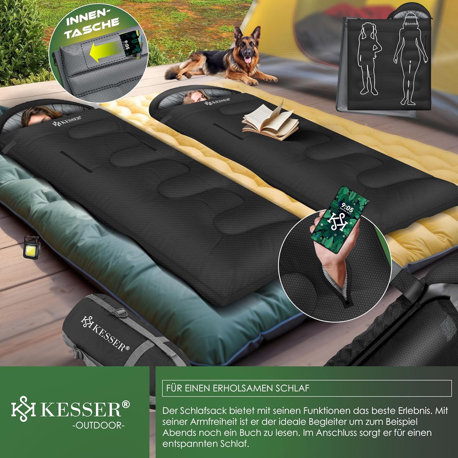 KESSER® Slaapzak voor buiten, dekenslaapzak, 3-4 seizoenen, campingslaapzak voor volwassenen en kinderen, licht, draagbaar, warm en waterafstotend, inclusief campinglamp en zijzak, zwart
