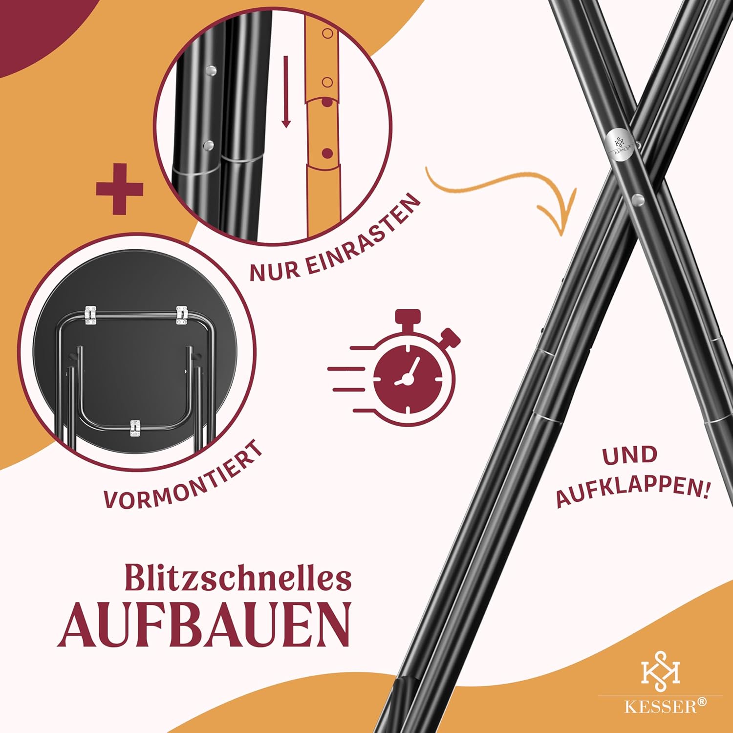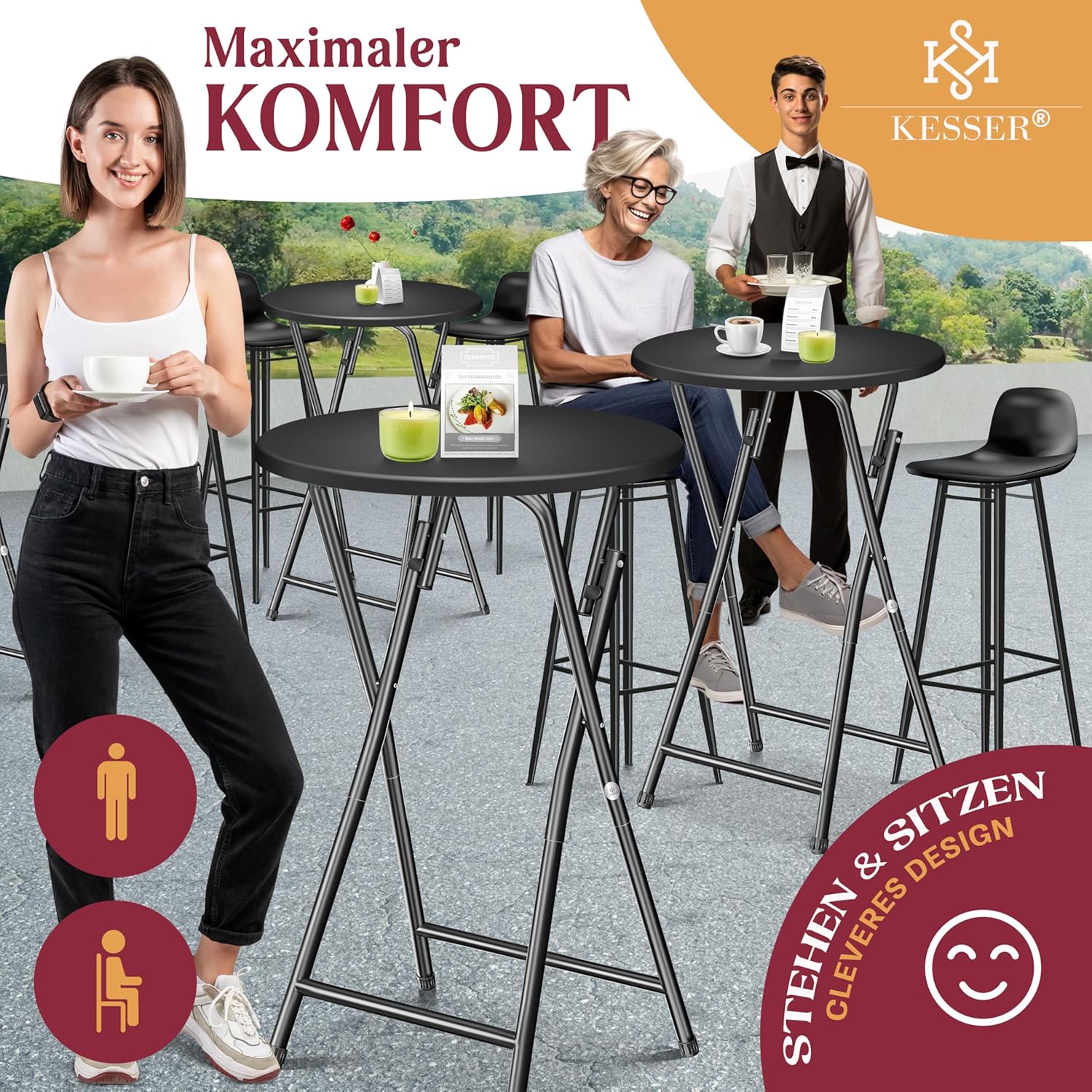 Gemonteerd en eenvoudig te hangen: de KESSER statafel wordt al voorgemonteerd geleverd, zodat je hem zonder extra gereedschap direct kunt gebruiken. De eenvoudige bediening en het snelle inklikken van de onderdelen maken de montage kinderlijk eenvoudig, wat vooral bij kortstondige gelegenheden een voordeel is. De tafel is direct klaar voor gebruik en vereist geen ingewikkelde montage-instructies.