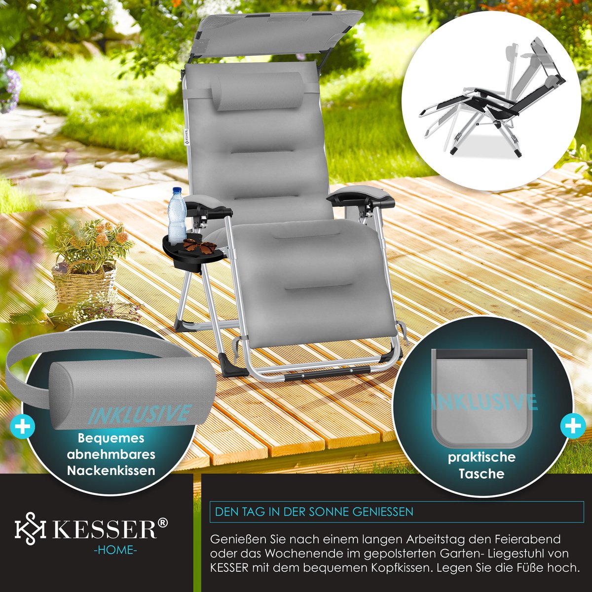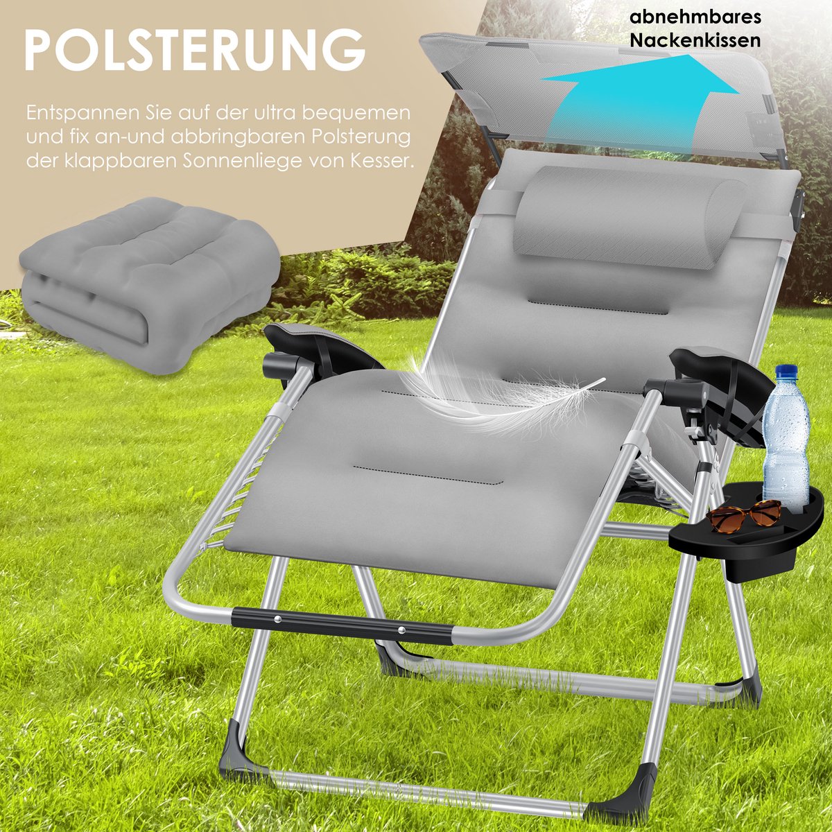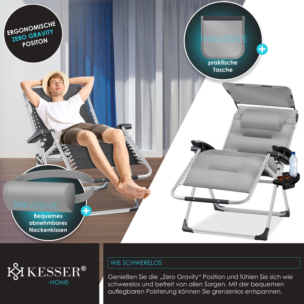 KESSER ligstoel met extra dikke, hoogwaardige bekleding, extra breed en comfortabel ligoppervlak met ergonomische en gewatteerde armleuningen, ademend en antislip materiaal, inclusief comfortabele hoofdsteunen, geïntegreerde opbergtafel, praktische zijvakken. Ultrastabiele ligstoelconstructie en antislip dankzij hoogwaardige hoeksteunen op de voetframes.