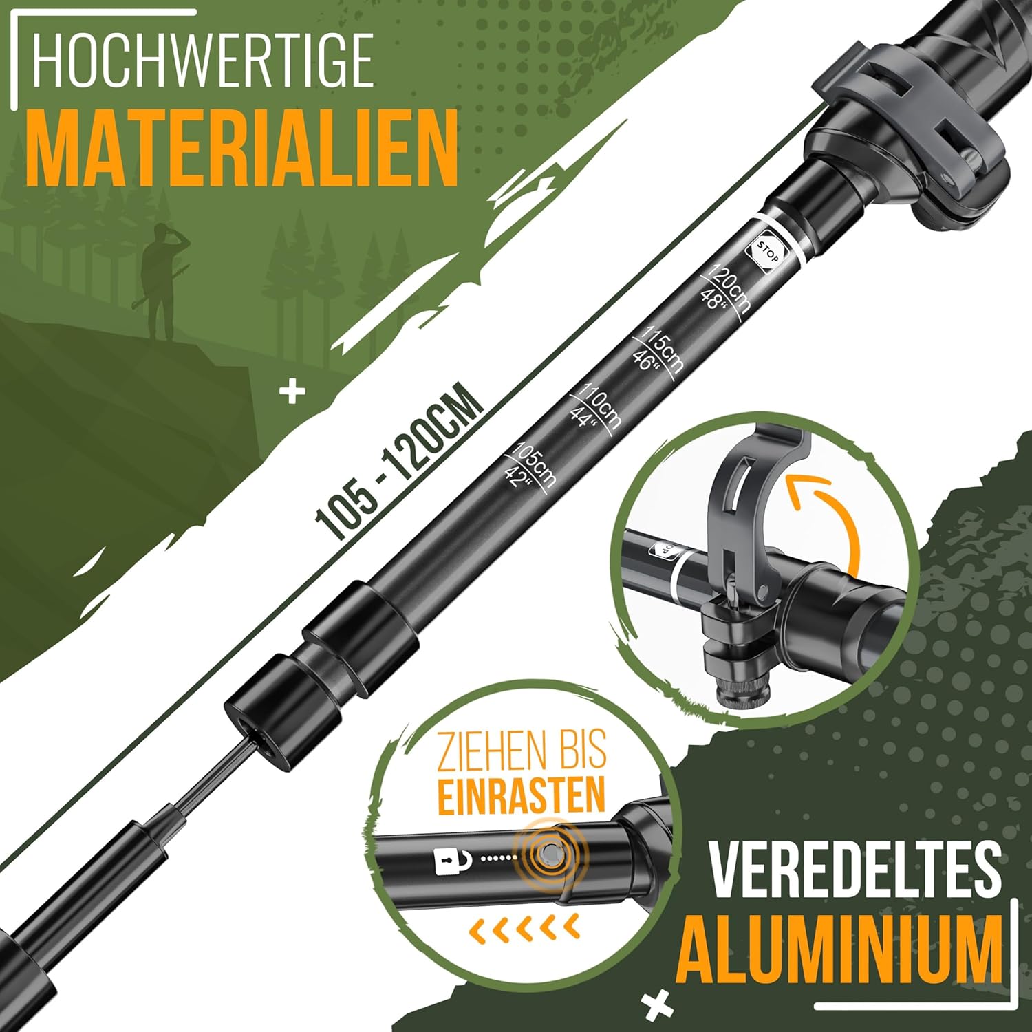Licht en stabiel: gewicht afhankelijk van de variant: telescopisch aluminium 300 g, telescopisch carbon 260 g, opvouwbaar aluminium 105-120 cm, 300 g, opvouwbaar aluminium 115-135 cm, 320 g, opvouwbaar carbon 105-120 cm, 250 g, opvouwbaar carbon 115-135 cm, 270 g.