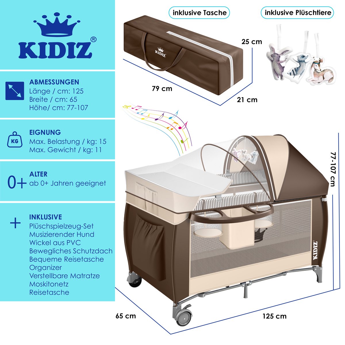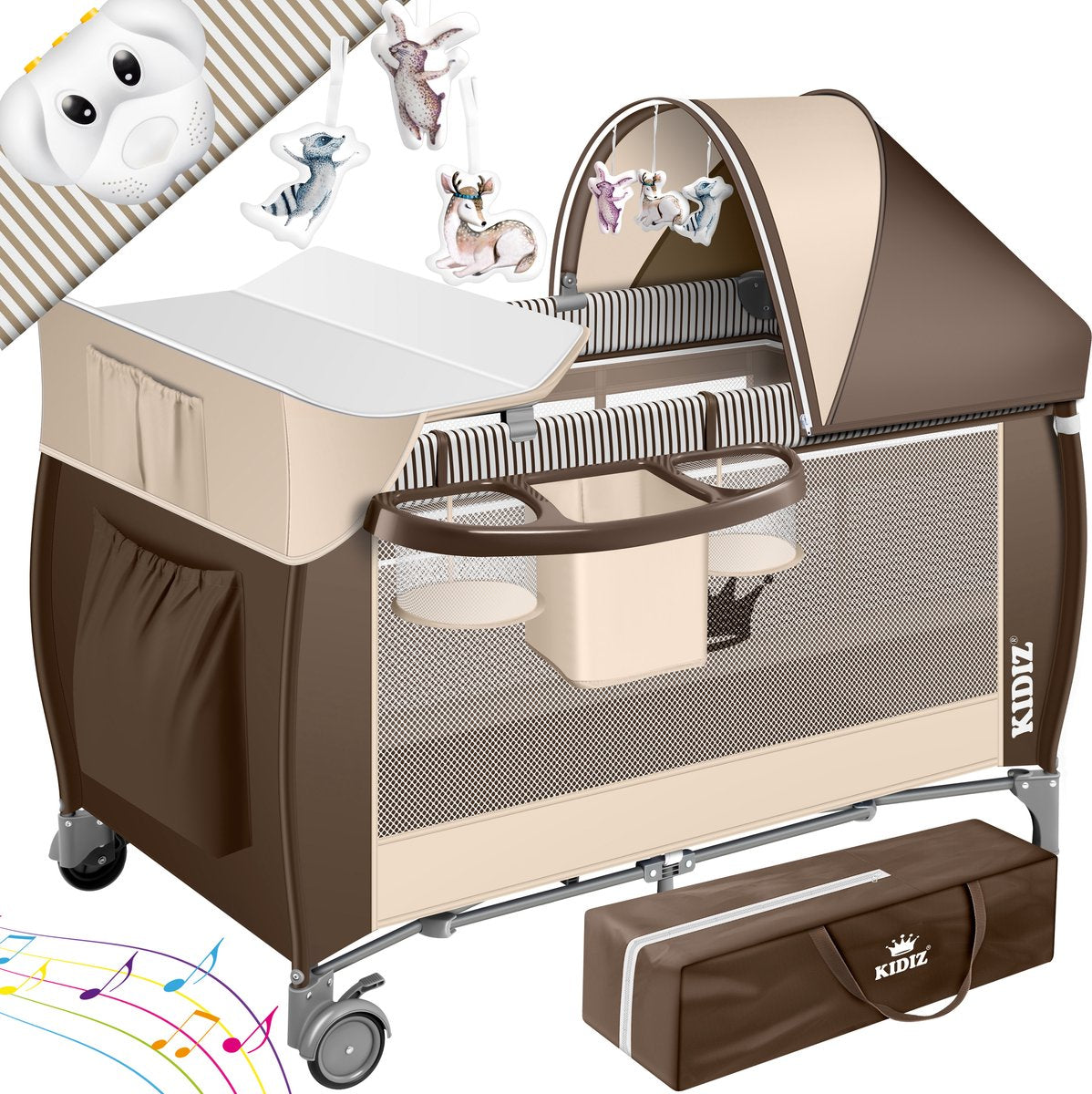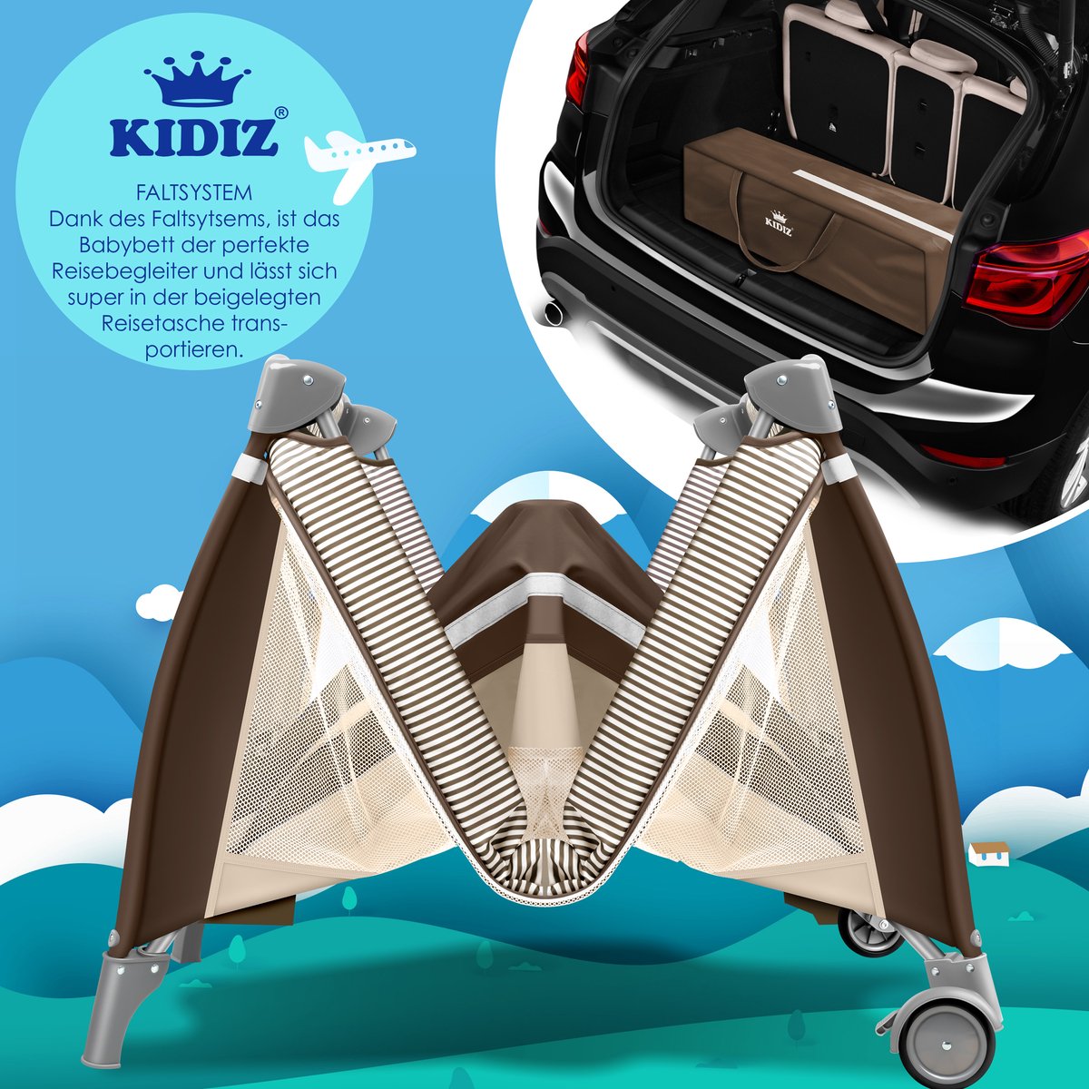 KIDIZ® Campingbedje Reisbedje Reiswieg Babybedje 3 in 1 Combi Set Ledikant met Verschoningsmatje Klamboe Kinderbox Baby vanaf de geboorte tot 15 kg Luchtige zijwanden met zijingang Opvouwbare Draagtas - Bruin