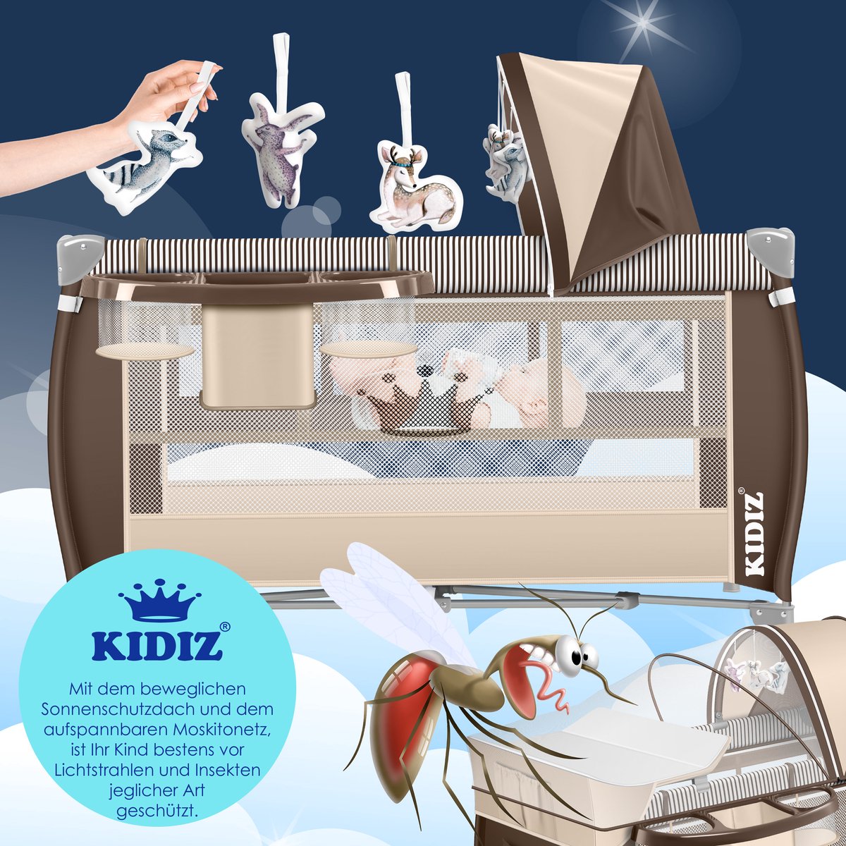 Het KIDIZ extra bed is een reiswieg en box tegelijk. Het is ideaal voor kinderen tussen 0 en 3 jaar met een lichaamsgewicht tot 15 kilogram. Het matras van hoge kwaliteit heeft een gezellig ligoppervlak en bestaat uit elastisch en resistent schuim met een polyester hoes, die een rustige slaap van het kind ondersteunt. De stabiele zijwanden zijn gemaakt van een luchtdoorlatend net en zorgen zo voor een perfecte luchtcirculatie.
