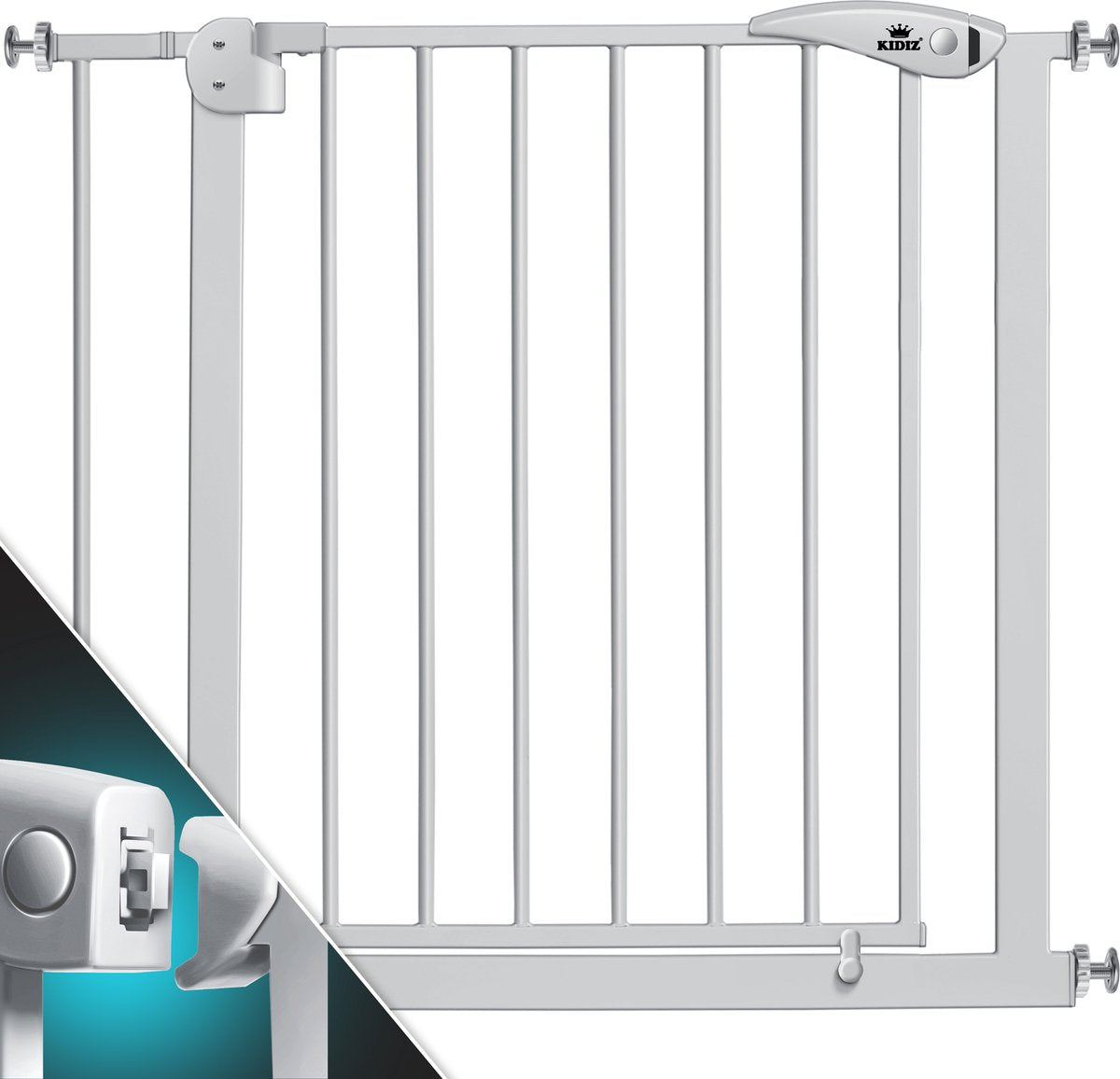 VEILIGHEID: Ons traphekje van het merk Kidiz biedt hier de nodige bescherming, blokkeert de weg naar boven of naar beneden en remt zo het hoge tempo van onze kleine ontdekkingsreizigers. Met een kindveilig slot kunnen ze er niet doorheen. Desondanks kunnen volwassenen de deuren gemakkelijk openen zonder zichzelf te belasten.