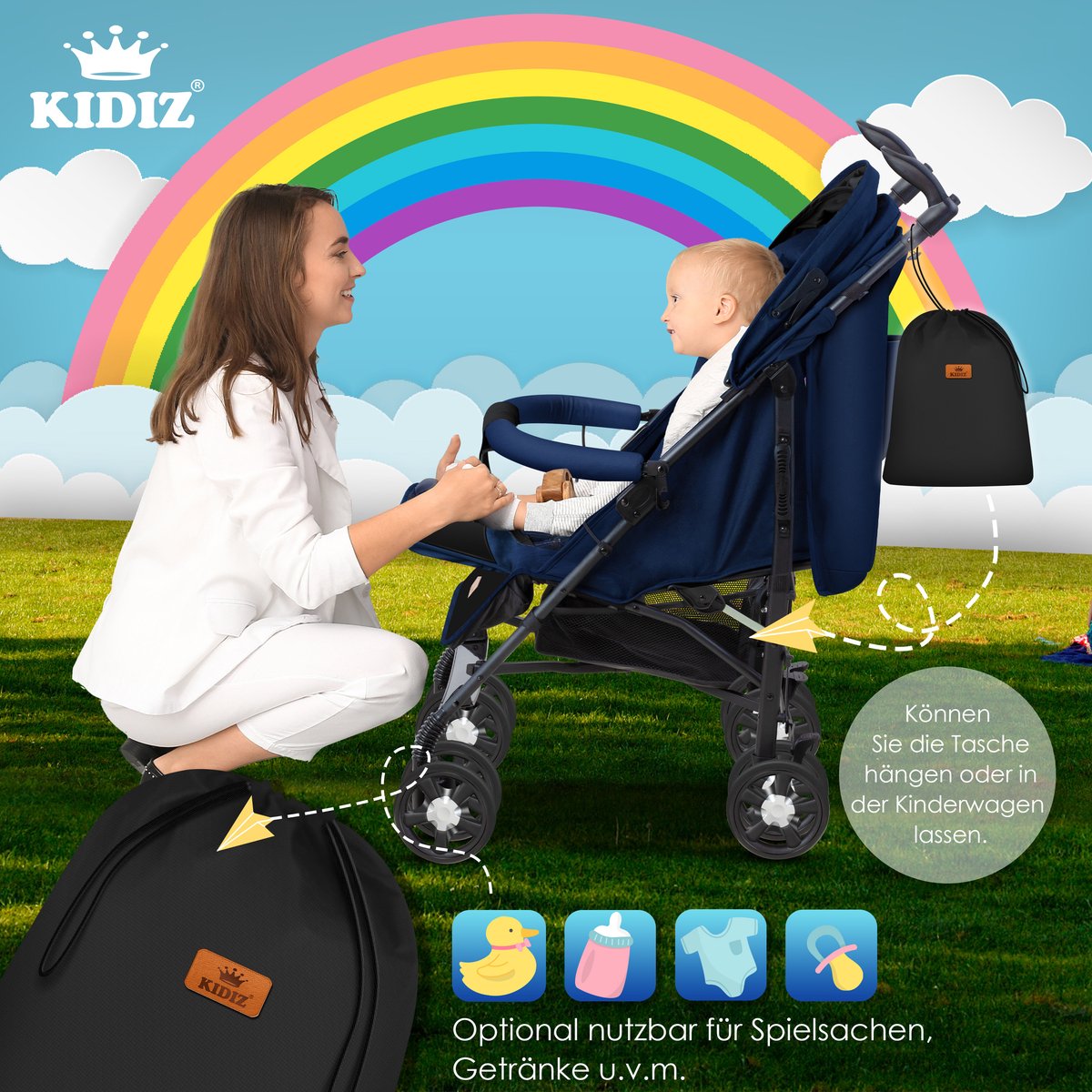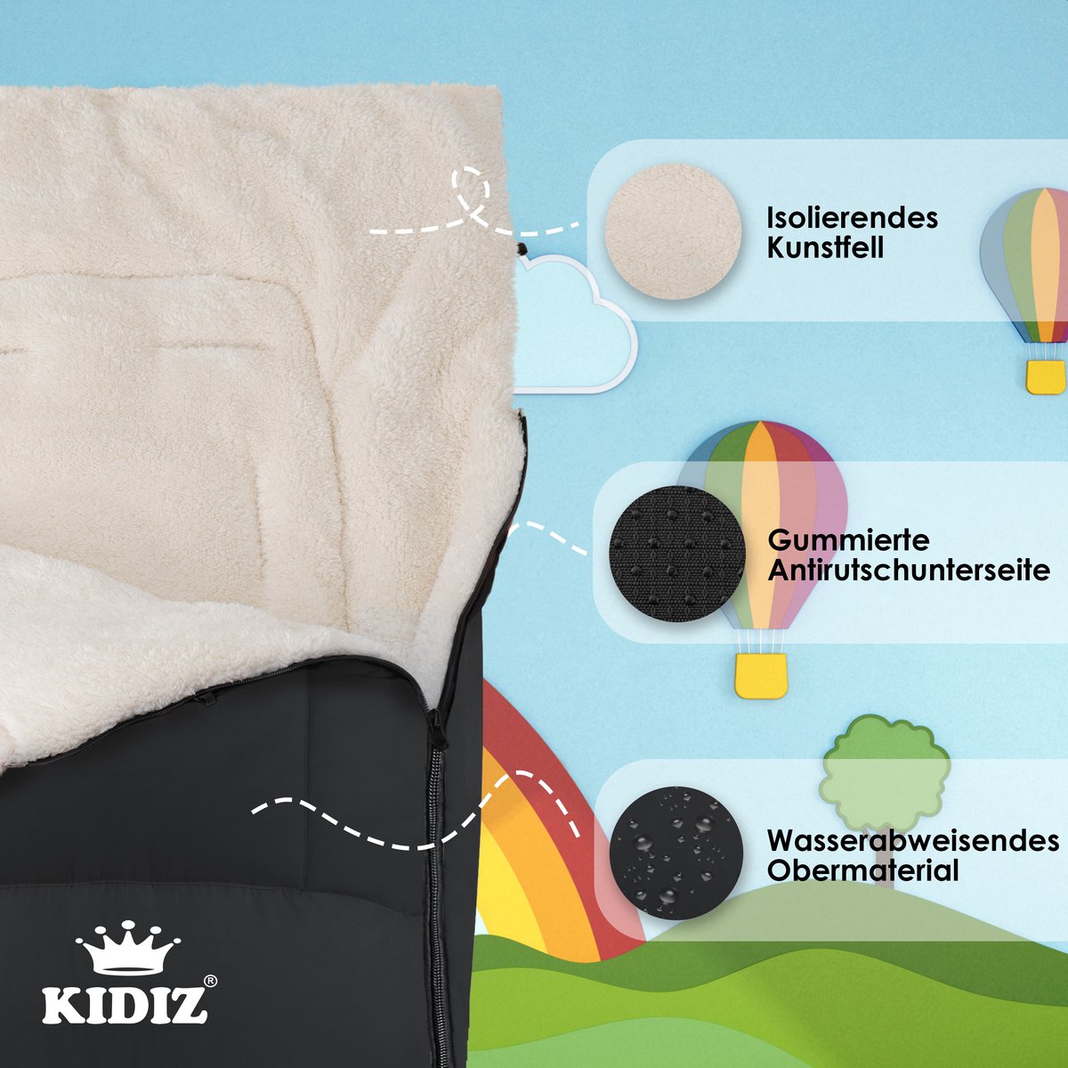 De KIDIZ knusse voetenzak is geschikt voor kinderwagens, autostoelen en buggy's, met een sluitbare hoofdsteun, goed gevoerd en waterafstotend voor perfecte warmte.