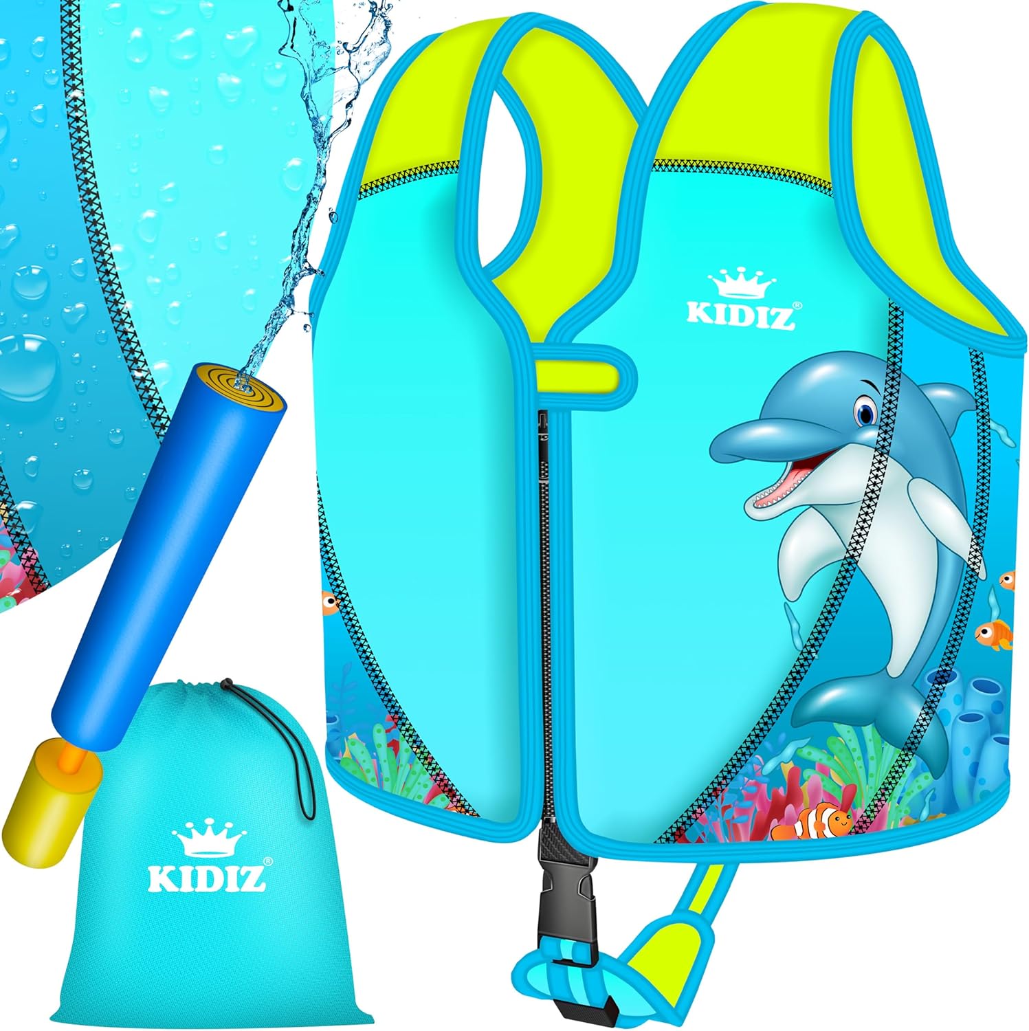 Inclusief schuimwaterpistool: bij de levering van het zwemvest Kidiz is een schuimwaterpistool inbegrepen, dat extra plezier in het water garandeert. Dit accessoire is gemakkelijk te hanteren en perfect geschikt voor speelse activiteiten in het zwembad of op het strand. Het waterpistool bevordert niet alleen het plezier van het zwemmen, maar draagt ook bij aan de ontwikkeling van de motorische vaardigheden en de hand-oogcoördinatie van je kind.