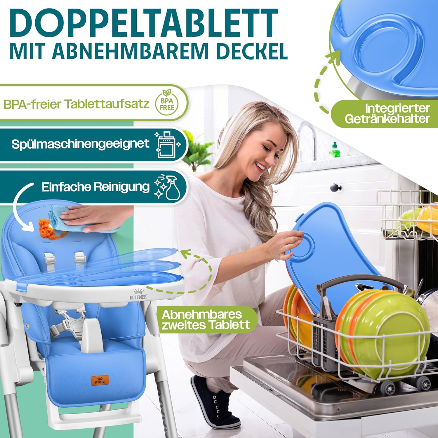 Dubbel plateau met afneembare tafelklep: stel het dubbele dienblad in op de ideale afstand tot het kind. Het BPA-vrije tabletdeksel is afneembaar en vaatwasmachinebestendig, voor een snelle, hygiënische reiniging na elke maaltijd.