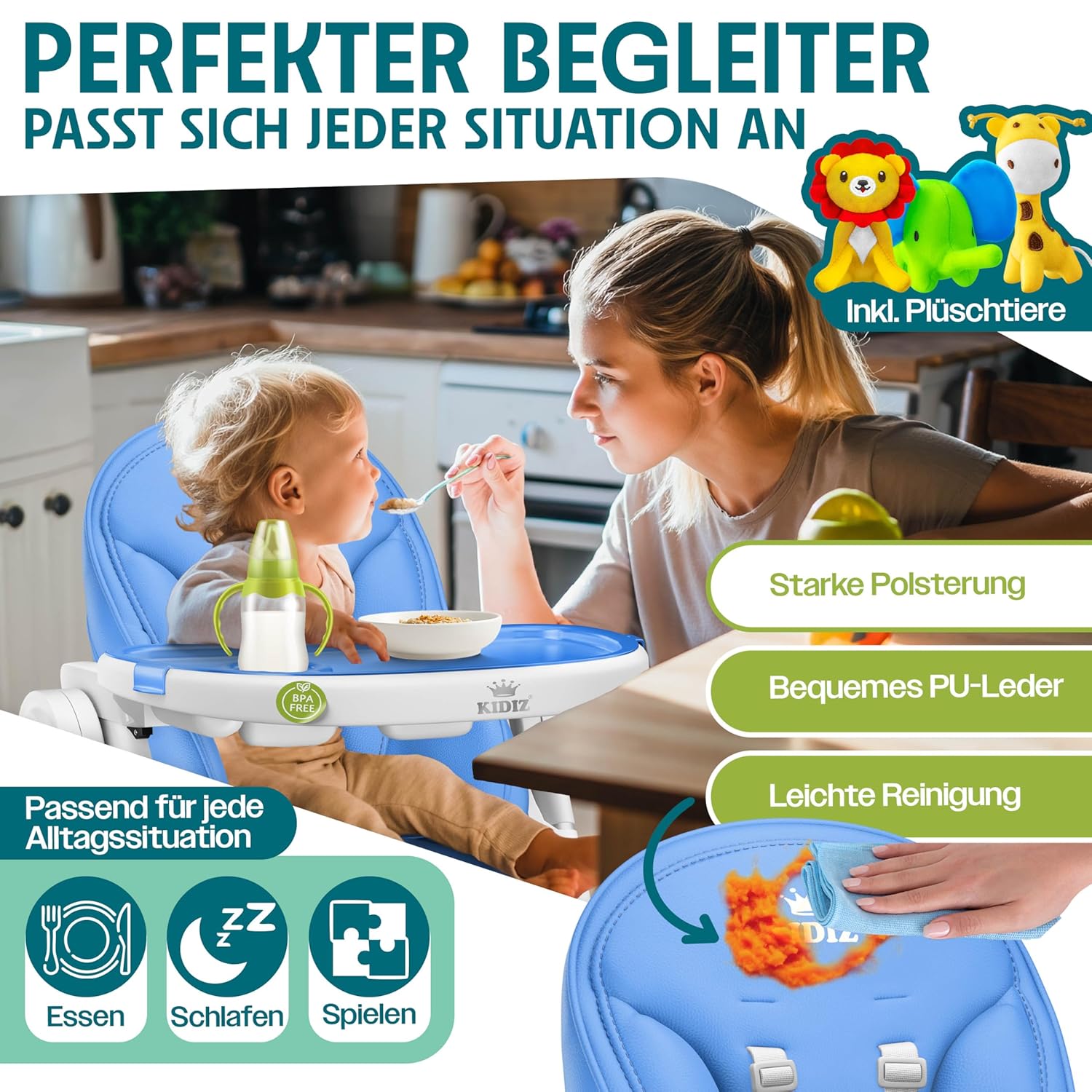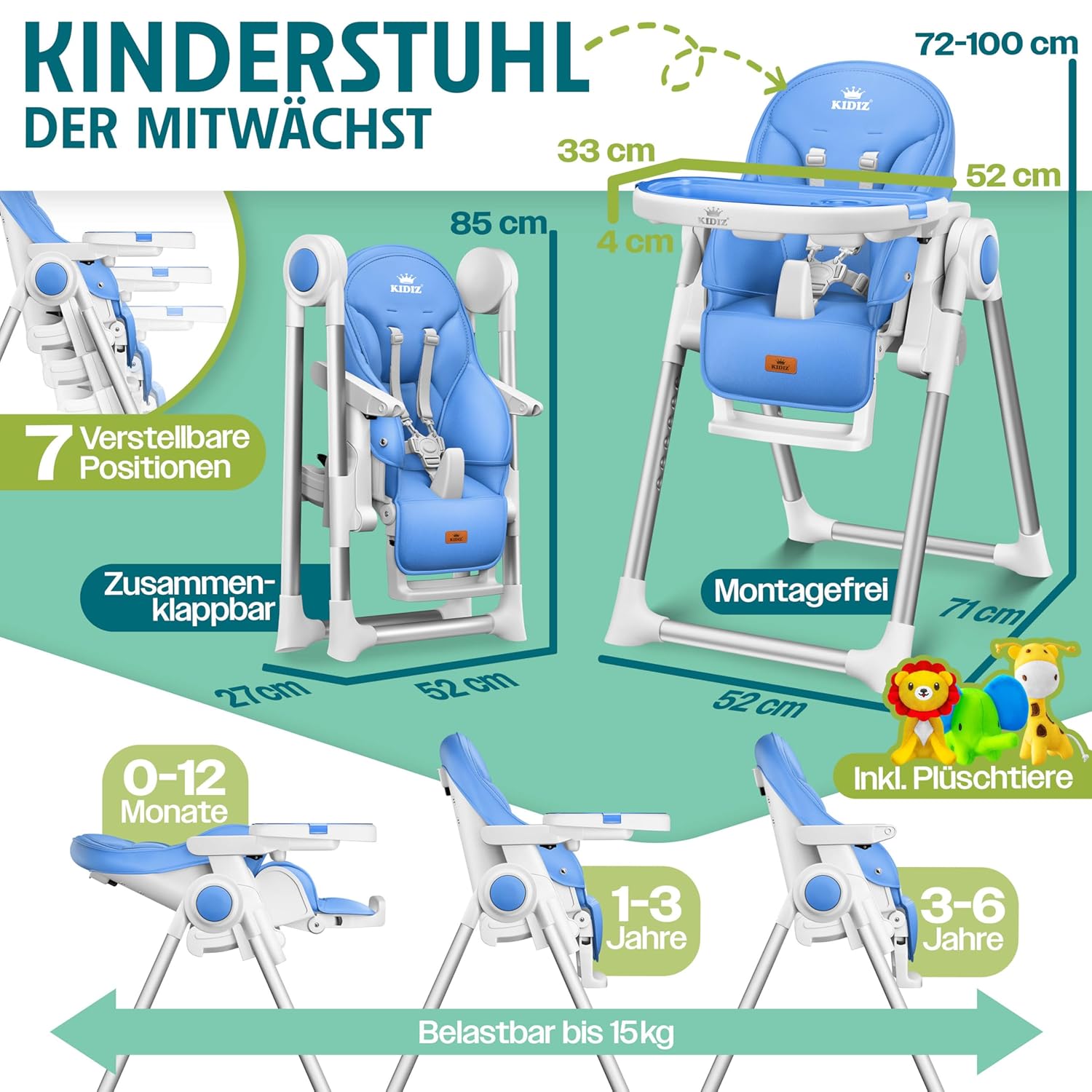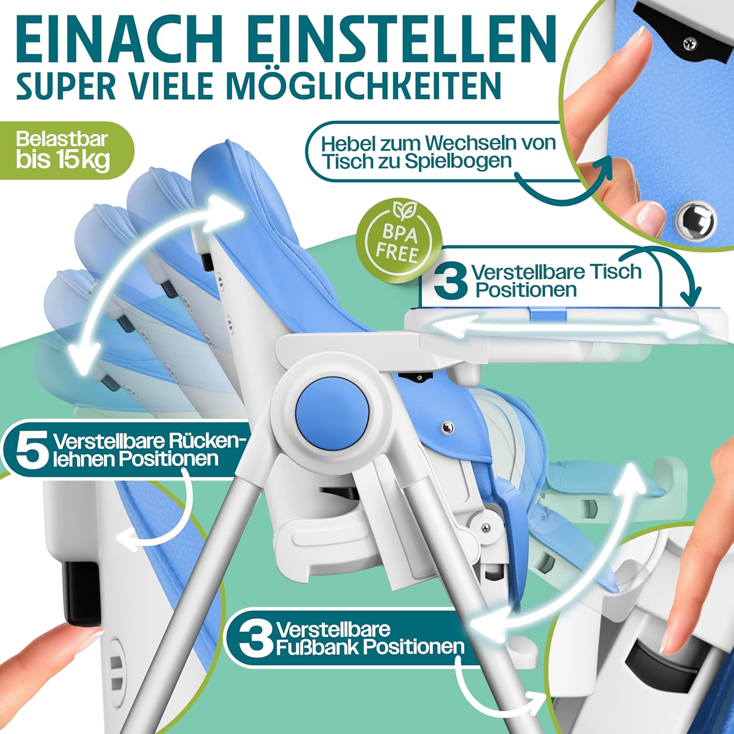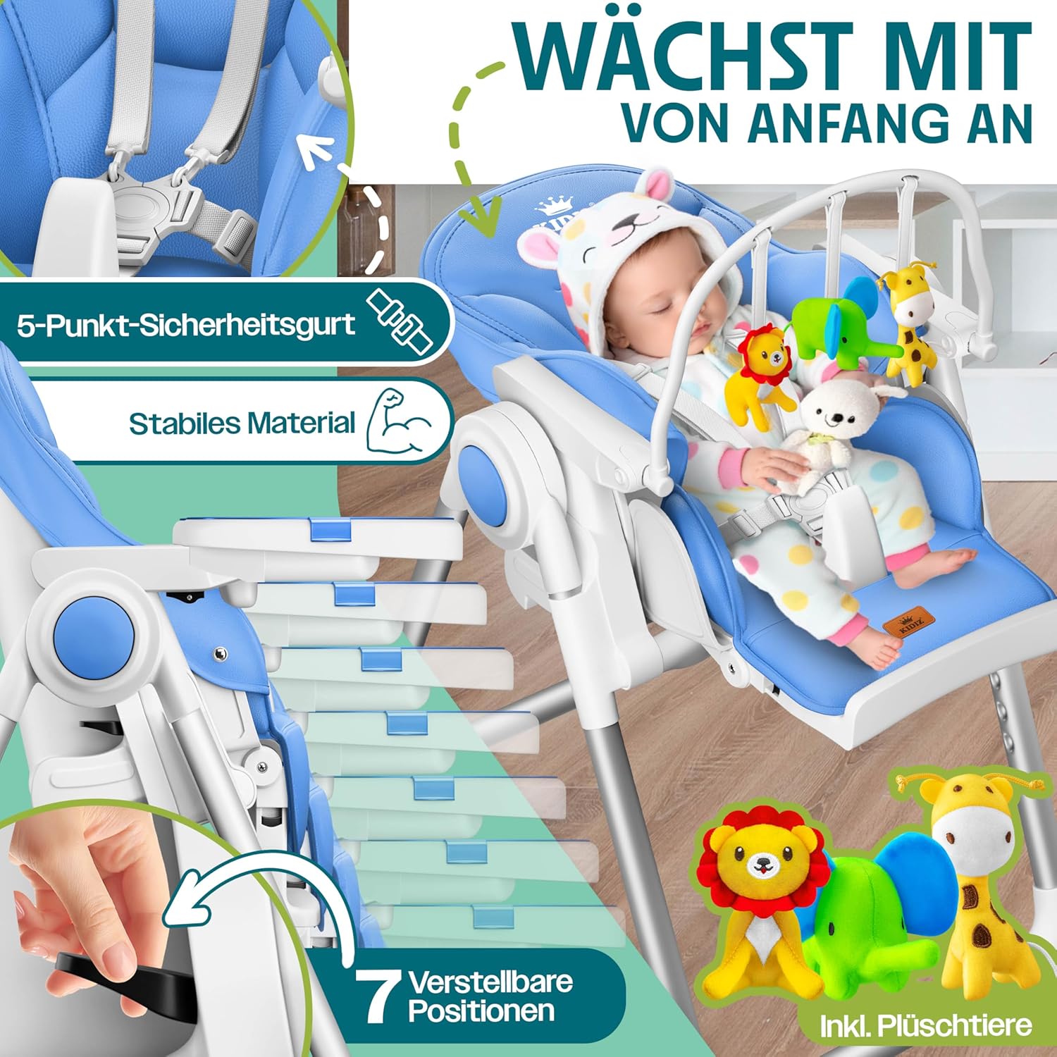 3-in-1 hoge stoel: babyligstoel voor pasgeborenen (0-12 maanden), kinderstoel voor peuters (1-3 jaar). De rugleuning klap je eenvoudig naar boven. Zonder dienblad wordt de kinderstoel een kinderstoel – ideaal voor elke groeifase van je kind.