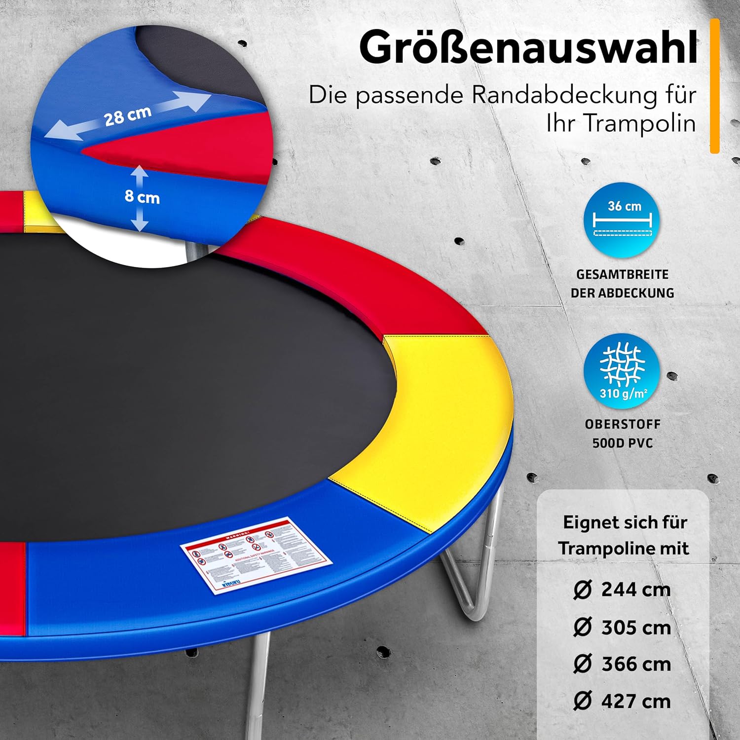 Geschikt voor alle weersomstandigheden: de 26 cm brede bekleding van de KIDUKU trampoline randafdekking is bestand tegen zonlicht - is dus uv-bestendig, bestand tegen regen en is ook bestand tegen vorst op koude winterdagen. Het gaat om een permanente afdekking.