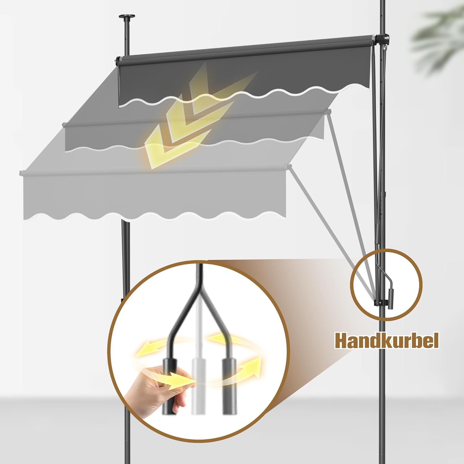 Klemluifel met handslinger, 150 cm, bereid, handmatig in hoogte verstelbaar, balkonluifel zonder boren, uv-bescherming, zonwering, waterdicht, voor buiten, terras, balkon, tuin, antraciet
