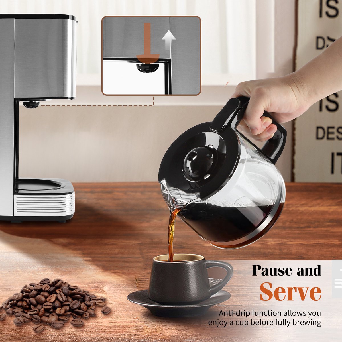 Deze moderne koffiezetapparaat combineert stijl en functionaliteit in één apparaat. Met een capaciteit van 1,5 liter kan het tot wel 12 kopjes koffie in één keer zetten, perfect voor gezinnen of gasten. U kunt uw koffie aanpassen zoals u dat wilt met de twee opties voor de sterkte van ons koffiezetapparaat.. Met geavanceerde functies zoals een anti-druppelsysteem, instelbare koffiesterkte, een warmhoudfunctie van 40 minuten en een gebruiksvriendelijk touchscreen LED-display, biedt deze koffiezetapparaat alles wat u nodig heeft voor de perfecte kop koffie. Bovendien beschikt het over een 24-uurs programmeerbare timer, zodat u altijd op het perfecte moment kunt genieten van vers gezette koffie.