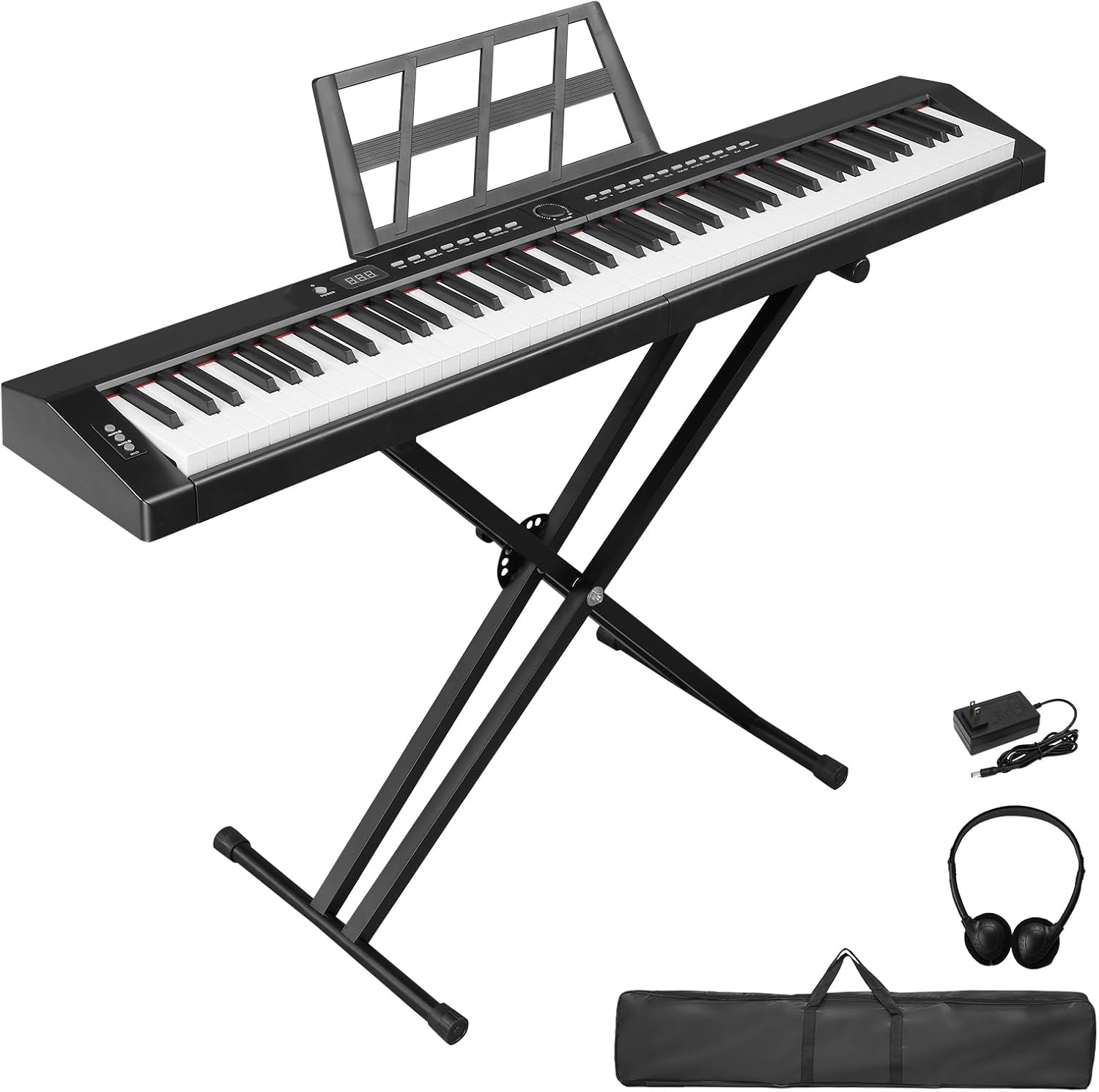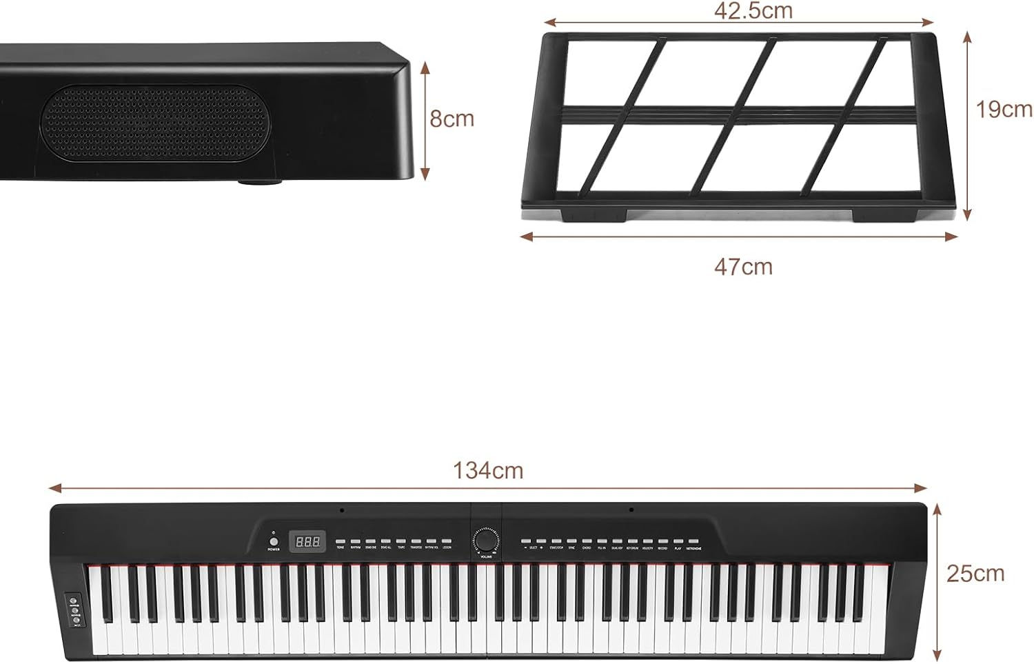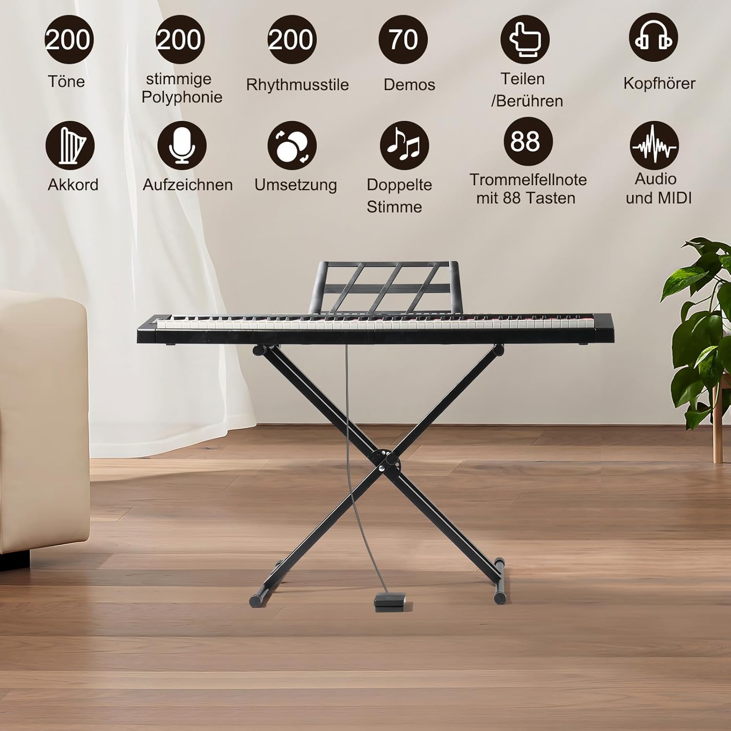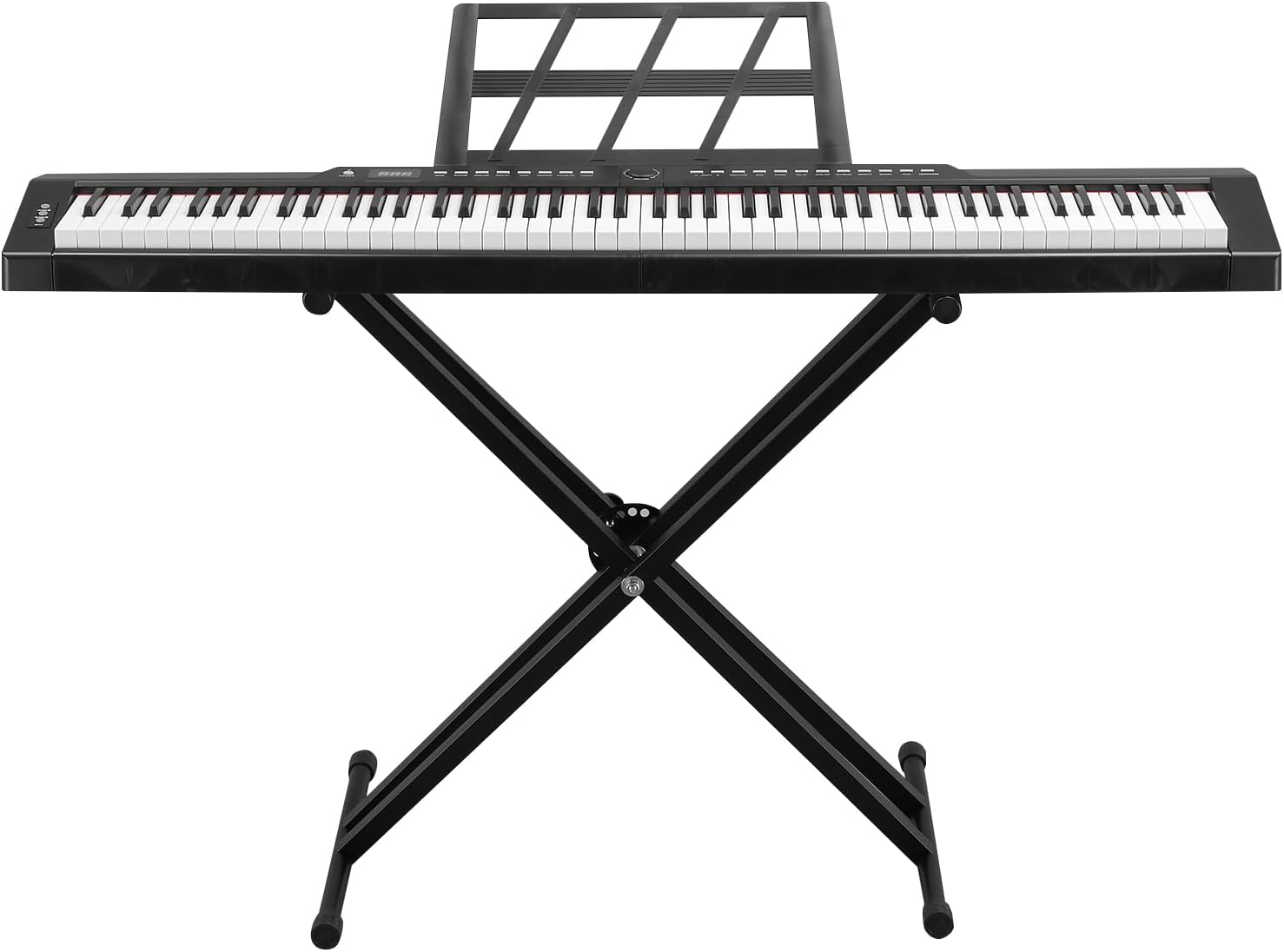 Inclusief standaard: deze 88 toetsen halfgewogen keyboard piano wordt geleverd met een x-vormige dubbele buis-toetsenbordstandaard, die in 6 standen in hoogte kan worden aangepast en op de hoogte kan worden ingesteld die bij hen past, wat comfort biedt tijdens het spelen