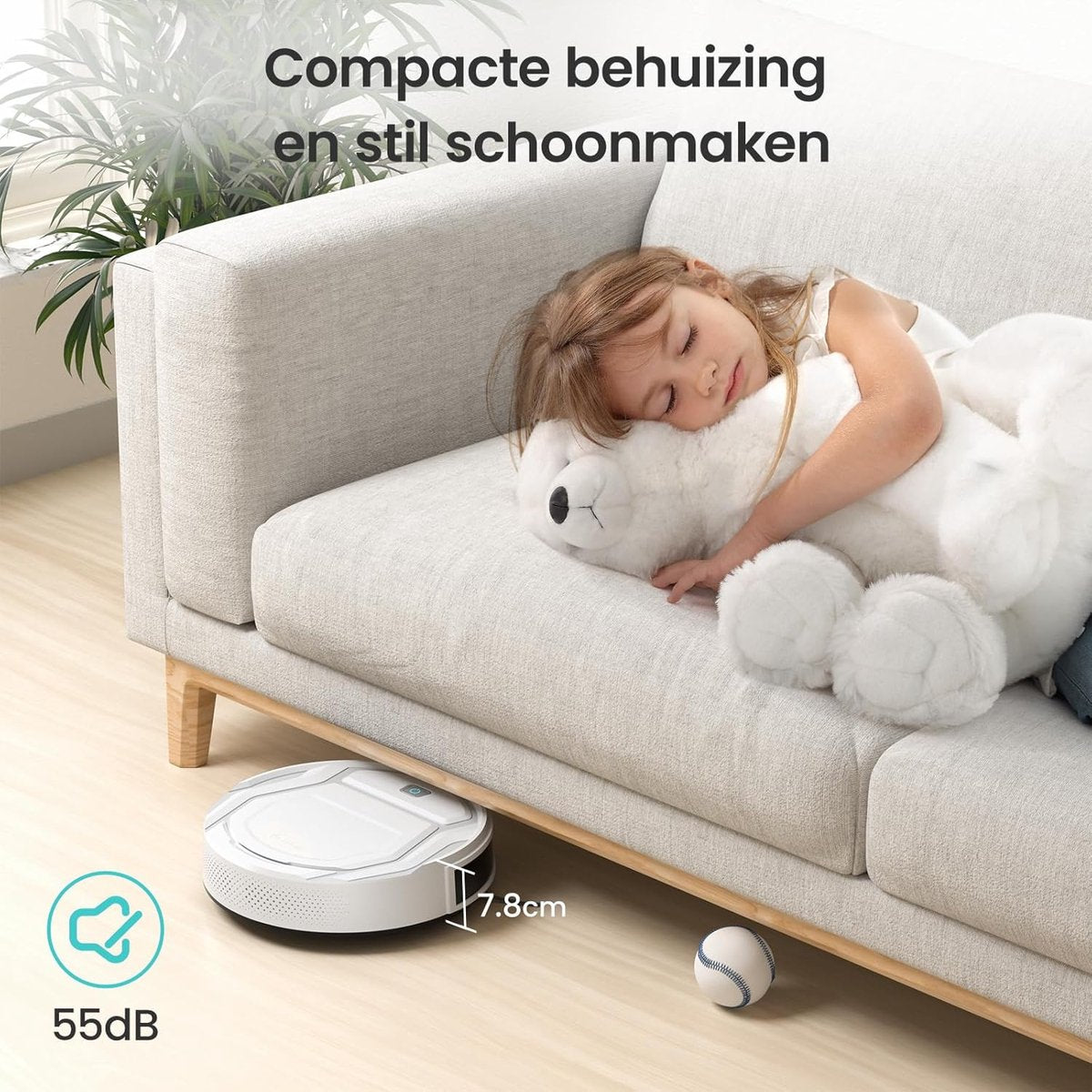 Compact Ontwerp: Met een breedte van slechts 28 cm en een hoogte van 7,6 cm heeft de robotstofzuiger een slank ontwerp dat moeiteloos onder meubels, bedden en banken kan navigeren, wat resulteert in een grondige reiniging met een hoge dekking en een lage uitvalsnelheid.