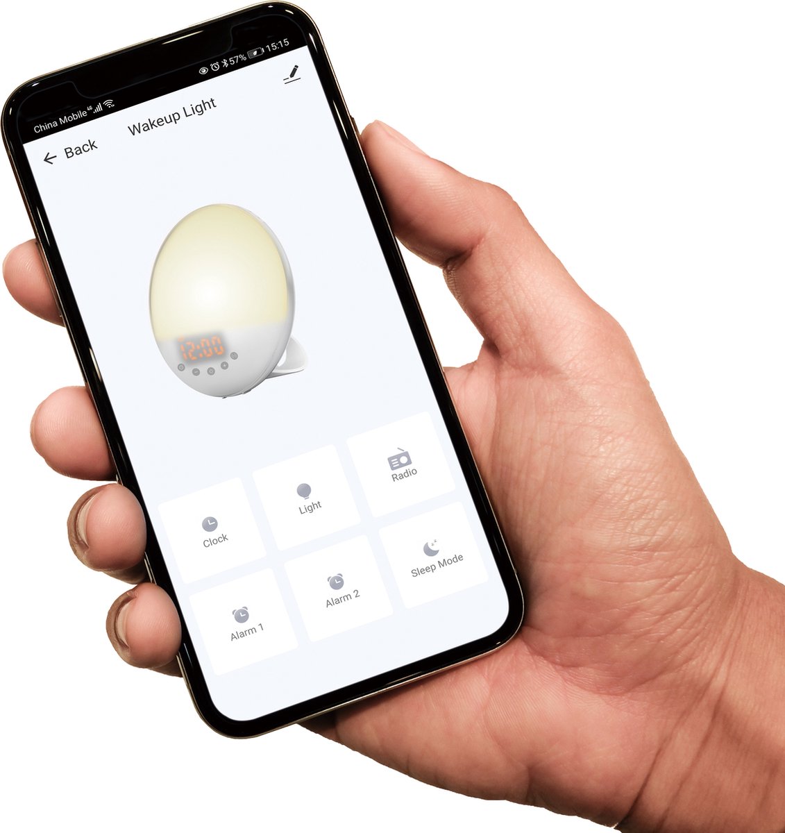 Sluit de SMART wekkerradio eenvoudig aan op Wifi. Zo kun je deze samen met de andere SMART toestellen in huis beheren via de Tuya Smart app. De wektijd, de duur van zonsopgang, de intensiteit van het licht én het volume van de geluiden kunnen eenvoudig ingesteld worden via deze app. Ook via Amazon Alexa en Google Home kunnen enkele functies uitgevoerd worden.