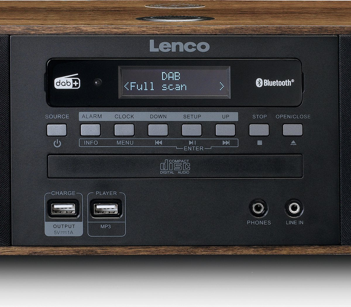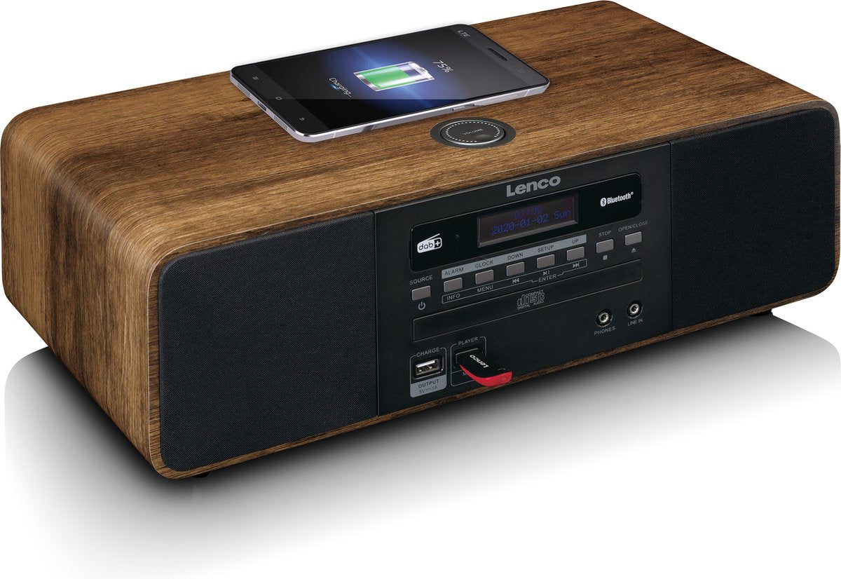 Lenco’s DAR-051WD is een radio waarmee je op verschillende manieren jouw favoriete nummers kunt afspelen. Zo heeft deze radio Bluetooth, waarmee je hem draadloos met je telefoon of tablet kunt verbinden. Ook is het een CD/MP3 en USB speler. Je kunt zowel gebruikmaken van de ruisloze DAB+ radiofunctie, als van PLL FM radio. Daarnaast heeft de DAR-051 een draadloos oplaadpunt boven op de radio, waarmee je je smartphone draadloos kunt opladen.