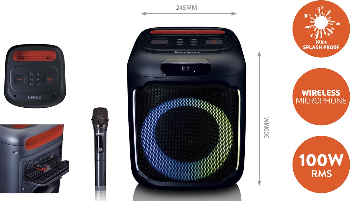 Geen feestje zonder deze PA-KING Je sluit je smartphone of tablet gemakkelijk aan via Bluetooth® en speelt de muziek direct af vanuit je favoriete app. Met de verlichting aan de voorkant tover je de ruimte daarnaast meteen om tot een echte disco. Een disco die dankzij de oplaadbare geïntegreerde batterij met een capaciteit van 2400mAh tot wel 8 uur kan duren. Zonder verlichting en bij een volledig opgeladen batterij kun je zelfs tot 14 uur muziek luisteren. Zet de meegeleverde draadloze microfoon aan en maak het feest compleet.