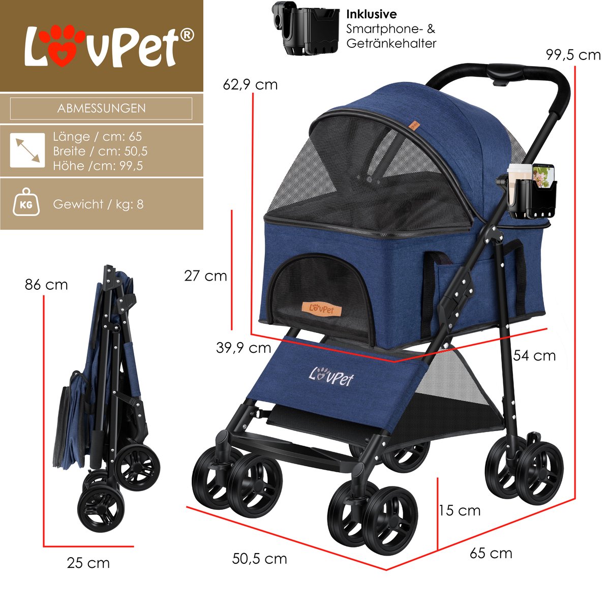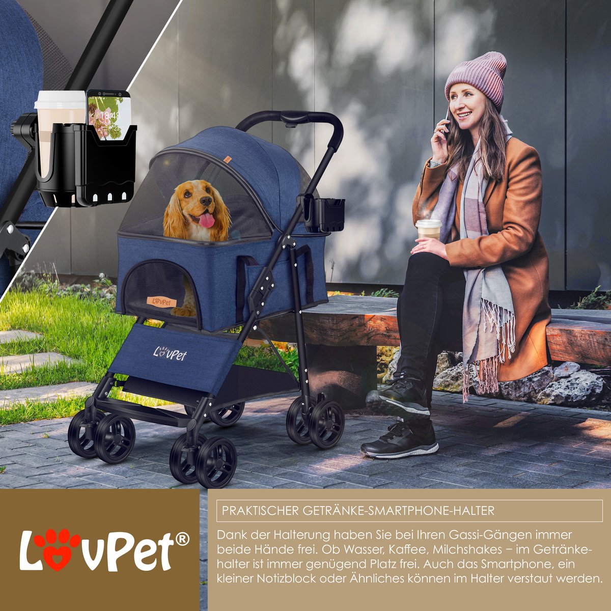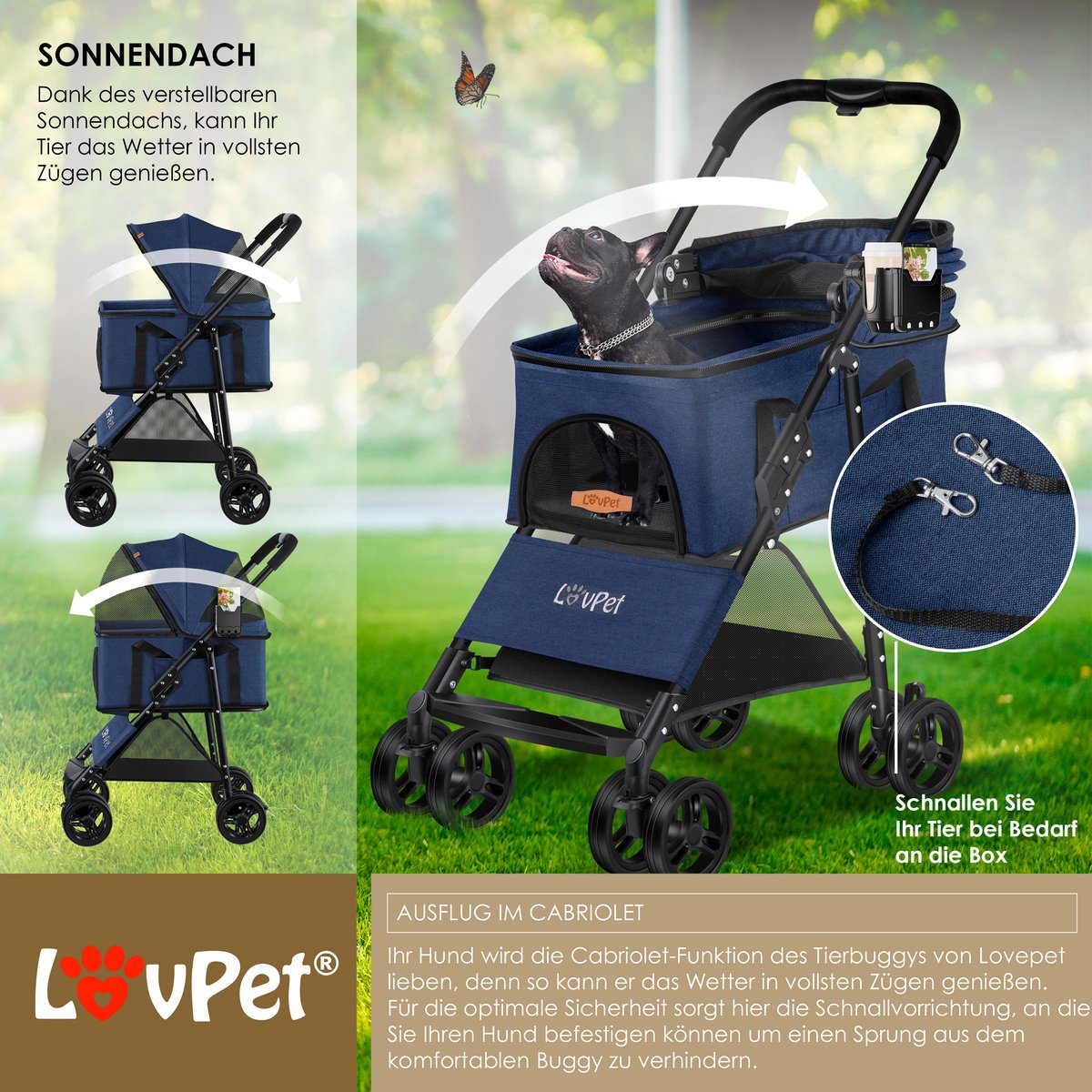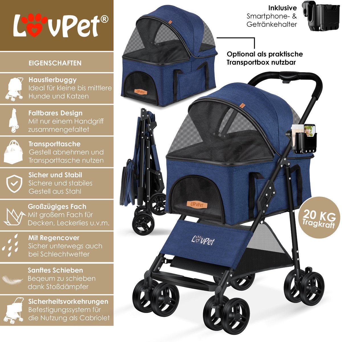 LOVPET hondenbuggy kan comfortabel geduwd worden dankzij schokdempers, ideaal voor kleine tot middelgrote honden en katten, opvouwbaar in slechts één eenvoudige stap, veilig en stabiel frame van staal, accessoires zoals een groot vak voor traktaties en dekens en een regenhoes in geval van slecht weer.