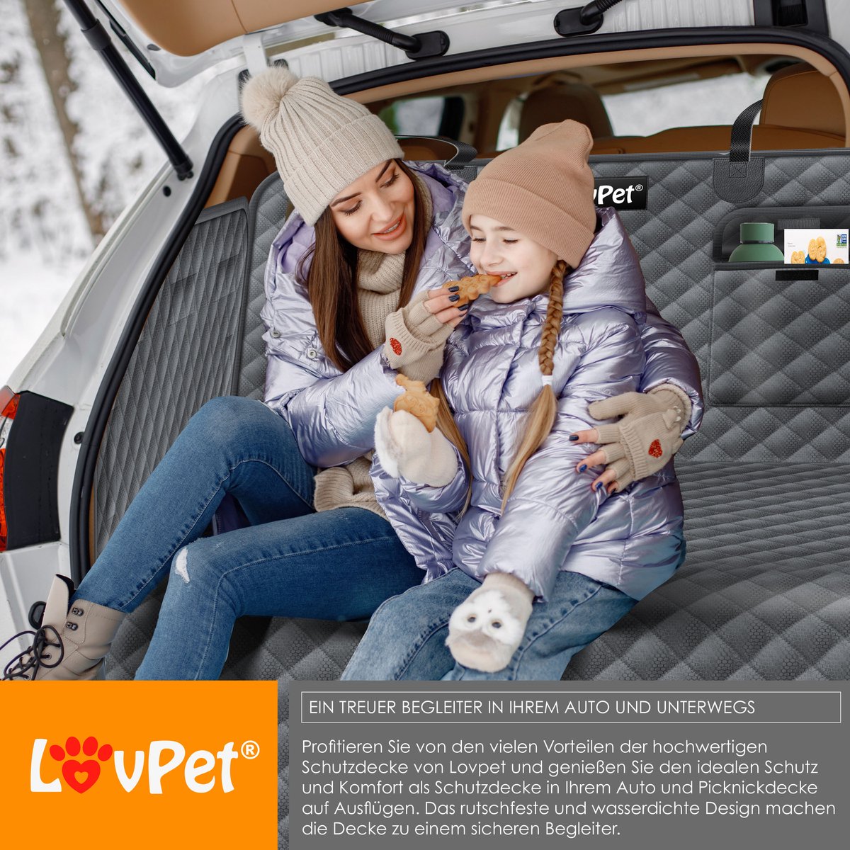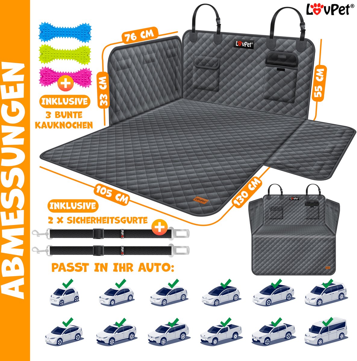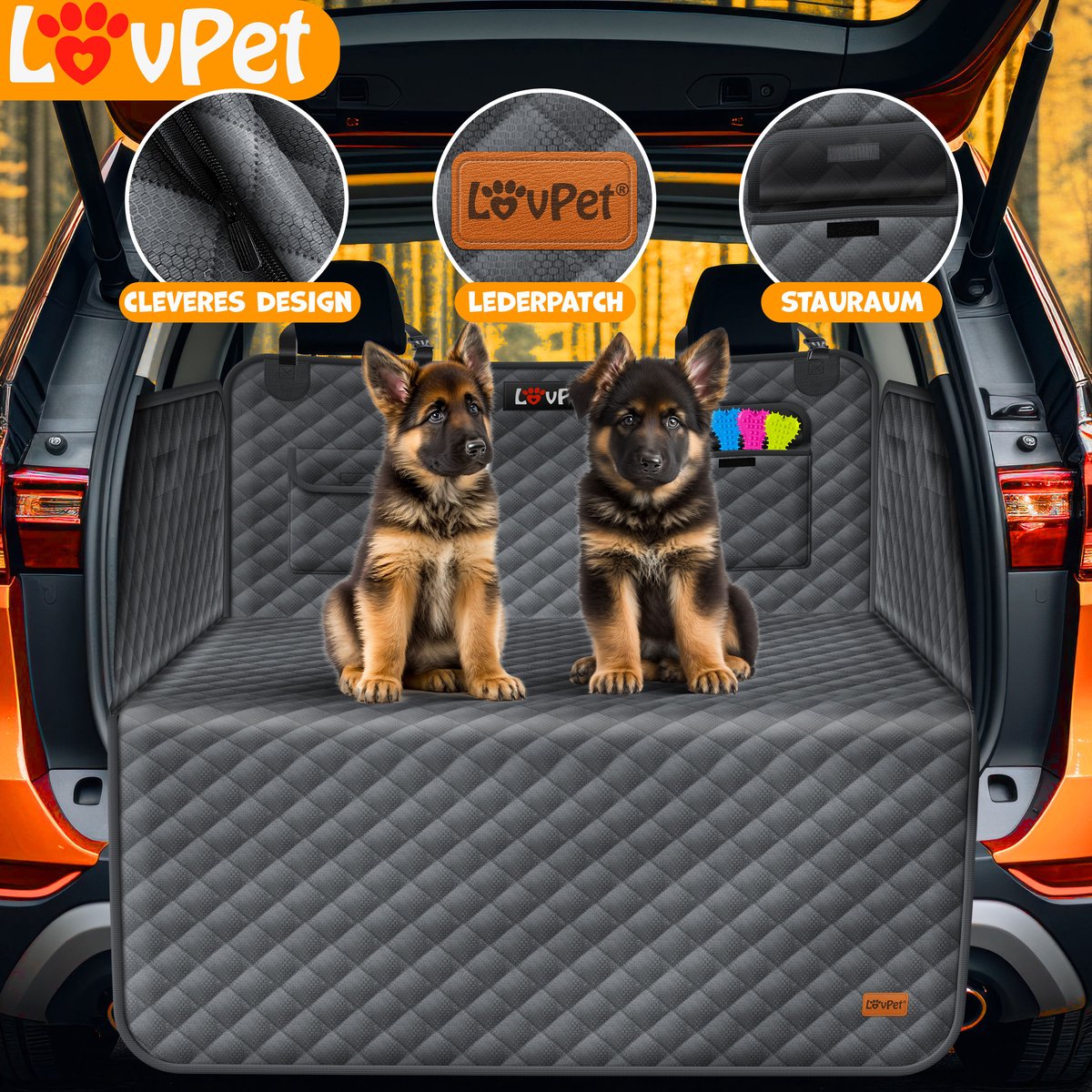 LOVPET® Auto kofferbakbescherming voor honden, gestept met zij- en ladekant bescherming | Universele kofferbak beschermingsmat voor honden | Waterafstotende & krasbestendige hondendeken met veiligheidsgordel en accessoires.