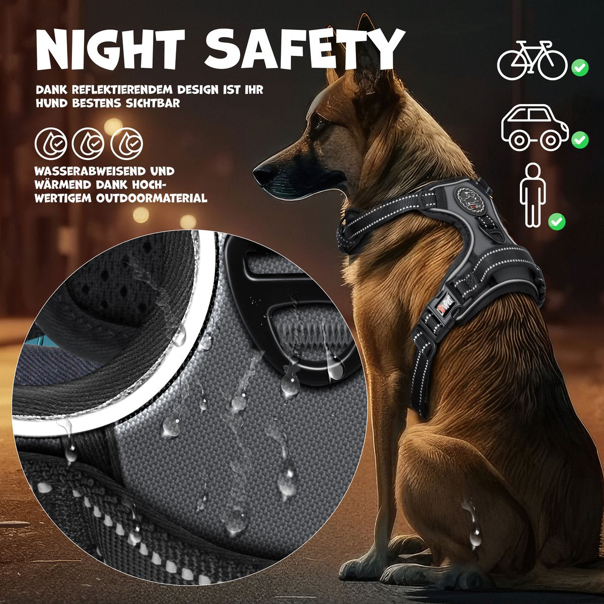 Ons anti-trektuig heeft een geavanceerd reflecterend ontwerp dat de zichtbaarheid van je hond 's nachts of bij weinig licht verbetert. Dit betekent dat je in het donker ontspannen kunt wandelen zonder dat je je zorgen hoeft te maken, want je hond is goed zichtbaar en de kans op ongelukken is daardoor aanzienlijk kleiner.