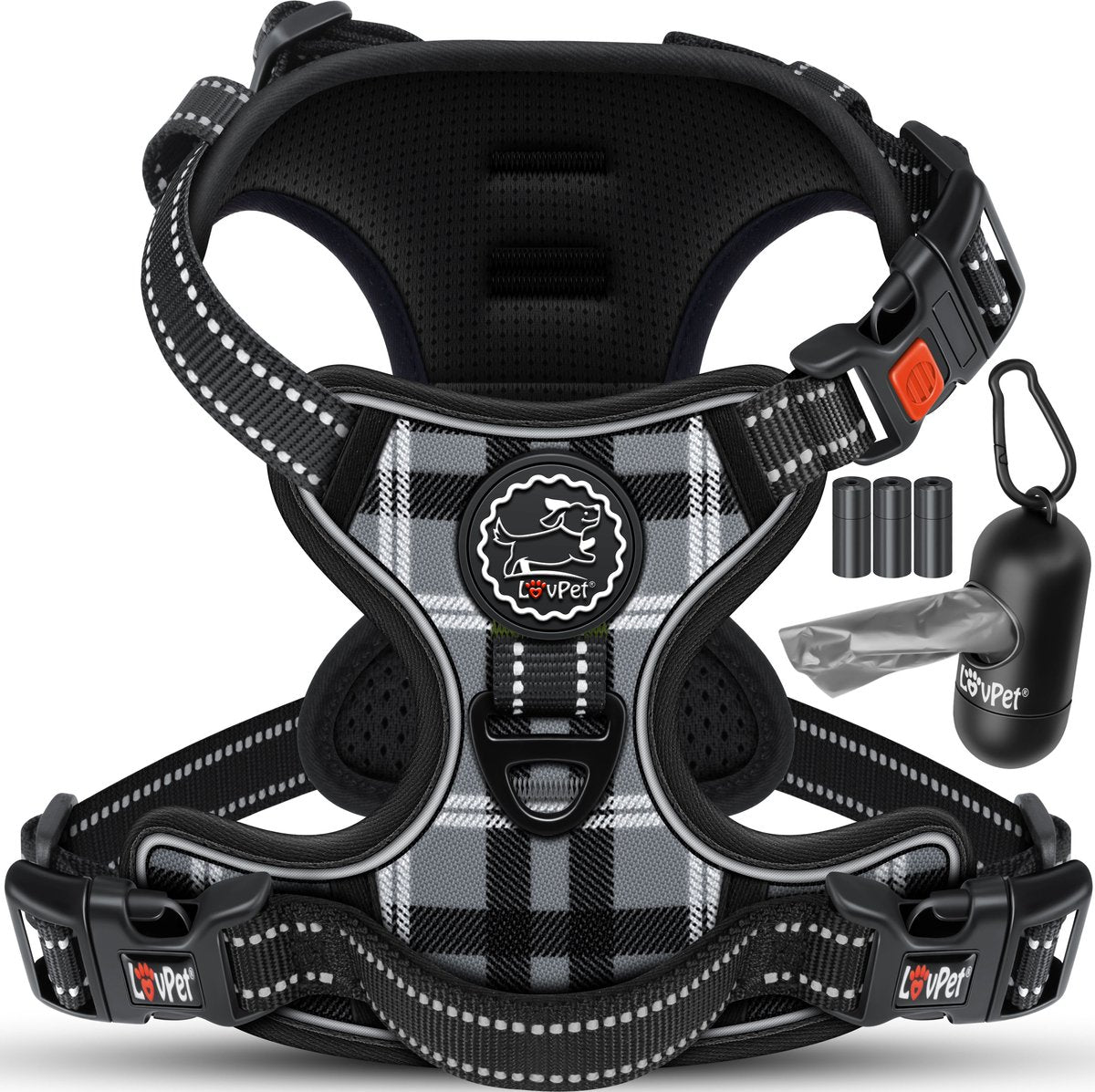 LOVPET hondentuig veilig, reflecterend in verschillende maten met praktische handgreep, sluitsysteem, waterafstotend materiaal, meegroeiend ontwerp en handige extra's.