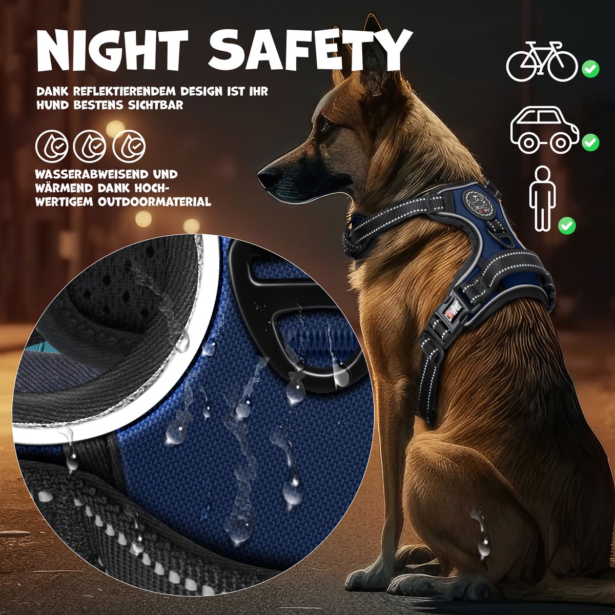 Ons anti-trektuig heeft een geavanceerd reflecterend ontwerp dat de zichtbaarheid van je hond 's nachts of bij weinig licht verbetert. Dit betekent dat je in het donker ontspannen kunt wandelen zonder dat je je zorgen hoeft te maken, want je hond is goed zichtbaar en de kans op ongelukken is daardoor aanzienlijk kleiner.