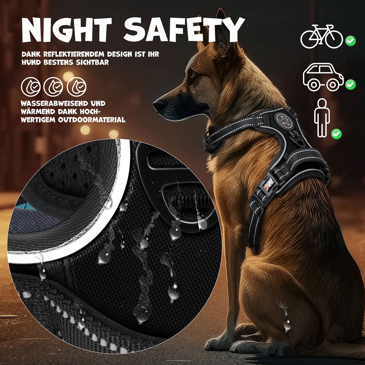 Ons anti-trektuig heeft een geavanceerd reflecterend ontwerp dat de zichtbaarheid van je hond 's nachts of bij weinig licht verbetert. Dit betekent dat je in het donker ontspannen kunt wandelen zonder dat je je zorgen hoeft te maken, want je hond is goed zichtbaar en de kans op ongelukken is daardoor aanzienlijk kleiner.
