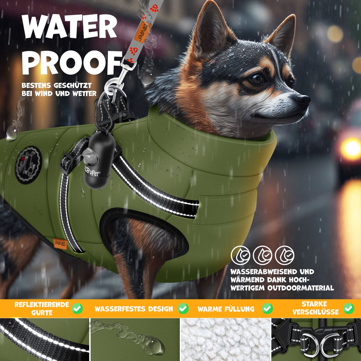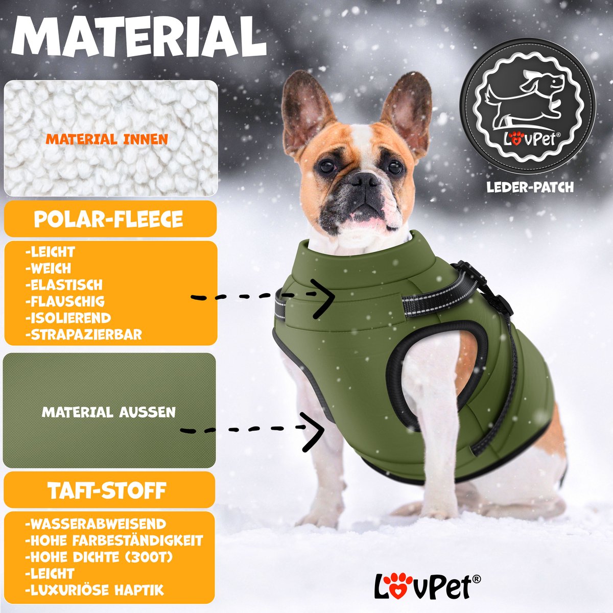 LovPet hondenjas gemaakt van polar fleece en taffeta stof, waterdicht ontwerp en sterke sluitingen, geschikt voor elke hondenmaat, verstelbaar en groeit dus met je hond mee, incl. 3x zakrollen en tag.