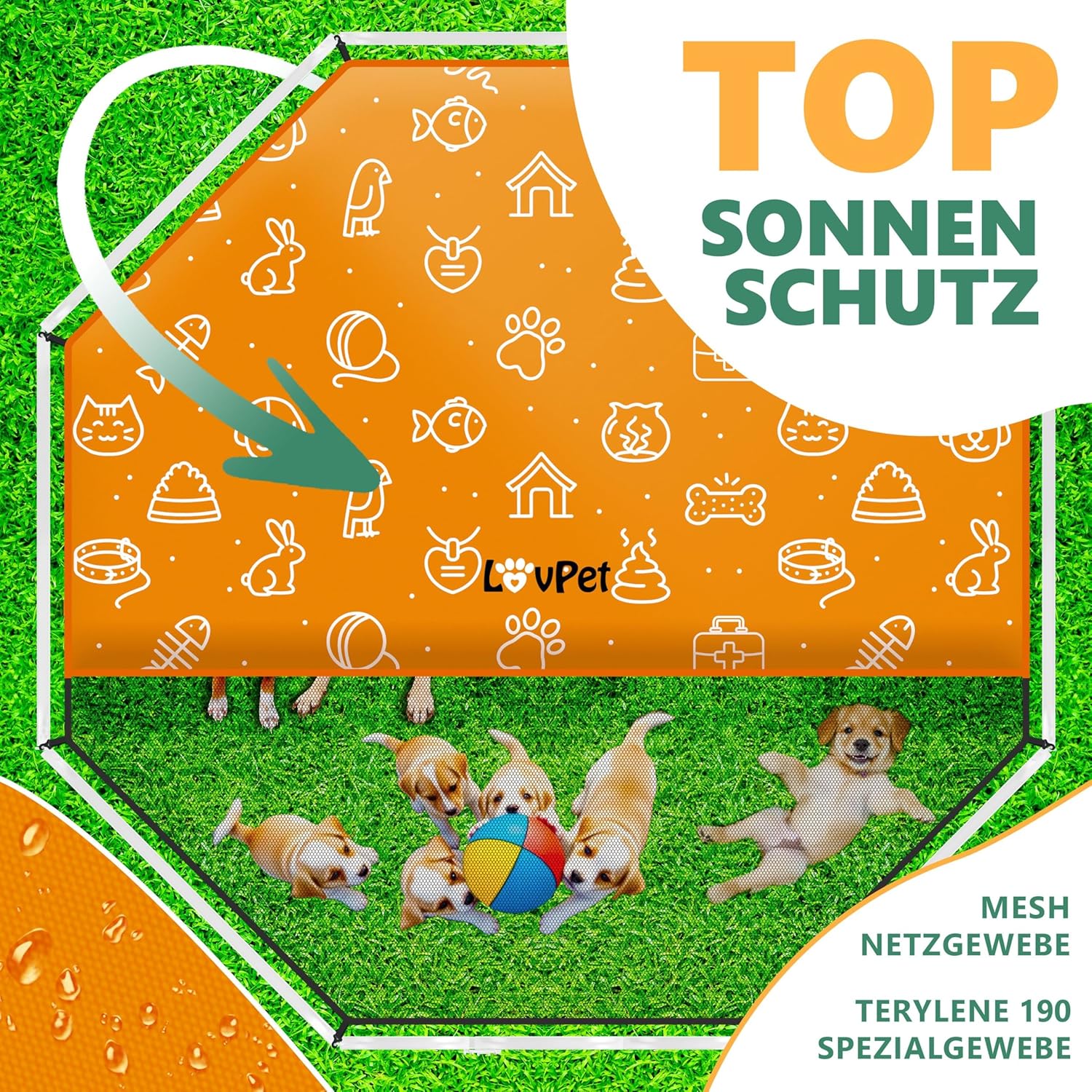 Voor extra bescherming op warme zomerdagen worden uw viervoeters beschermd met het zeil . Het mesh- doek en de speciale Terylene 190- stof zorgen voor een schaduwrijke en koele beschutting .
