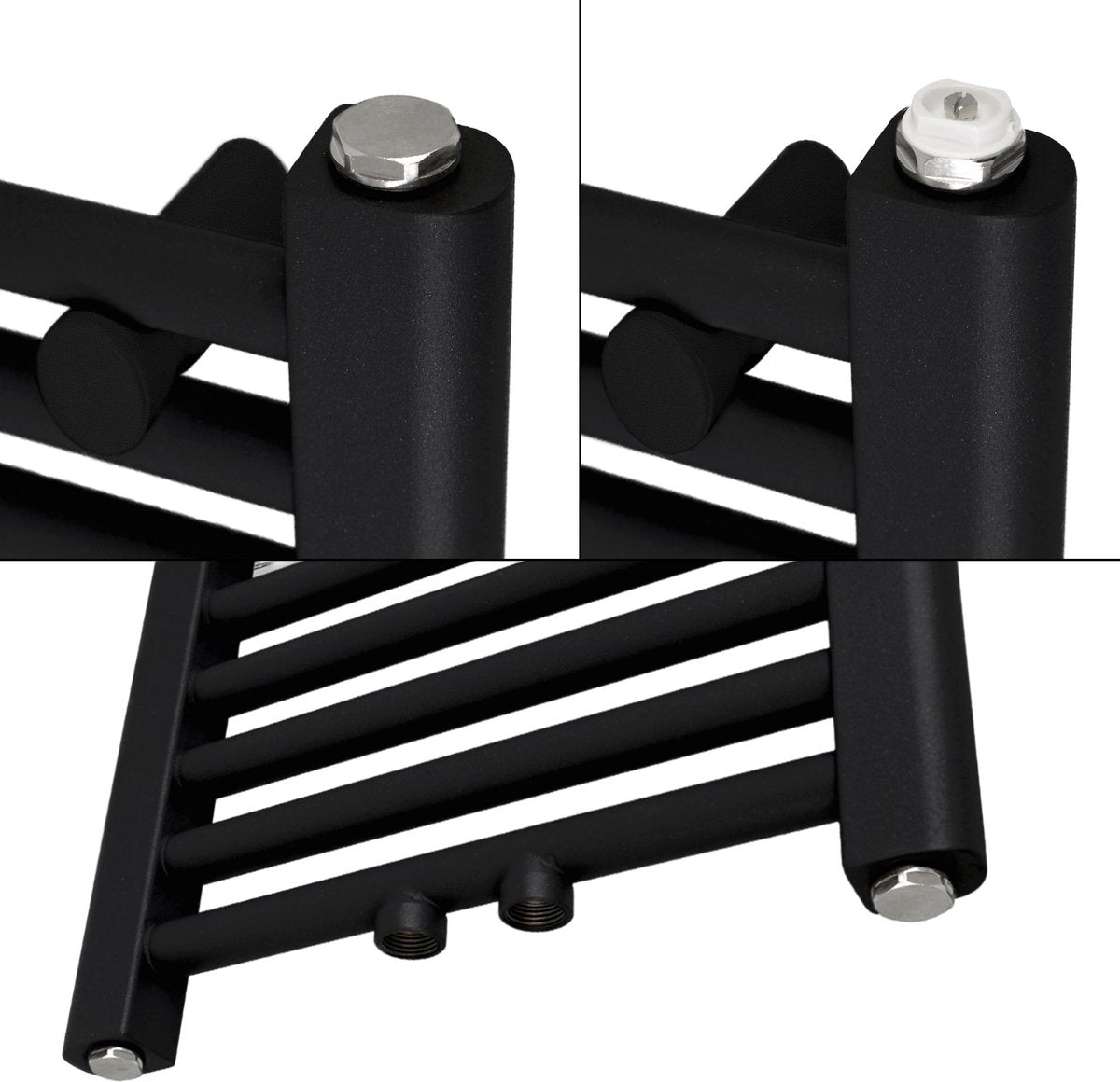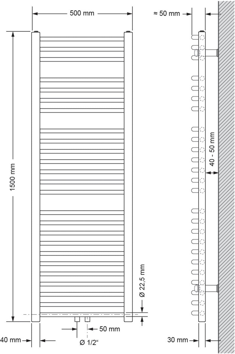 Technische gegevens: Type aansluiting: middenaansluiting Ontwerp: gebogen Kleur: mat zwart Materiaal: Staal Breedte: 500 mm Hoogte: 1500 mm Aansluitingen: 255 mm Diameter buis: Ø 22 Profiel (mm): 30*40*1,5 D Warmtevermogen: 570 W Warmtecapaciteit: 1944 BTU Watervolume: 6,26 liter Gewicht: 9,45 kg Maximale werkdruk: 10 bar (1 MPa) Testdruk: 12 bar (1,2 MPa) Verticale D-profielen: 30 x 40 x 1,5 mm Horizontale ronde buizen: 22 x 1,2 mm Afstand tot de muur: ca. 5 cm Voor buisdiameter: 18 tot 22 mm Voor buisafstand: 18 tot 22 mm Diepte (wand tot hart buis): 75 tot 100 mm Diepe muurpluggen zijn