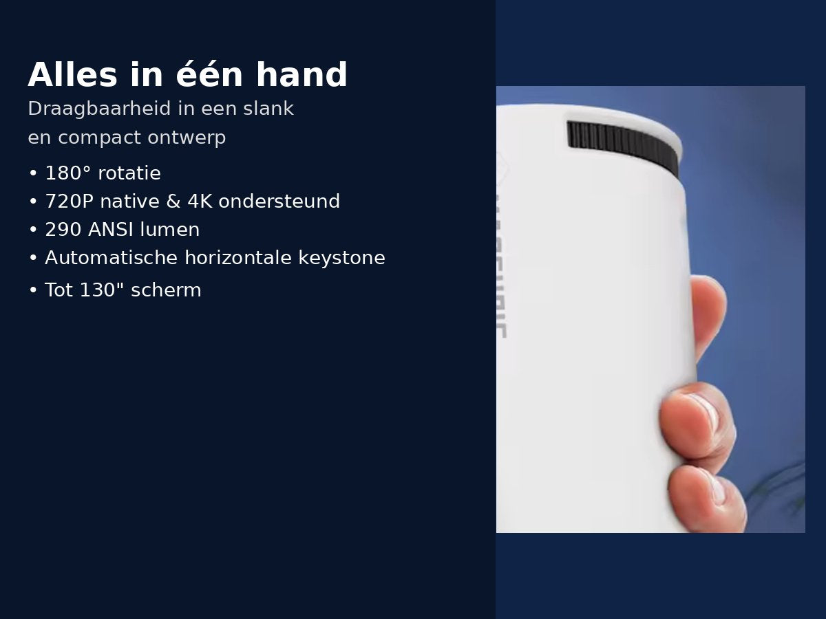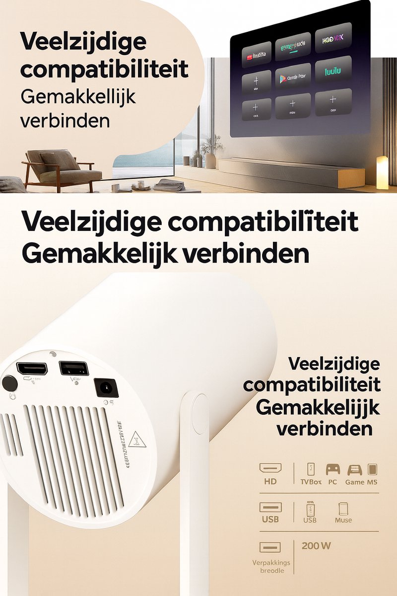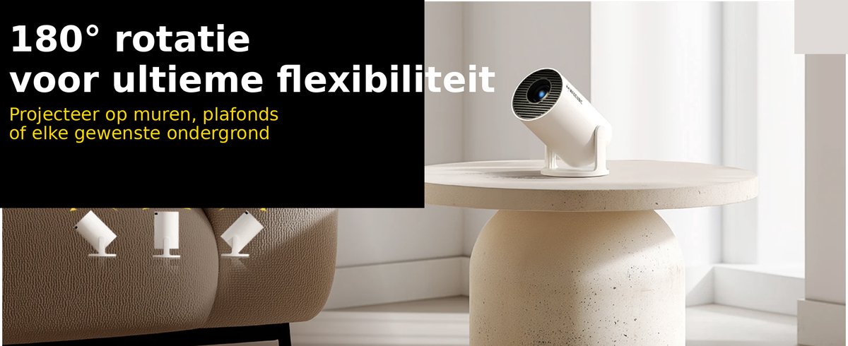 Flexibel & draagbaarMet een 180° verstelbare projectiehoek bepaal jij zelf waar je projecteert: op het plafond, de muur of zelfs op de vloer. Het compacte ontwerp past in één hand en maakt de HY300 Pro ideaal voor gebruik onderweg.