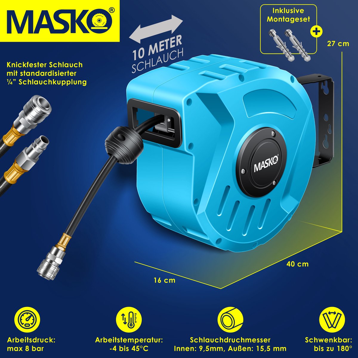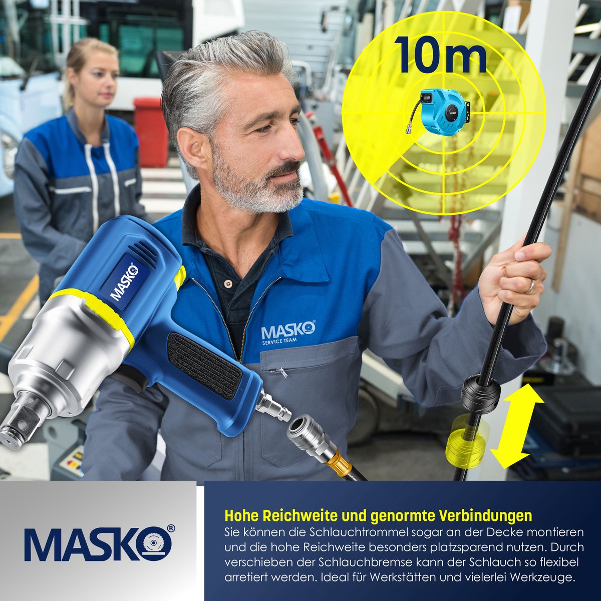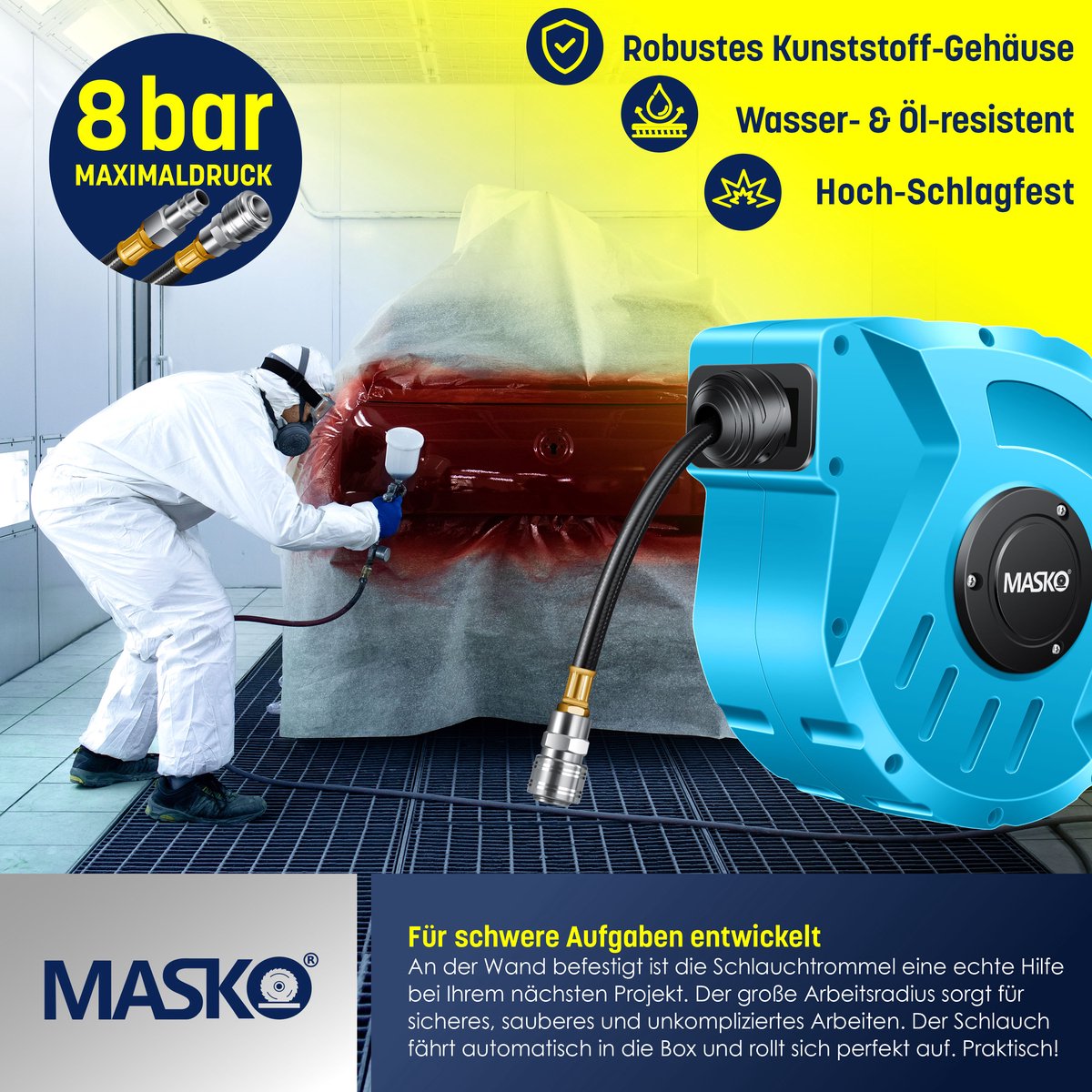 Of het nu in een professionele werkplaats, garage, hobbykelder, op de boerderij of in de tuin is - met de MASKO automatische luchtslangoproller gaat het werk moeiteloos. Met onze slangen van 10m - 30m hoeft u de compressor nooit meer te verplaatsen en heeft u voldoende bereik om ideaal te kunnen werken.