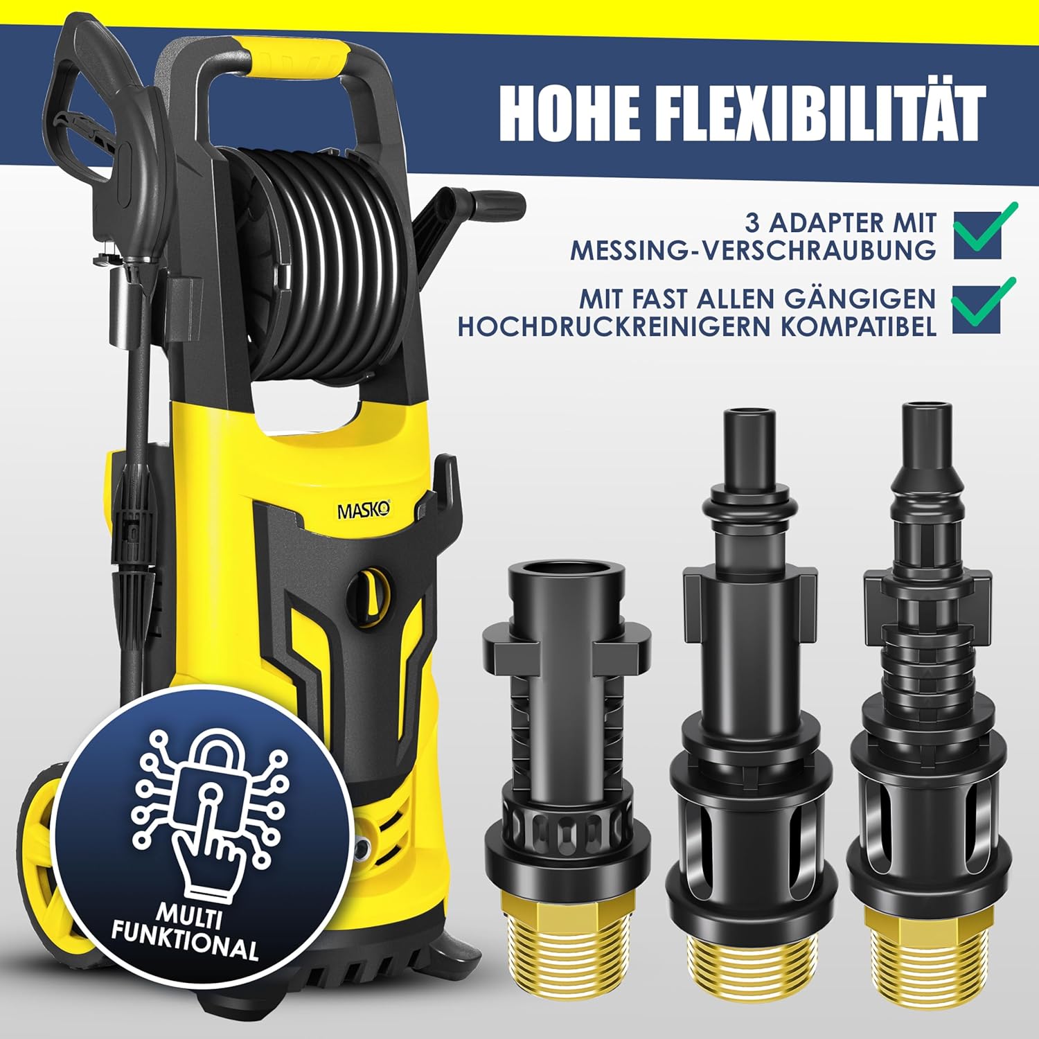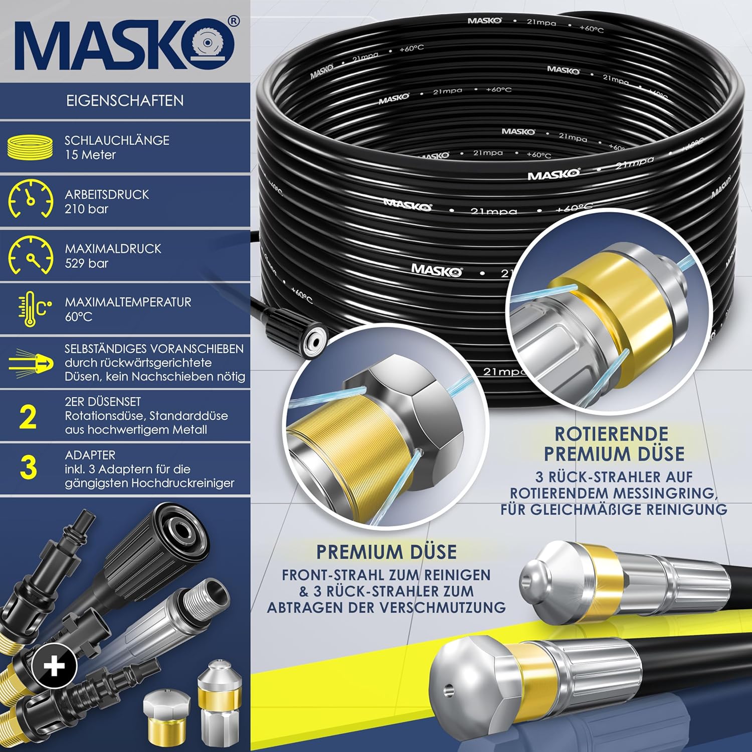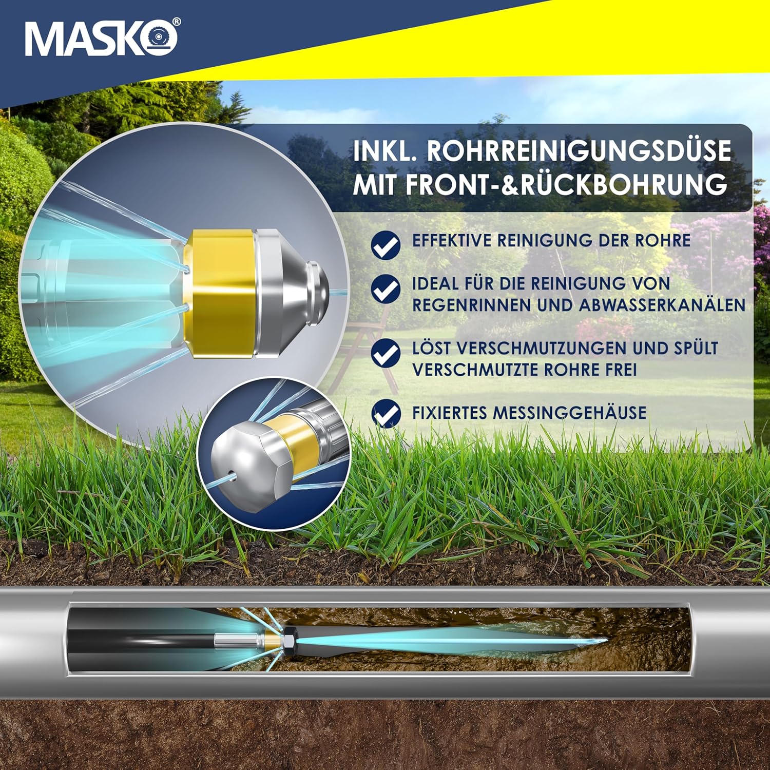 Bovendien beschikt onze premium pijpreinigingsset over een los- en afvoermondstuk en een roterend mondstuk voor een gelijkmatige reiniging. Dankzij de 3 adapters met een hoogwaardige messing schroefverbinding is de buisreinigingsslang compatibel met bijna alle gangbare hogedrukreinigers.