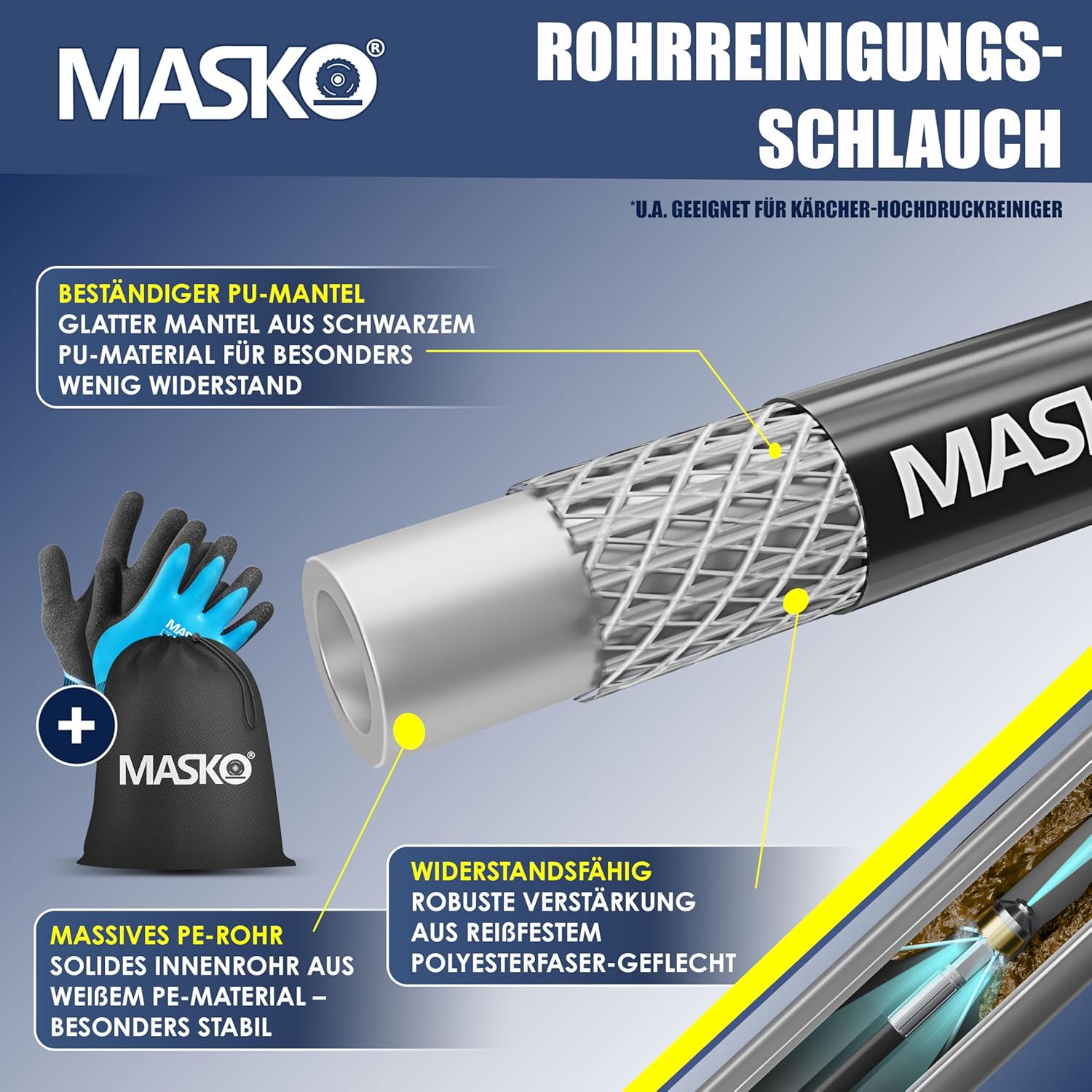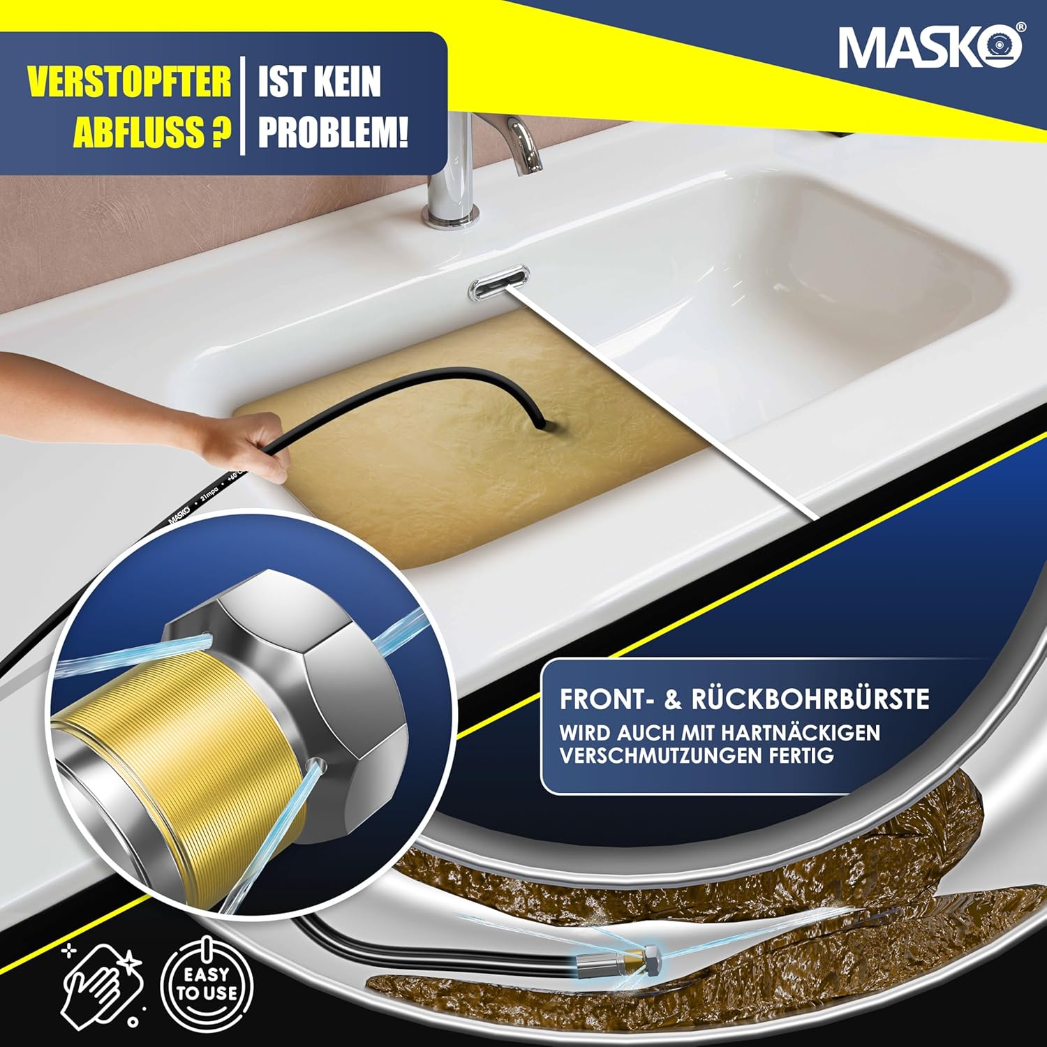 Is je toilet weer verstopt? Verstopte afvoer? Geen probleem! Vooral in oude gebouwen kunnen buizen tegenwoordig vaak zitten. Met de buisringspiraal van Masko krijg je dankzij de hoge maximale druk en de maximale buizen verstopte en verontreinigde buizen in een handomdraai weer vrij. Onze buisreinigingsslang is dankzij de voor- en achterboorborstel ook klaar met hardnekkig, vastzittend vuil.