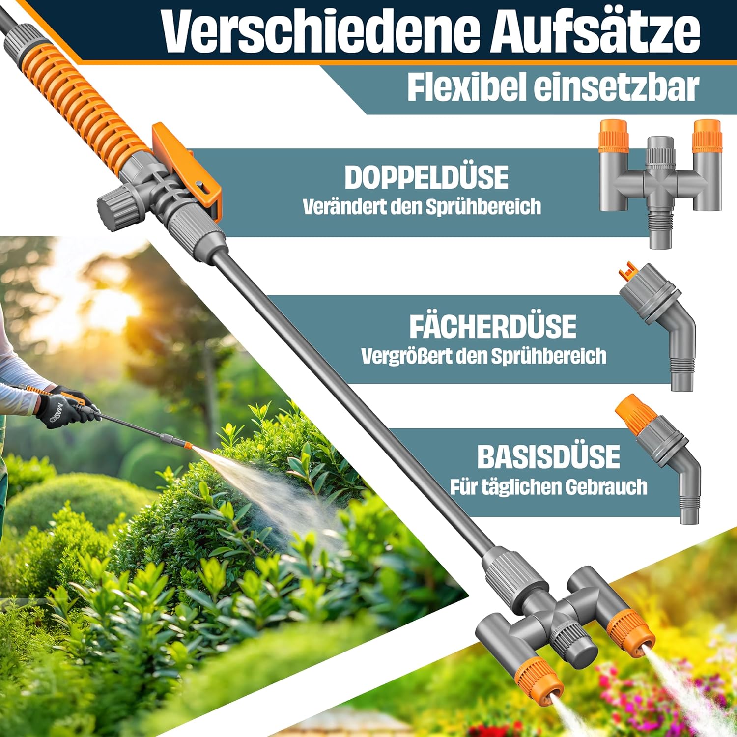Verstelbare sproeikop en 3 opzetstukken: dankzij het basis-, dubbele en waaiermondstuk past de druksproeier zich optimaal aan elke toepassing aan, van nauwkeurige straal tot grote verneveling, individueel instelbaar met een paar eenvoudige stappen.