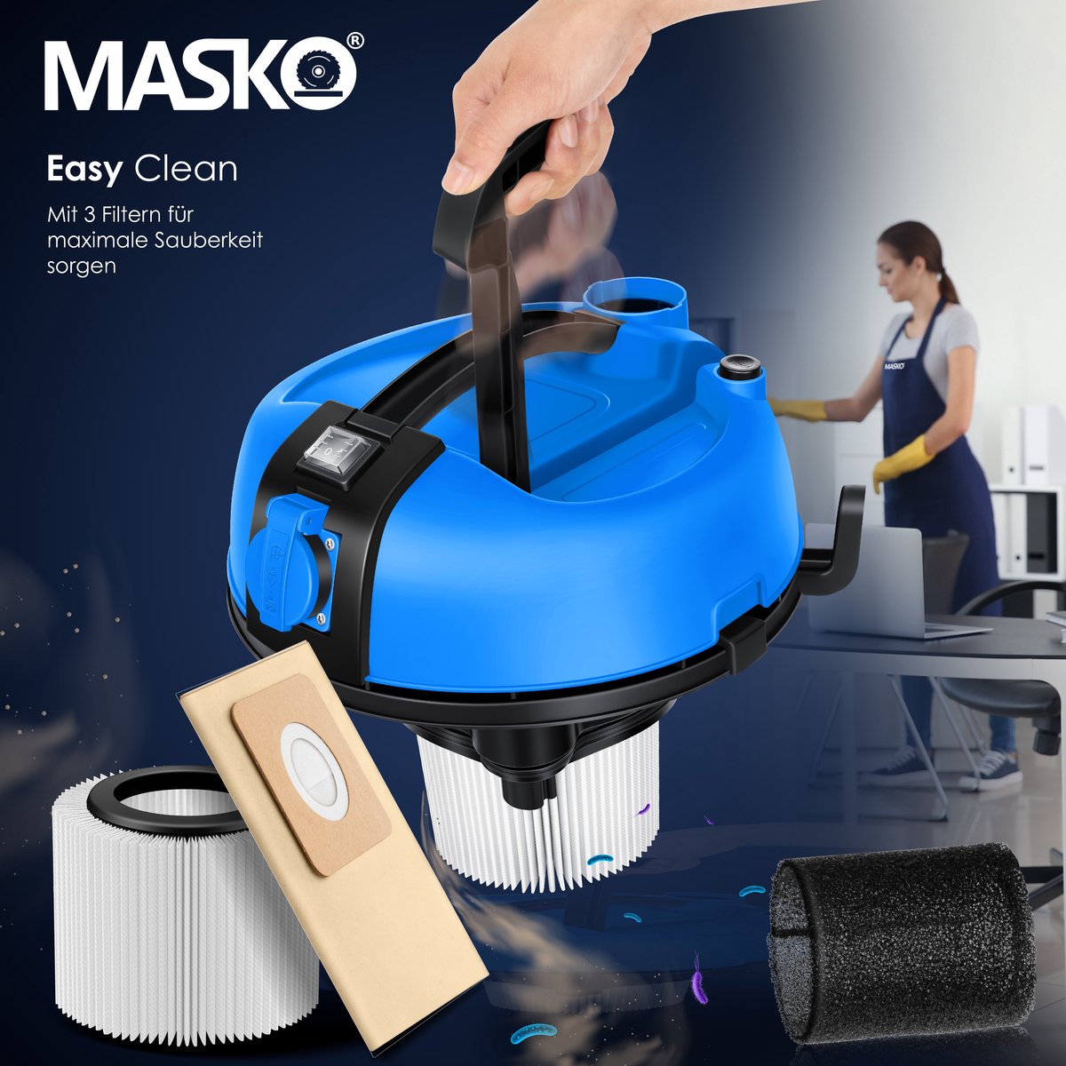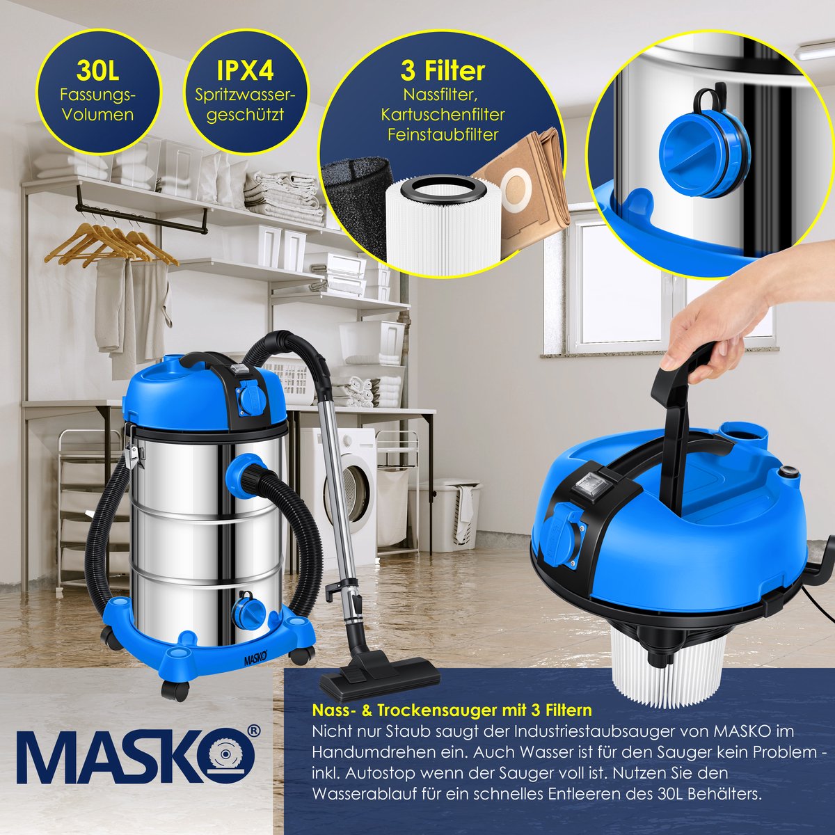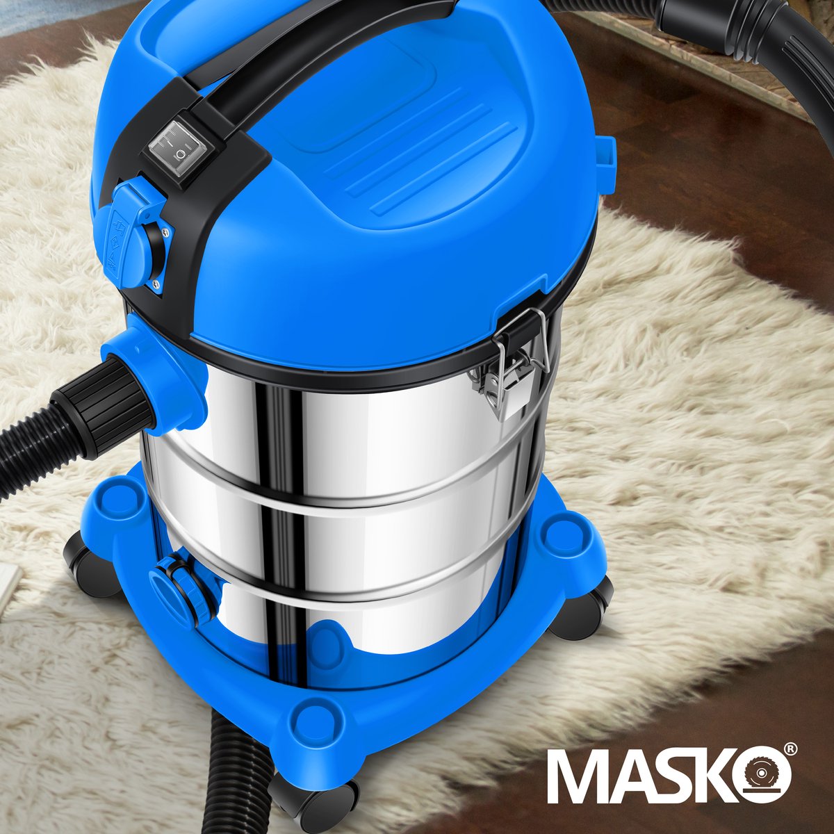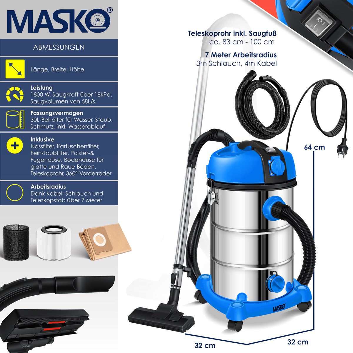 Water, stof en vuil zijn geen uitdaging voor de krachtige stofzuiger van het merk MASKO. Dankzij de meegeleverde kierenborstel, het vloermondstuk voor ruwe en gladde oppervlakken en de werkradius van 7 m op soepele easy-roll wielen heb je geen problemen met schoonmaken in elke situatie .
