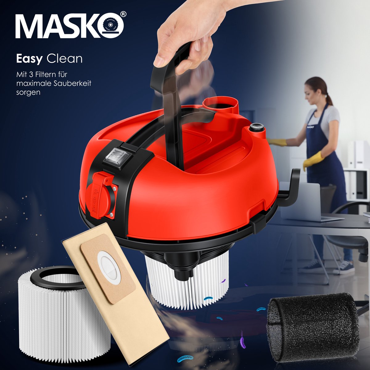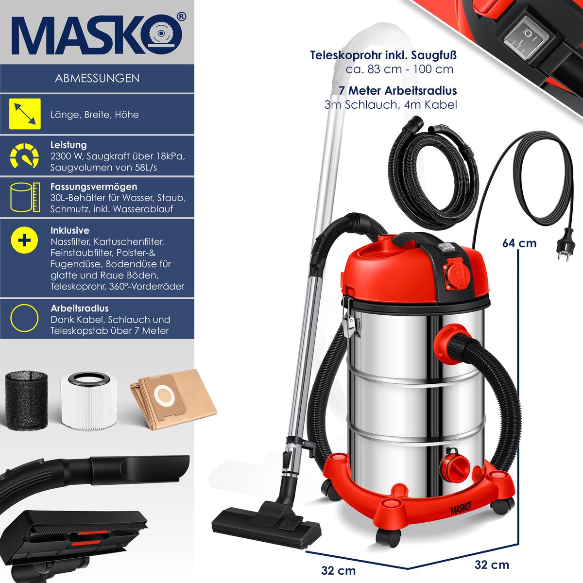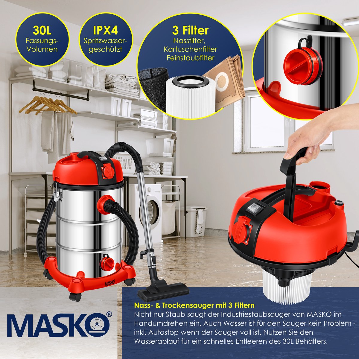 MASKO industriële stofzuiger K-606S met het "Push&Clean" filterreinigingssysteem, te gebruiken als droogzuiger met zak en filter en als waterzuiger zonder zak, 2300W maximaal vermogen