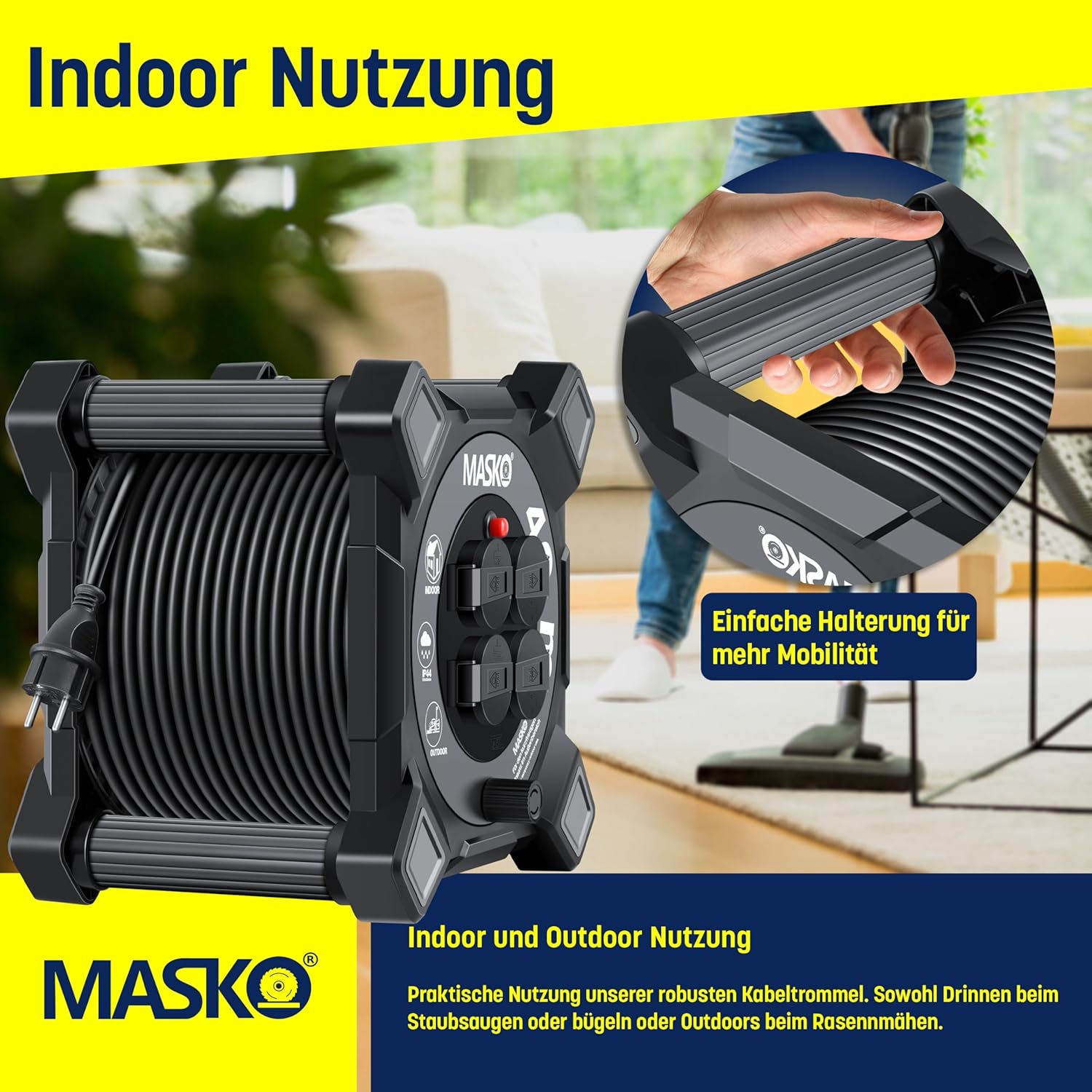 • Veelzijdig inzetbaar: verkrijgbaar in verschillende lengtes van 20 m tot 50 m, past de Masko kabelhaspel zich aan je individuele behoeften aan. Hij is perfect geschikt voor doe-het-zelfprojecten, tuinieren en professionele toepassingen. Of het nu gaat om stofzuigen, strijken of grasmaaien, deze kabelhaspel biedt je altijd de nodige flexibiliteit en bereik om je werkzaamheden efficiënt en veilig uit te voeren.
