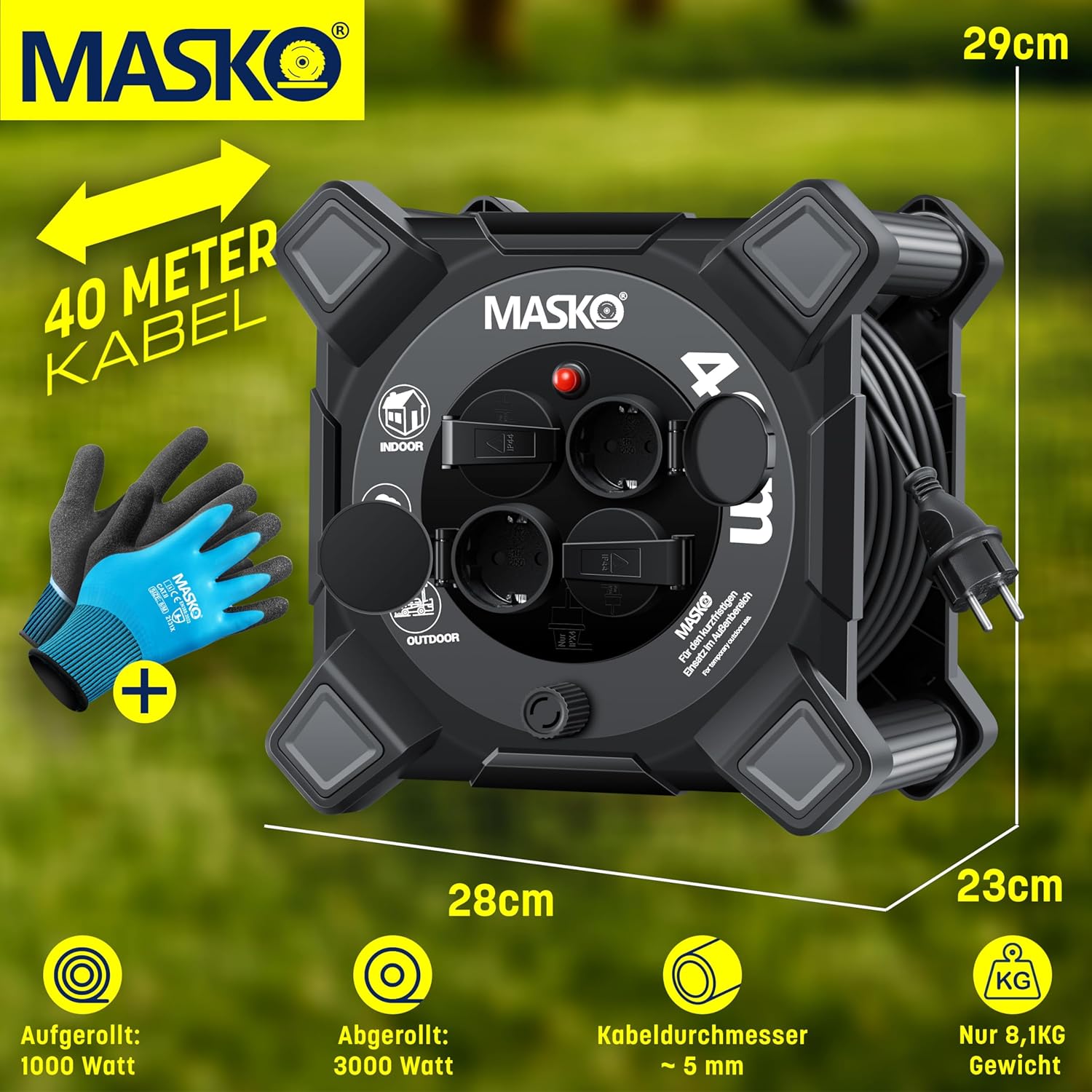 Lieferumfang: • 1x MASKO Kabeltrommel • 1x Paar Arbeitshandschuhe • 1x Bedienungsanleitung