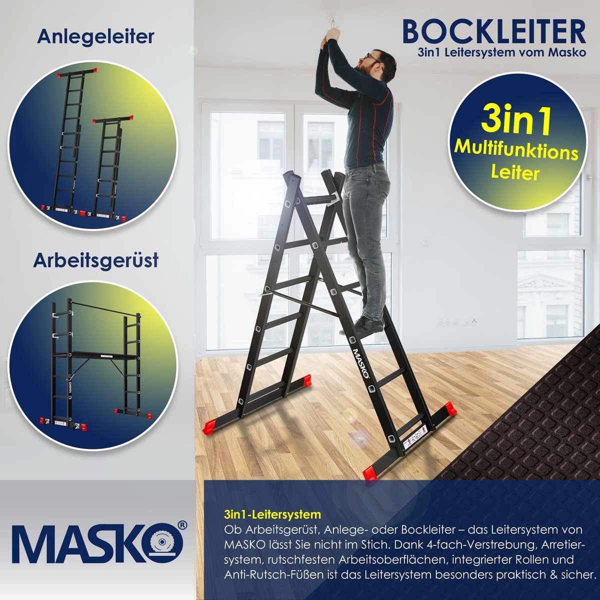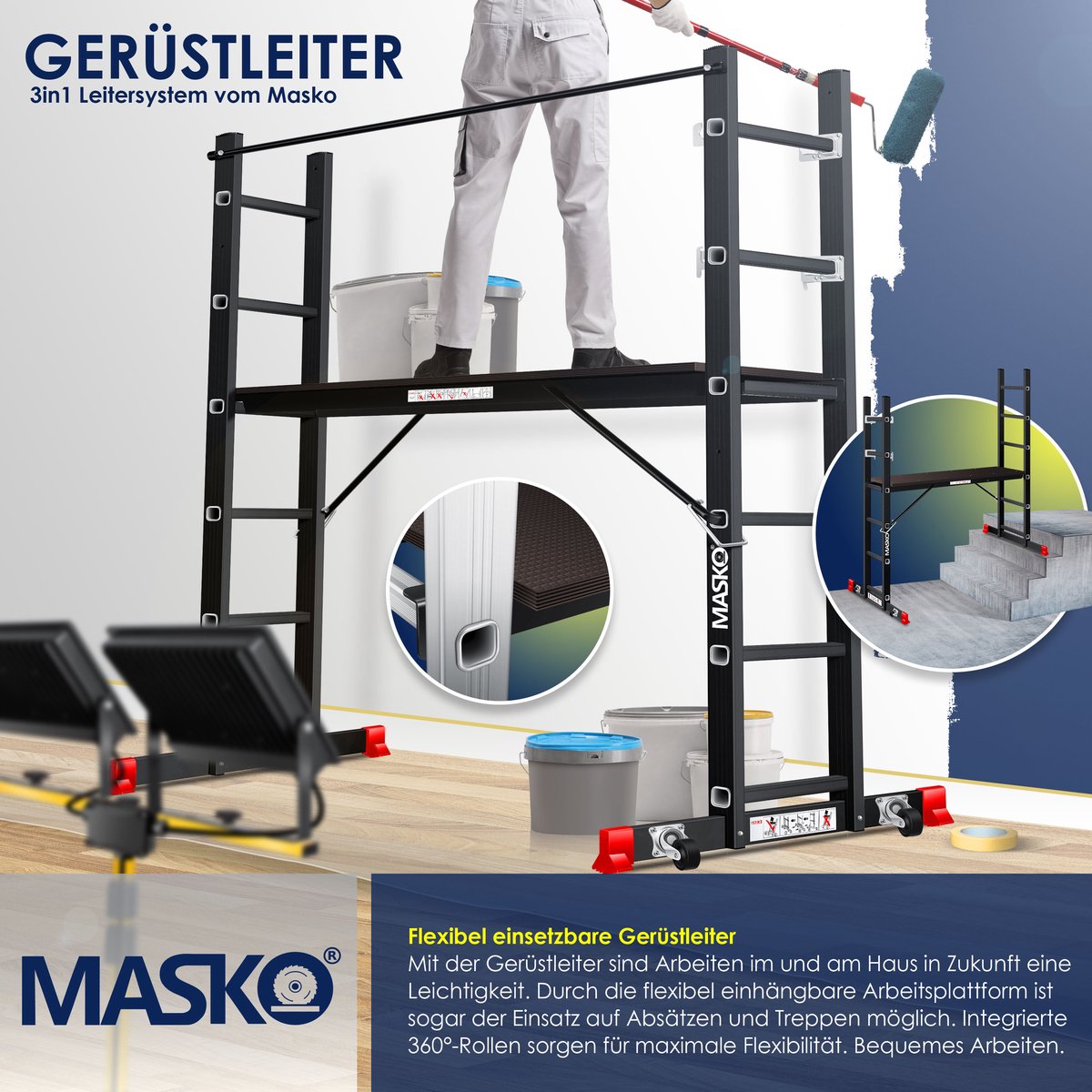 Met een Masko® aluminium steiger kiest u niet alleen voor een echte allrounder, maar ook voor een universele helper. De grote multifunctionele ladder kan gebruikt worden als steiger, trappentoren of trapladder. Een ander hoogtepunt is de hoge stabiliteit en het houten werkplatform met speciale coating (antislip), die je veiligheid garanderen. De steiger kan worden ingeklapt om ruimte te besparen en is daarom ook gemakkelijk te vervoeren.