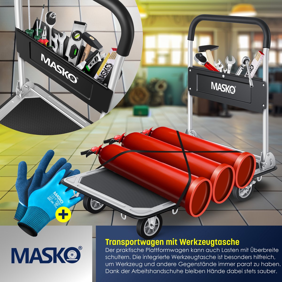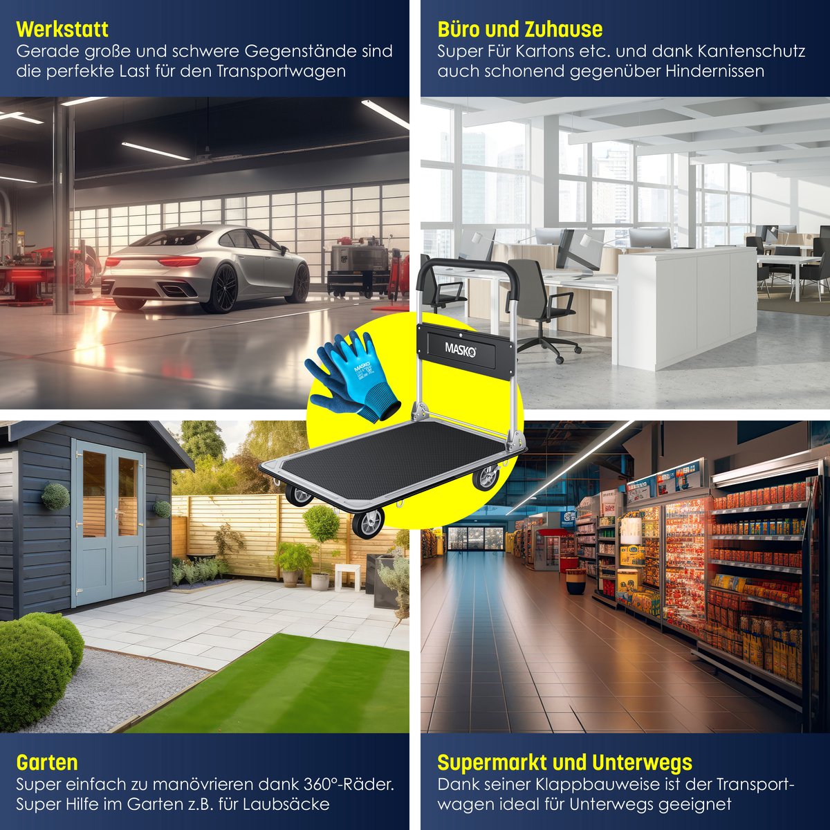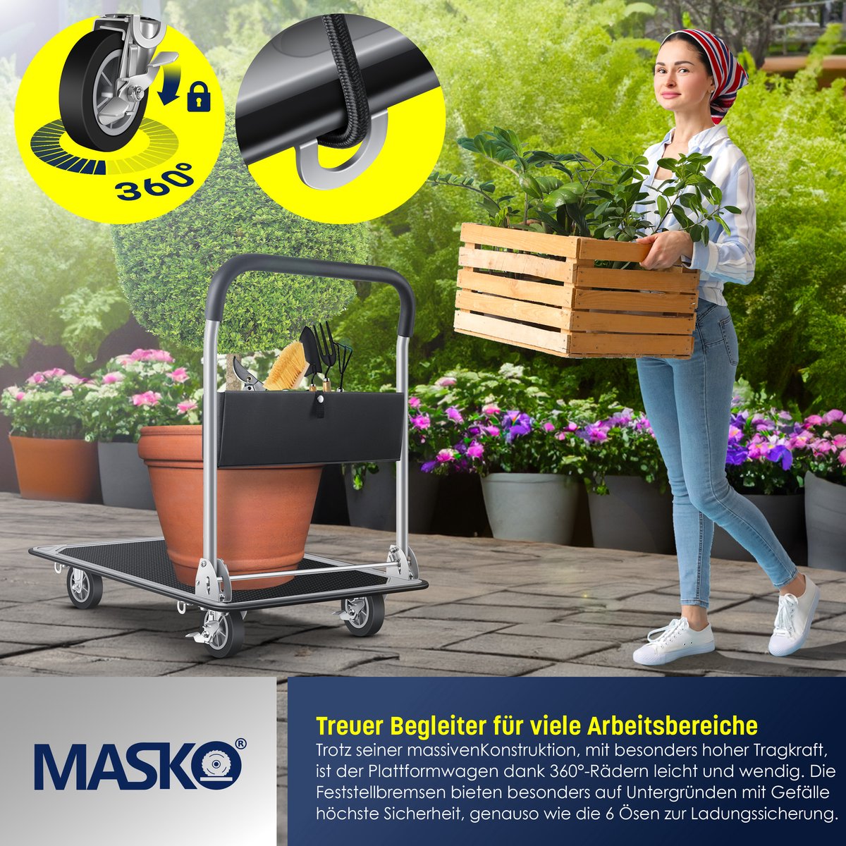De MASKO platformwagen combineert compacte inklapbaarheid, een robuust stalen frame, veilige ladingbeveiliging en eenvoudige wendbaarheid in een praktisch transportmiddel.