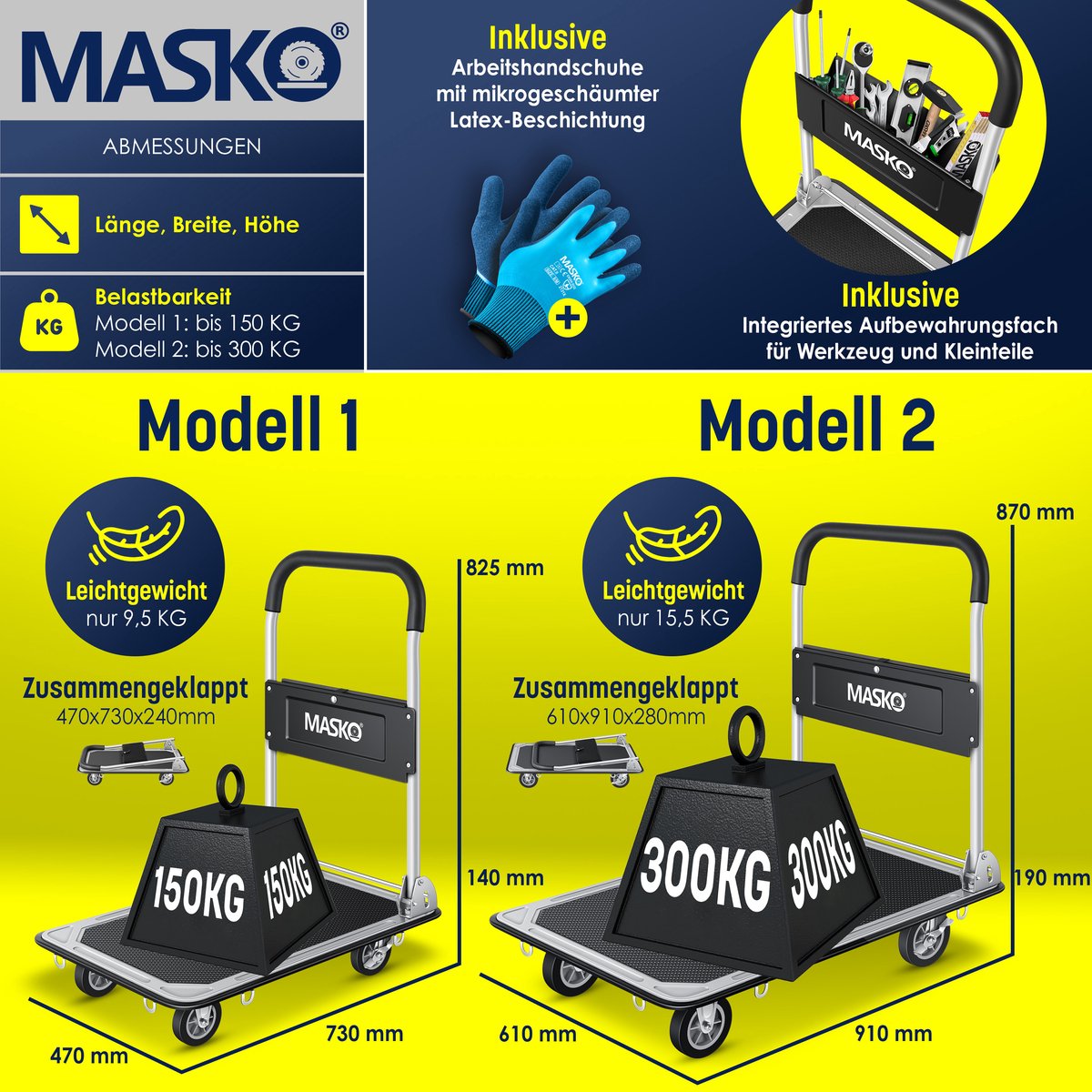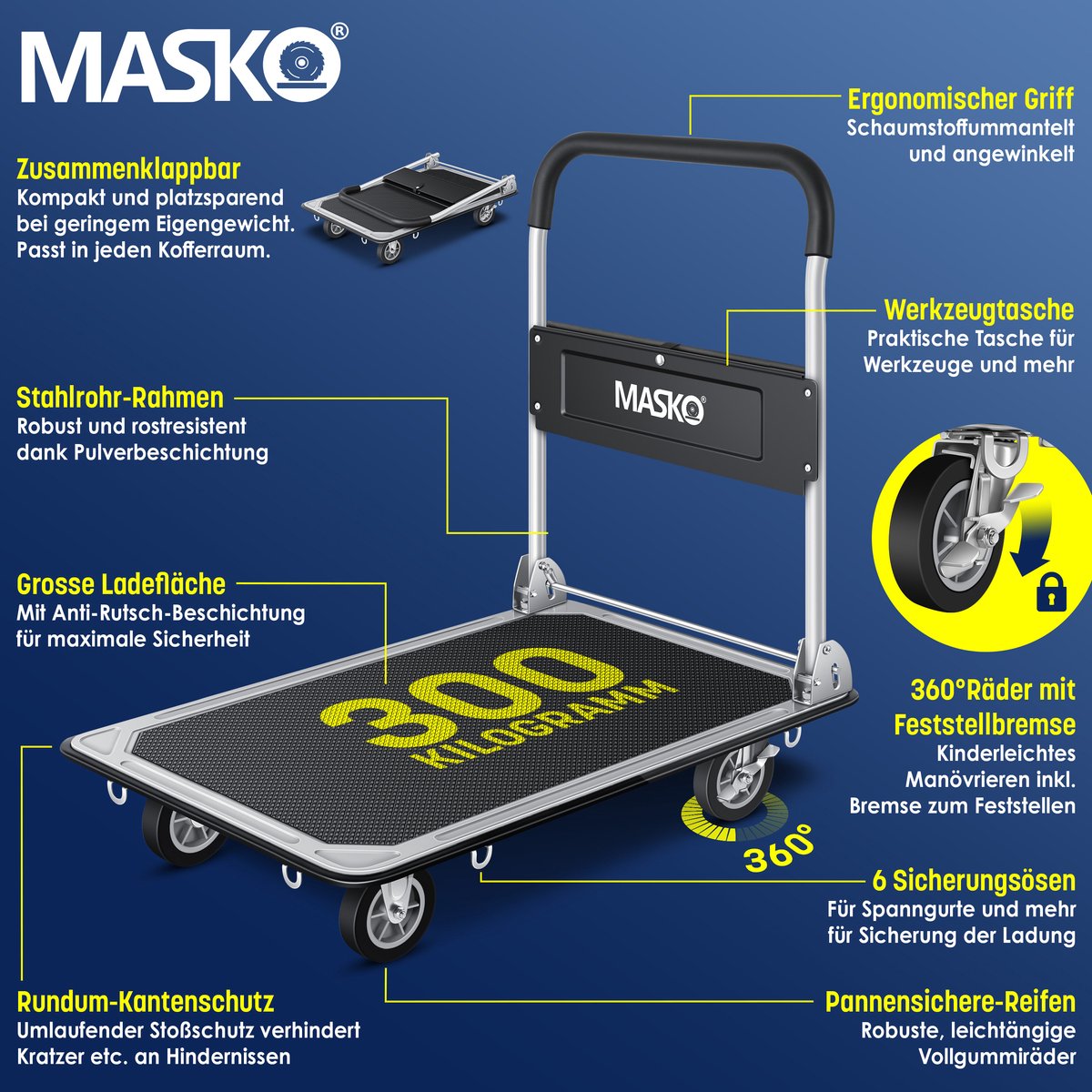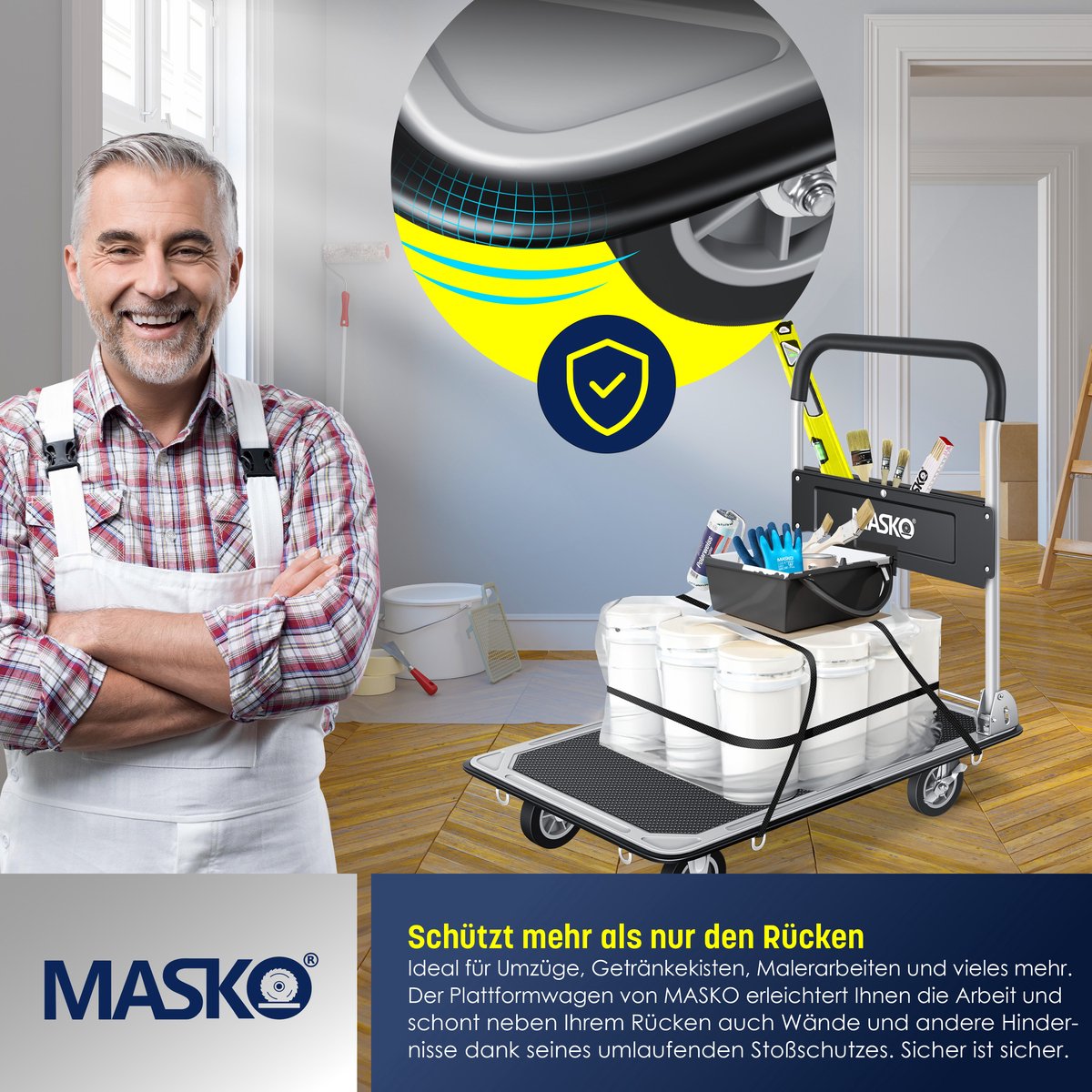 De MASKO platformwagen combineert compacte inklapbaarheid, een robuust stalen frame, veilige ladingbeveiliging en eenvoudige wendbaarheid in een praktisch transportmiddel.