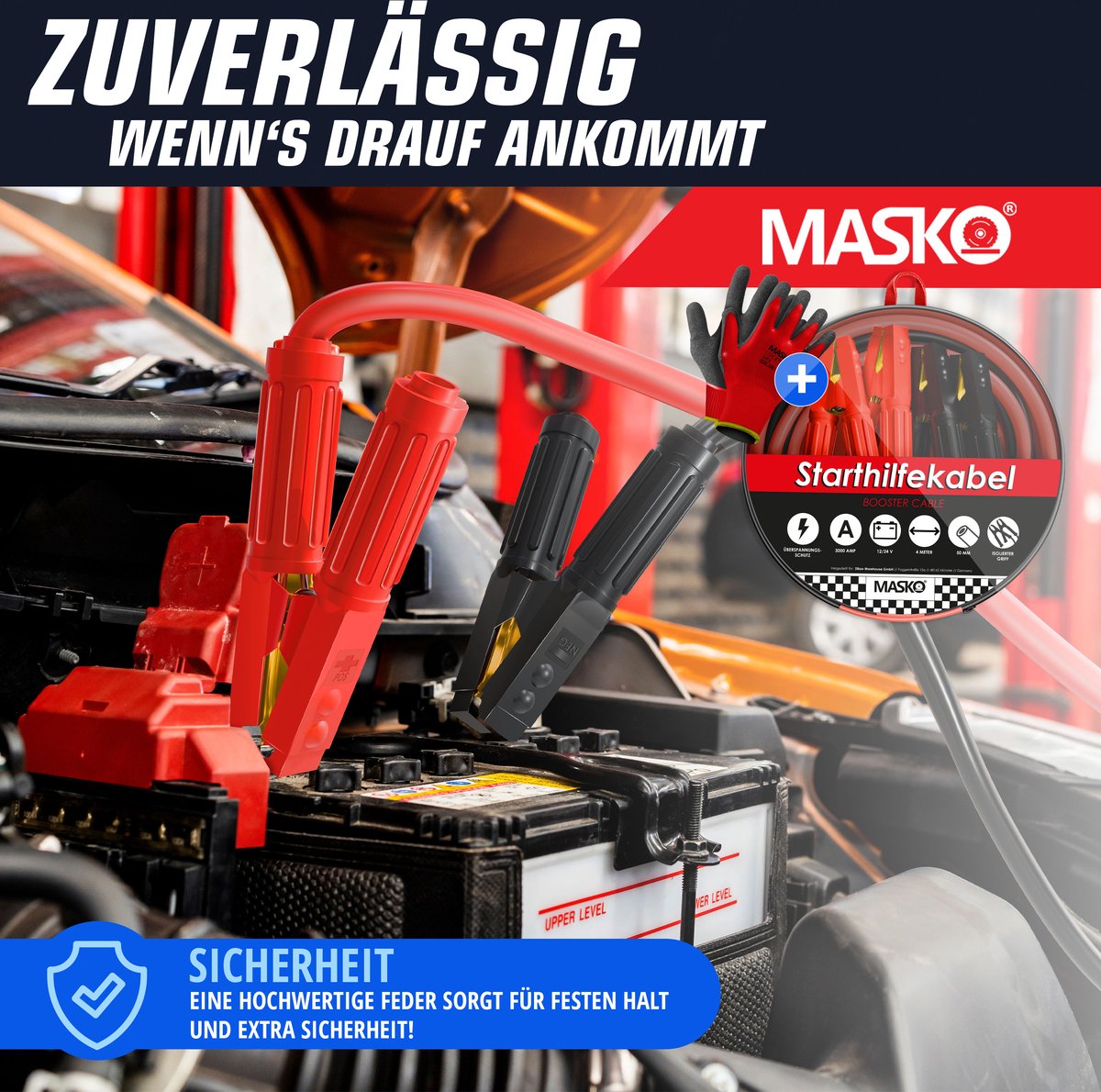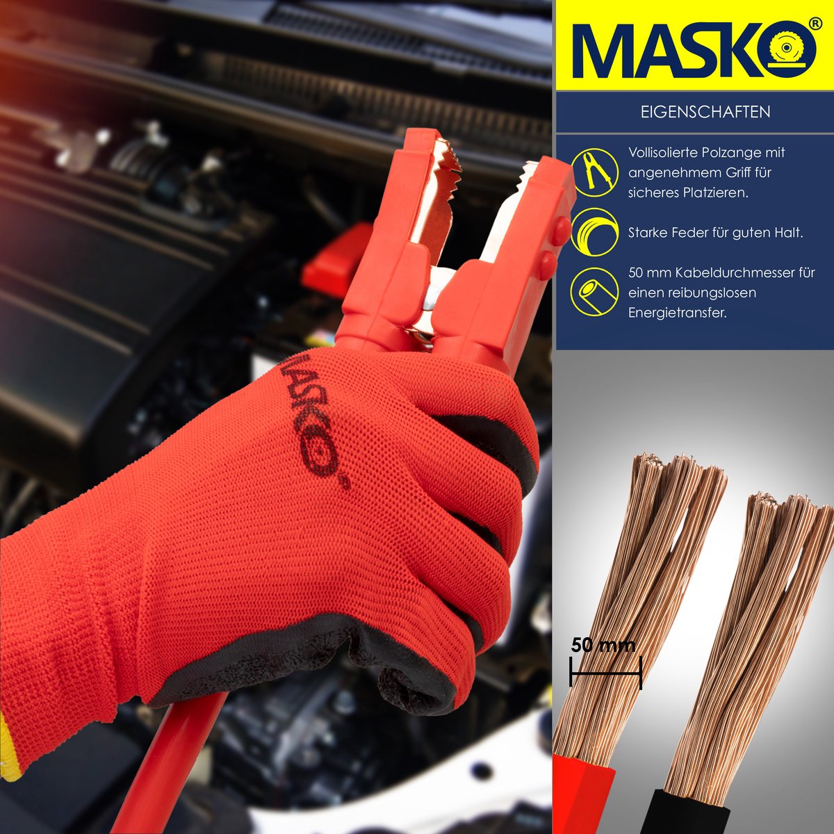 MASKO startkabels met overspanningsbeveiliging, volledig geïsoleerde poolklemmen met comfortabele grip, verkoperd aluminium en soepele krachtoverbrenging.