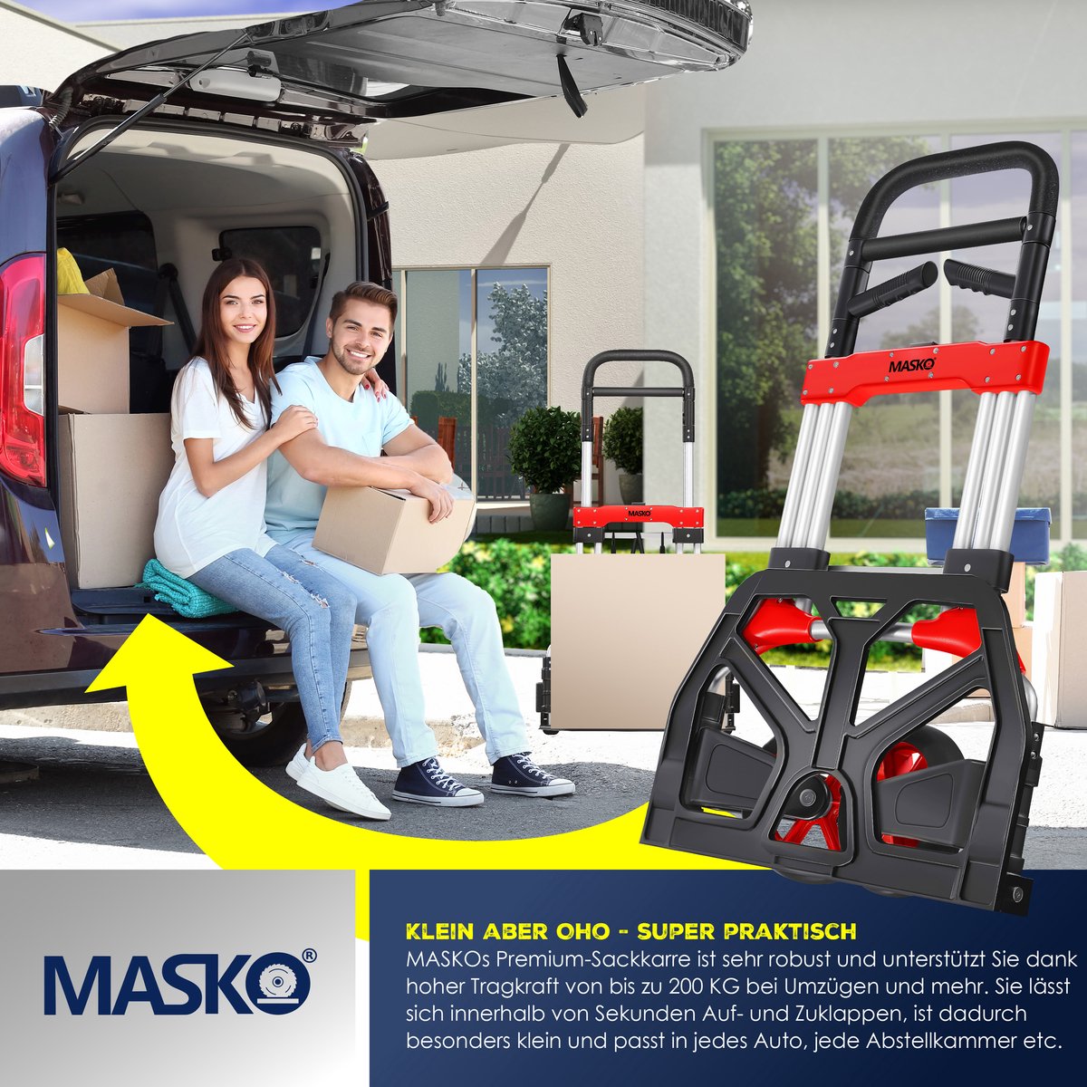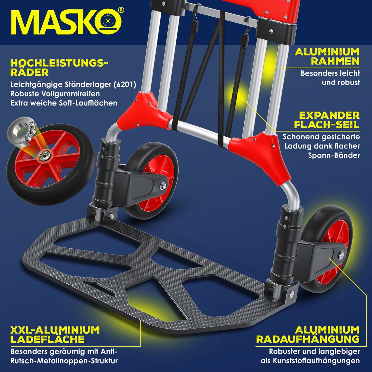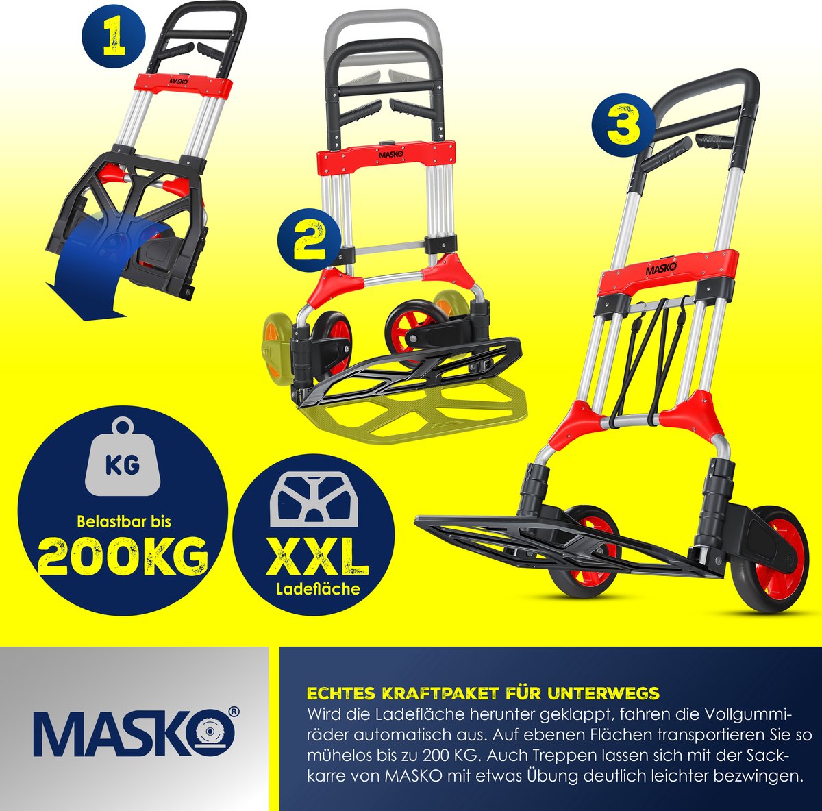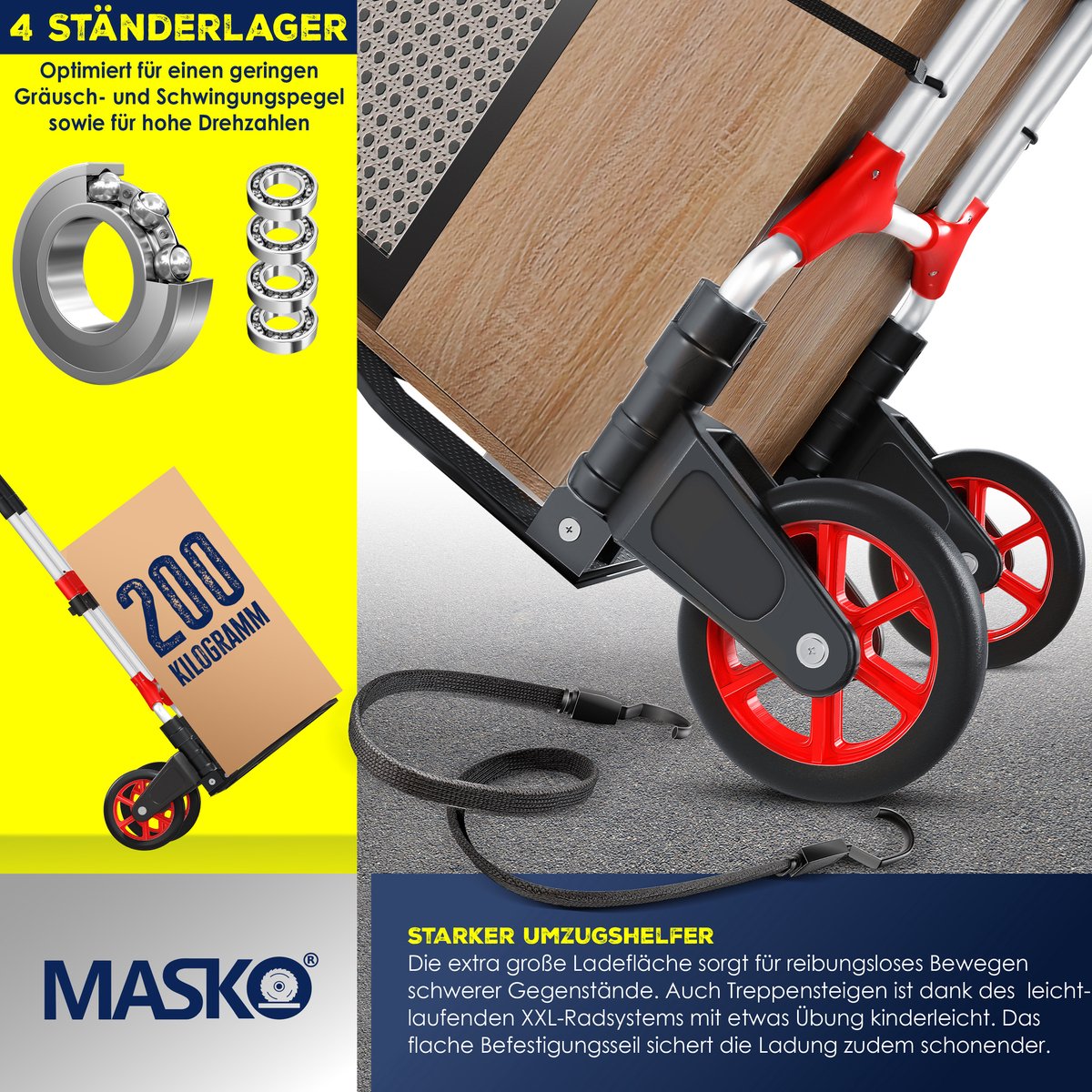De MASKO zakwagen Pro biedt een robuuste constructie, tot 200 kg draagvermogen, ruimtebesparend inklappen, veilig uittrekkoord, antislip laadvlak, vergrendelbare telescoopgreep en een moeiteloos XXL-wielsysteem - een perfecte metgezel voor eenvoudig en veilig transport.