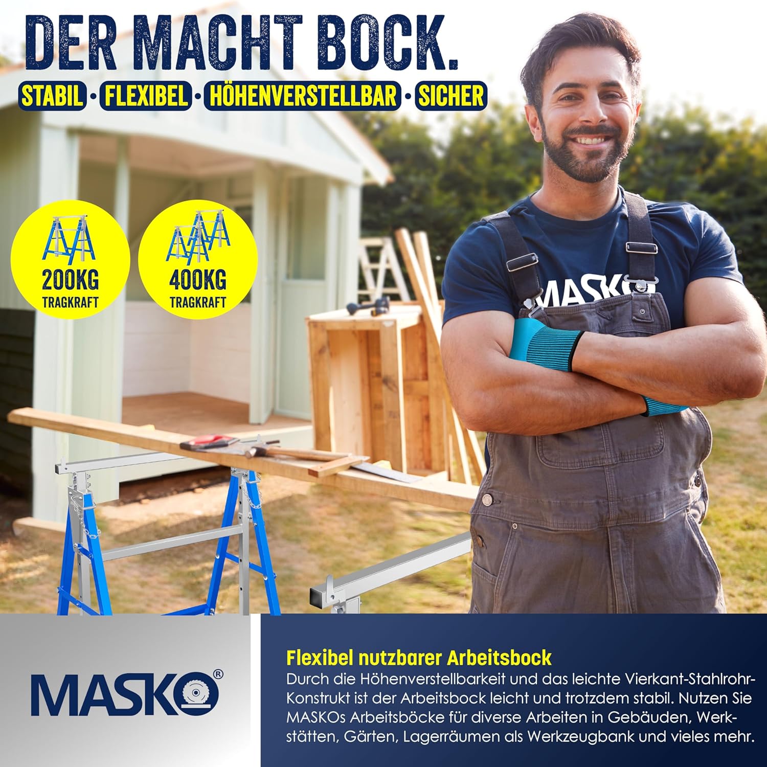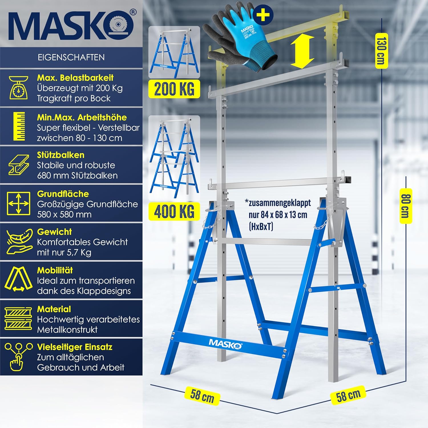 De telescopische werkbok MASKO overtuigt door zijn hoge draagvermogen, flexibele hoogteverstelling (80-130 cm), lichtgewicht ontwerp en robuuste metalen constructie voor veelzijdige toepassingen. Inclusief werkhandschoenen.