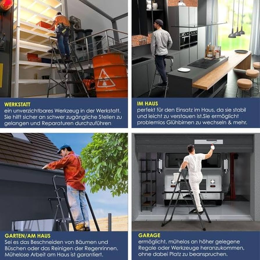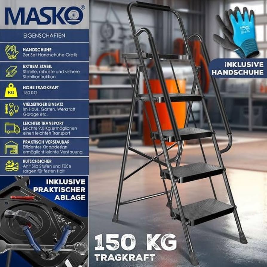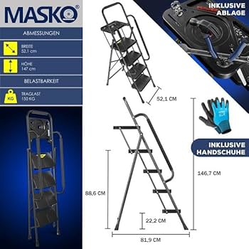 • Veelzijdige toepassing: de MASKO trapladder is de ideale hulp voor diverse taken in huis, tuin, werkplaats en garage. Het maakt veilig werken op moeilijk bereikbare plaatsen mogelijk, zoals bij het vervangen van gloeilampen, het snoeien van bomen, het reinigen van de regengoten of werken op hoge planken. Met een belastbaarheid van maximaal 150 kg biedt hij de nodige stabiliteit en veiligheid voor al je projecten.