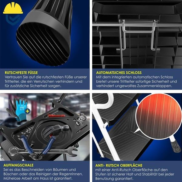 • Veilig en stabiel: de MASKO trapladder biedt een robuuste stalen constructie die tot 150 kg kan dragen, en garandeert daardoor maximale veiligheid. Antislip-treden en voeten zorgen voor een stevige grip op elk oppervlak. Het geïntegreerde automatische slot voorkomt onbedoeld inklappen en biedt extra veiligheid, zodat je bij elke taak veilig en stabiel kunt werken, of het nu in huis, tuin, werkplaats of garage is.