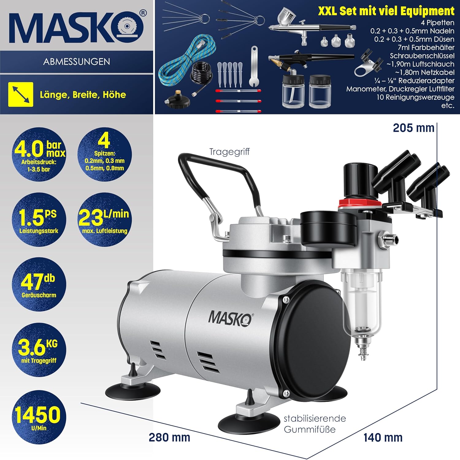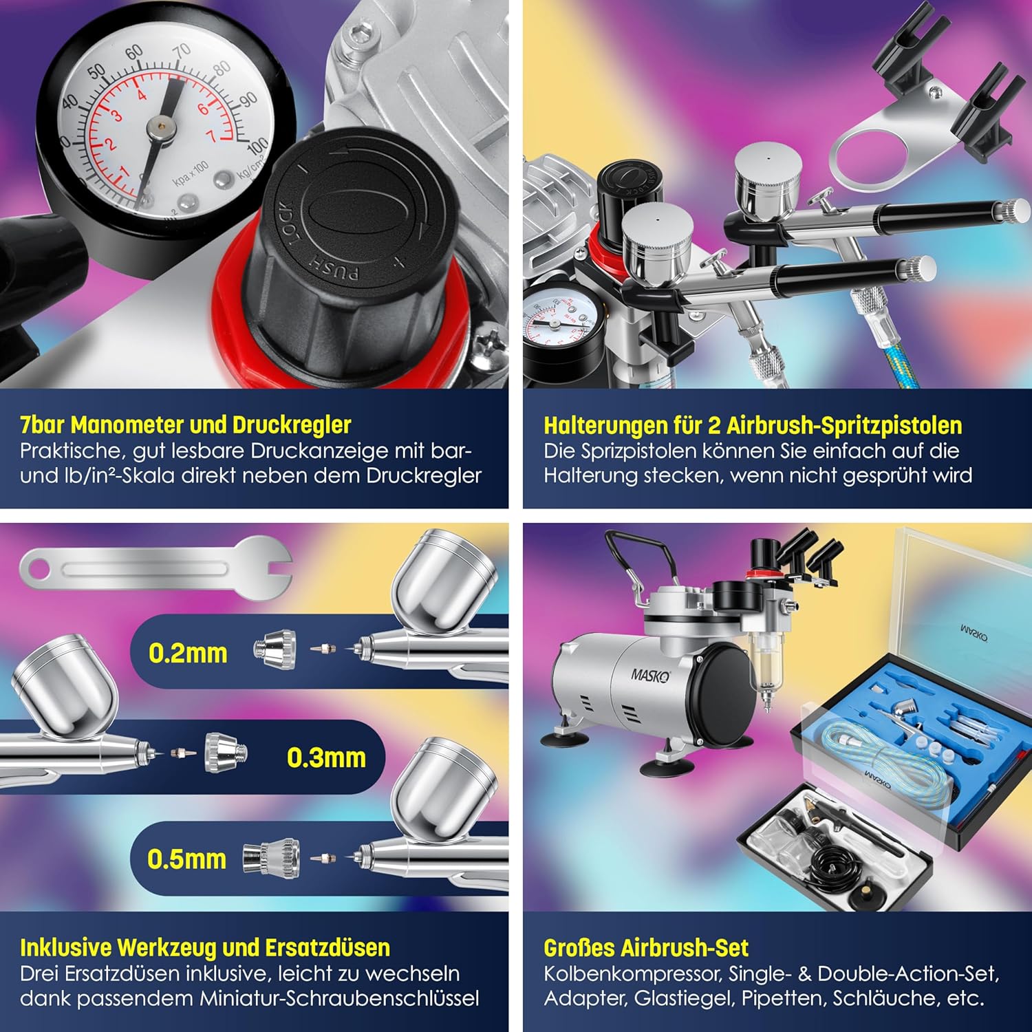 MASKO® Airbrush-set met compressor 4 bar incl. airbrush-pistolen | lakpistool complete set tattoo kunst schilderij | naalden & spuitmonden in accessoires | multifunctionele dubbele set met manomter en