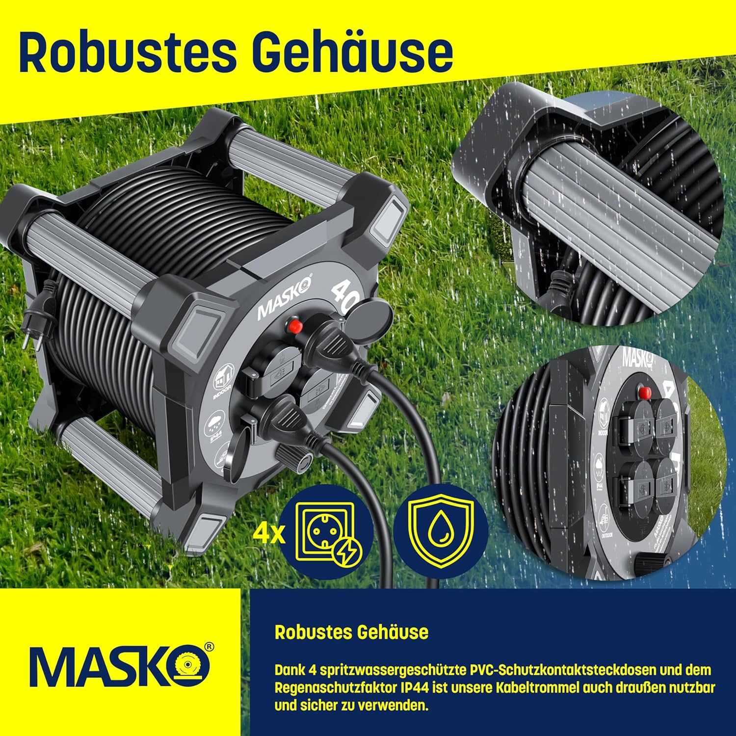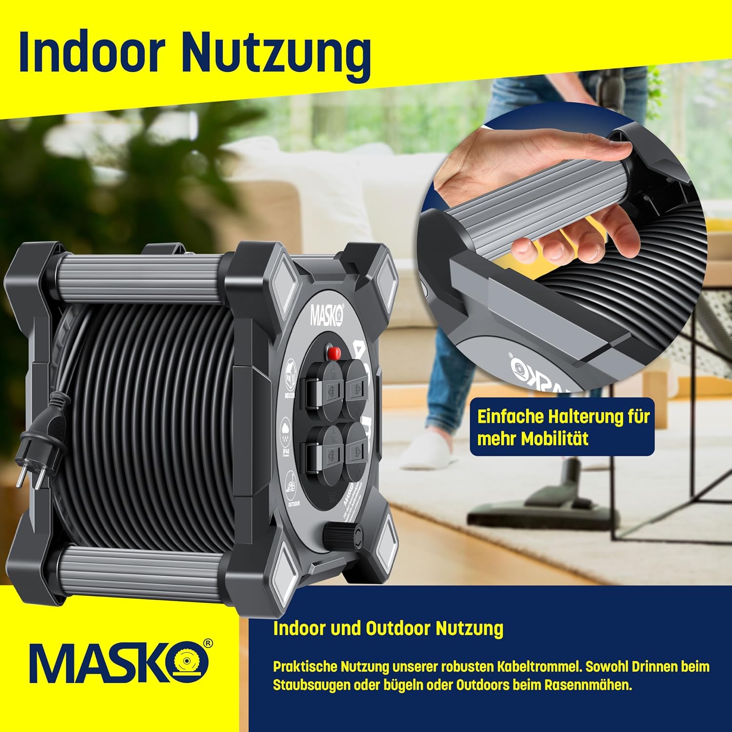 Veelzijdig inzetbaar: verkrijgbaar in verschillende lengtes van 20 m tot 50 m, past de MASKO kabelhaspel zich aan je individuele behoeften aan. Hij is perfect geschikt voor doe-het-zelfprojecten, tuinieren en professionele toepassingen. Of het nu gaat om stofzuigen, strijken of grasmaaien, deze kabelhaspel biedt je altijd de nodige flexibiliteit en bereik om je werkzaamheden efficiënt en veilig uit te voeren.