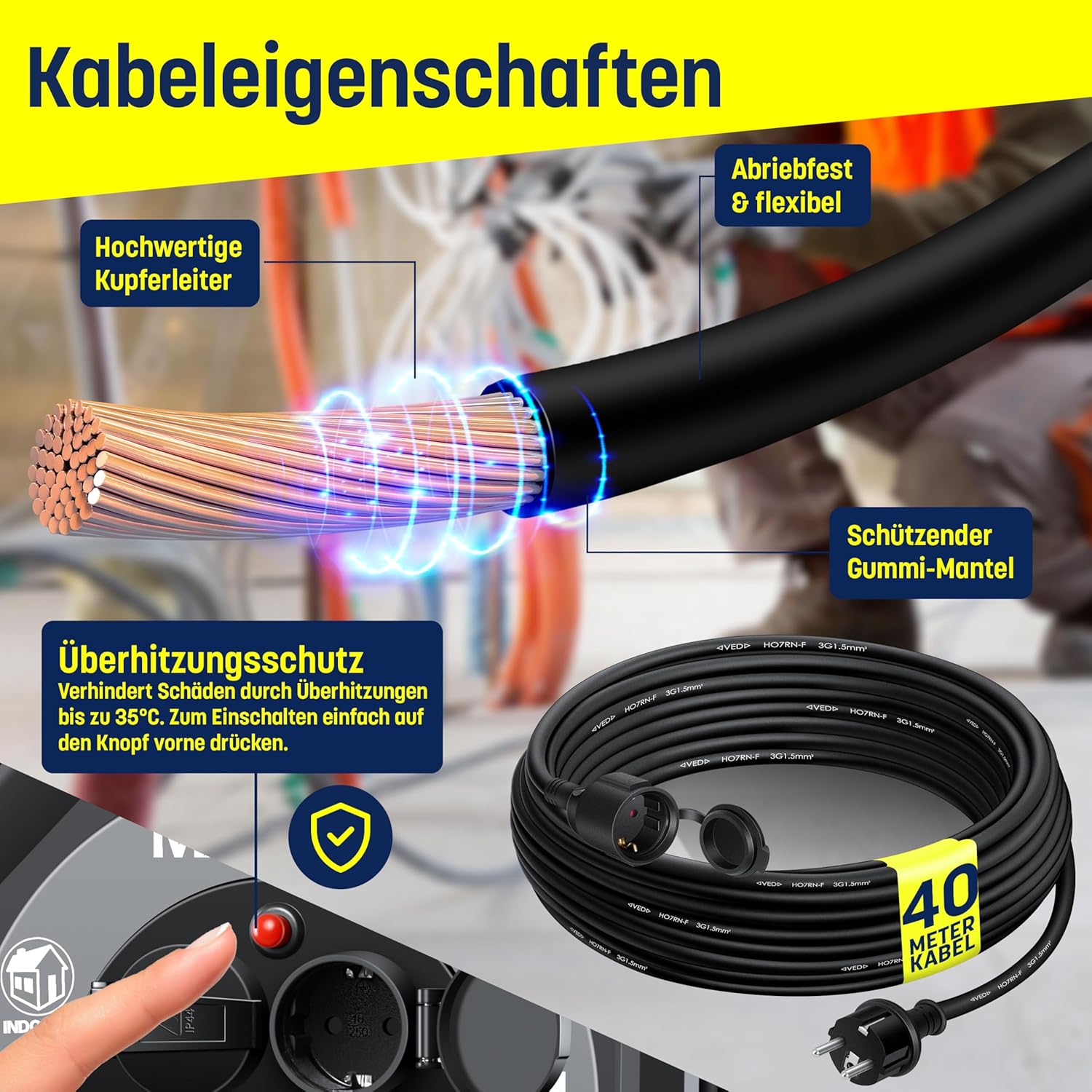 MASKO® Kabelhaspel, 40 m, verlengkabel met geaarde stopcontacten en wikkelgreep, outdoor kabelhaspel thermobescherming, apparaattrommel IP44, 1000 W ~ 3000 W, inclusief draaggreep en